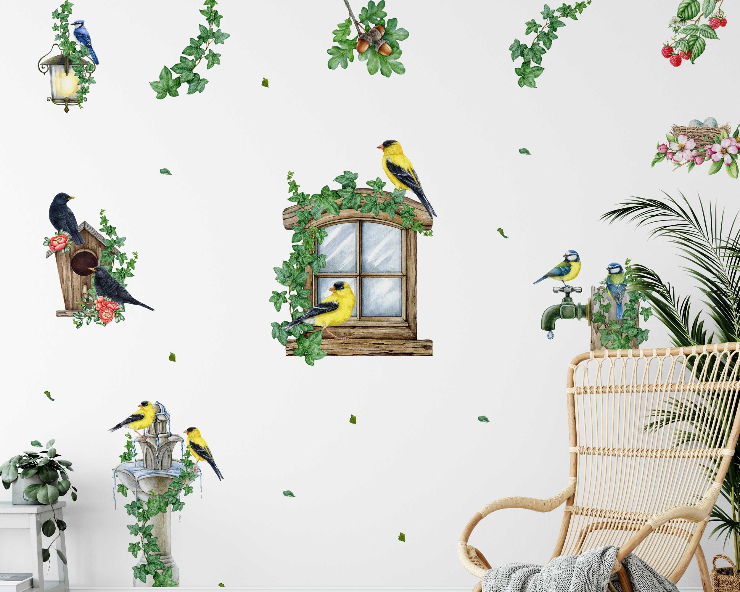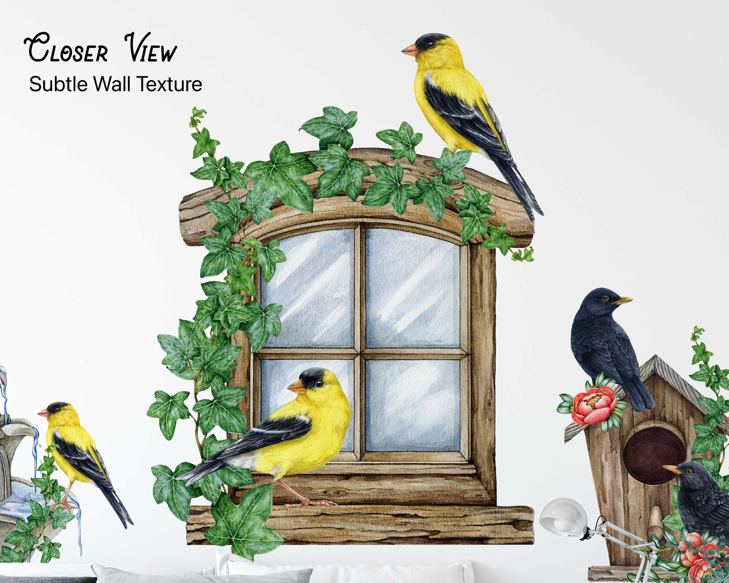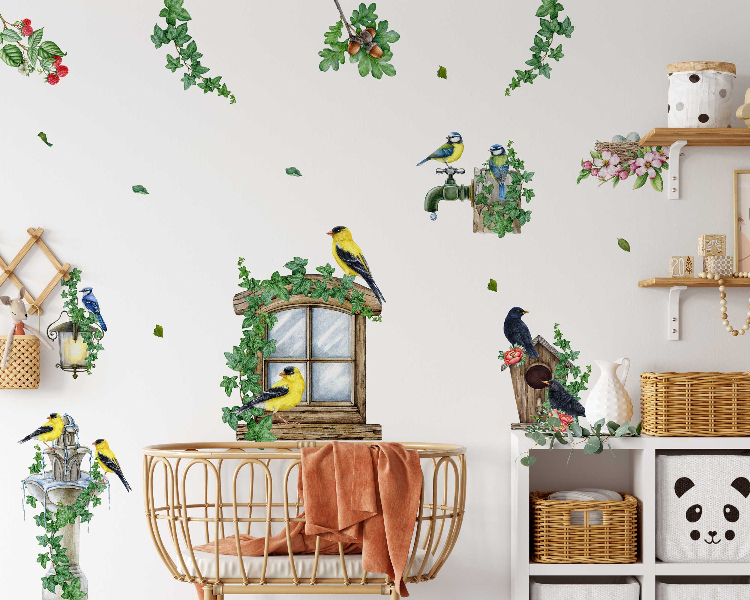 Bring the beauty of nature indoors with our Birds and Nature Wall Stickers. Featuring a whimsical garden window scene with vibrant birds, ivy, birdhouses, and blossoms, these decals add a touch of the outdoors to any nursery, living room, or bedroom. Made from premium fabric with non-toxic inks, these wall stickers are safe for children…