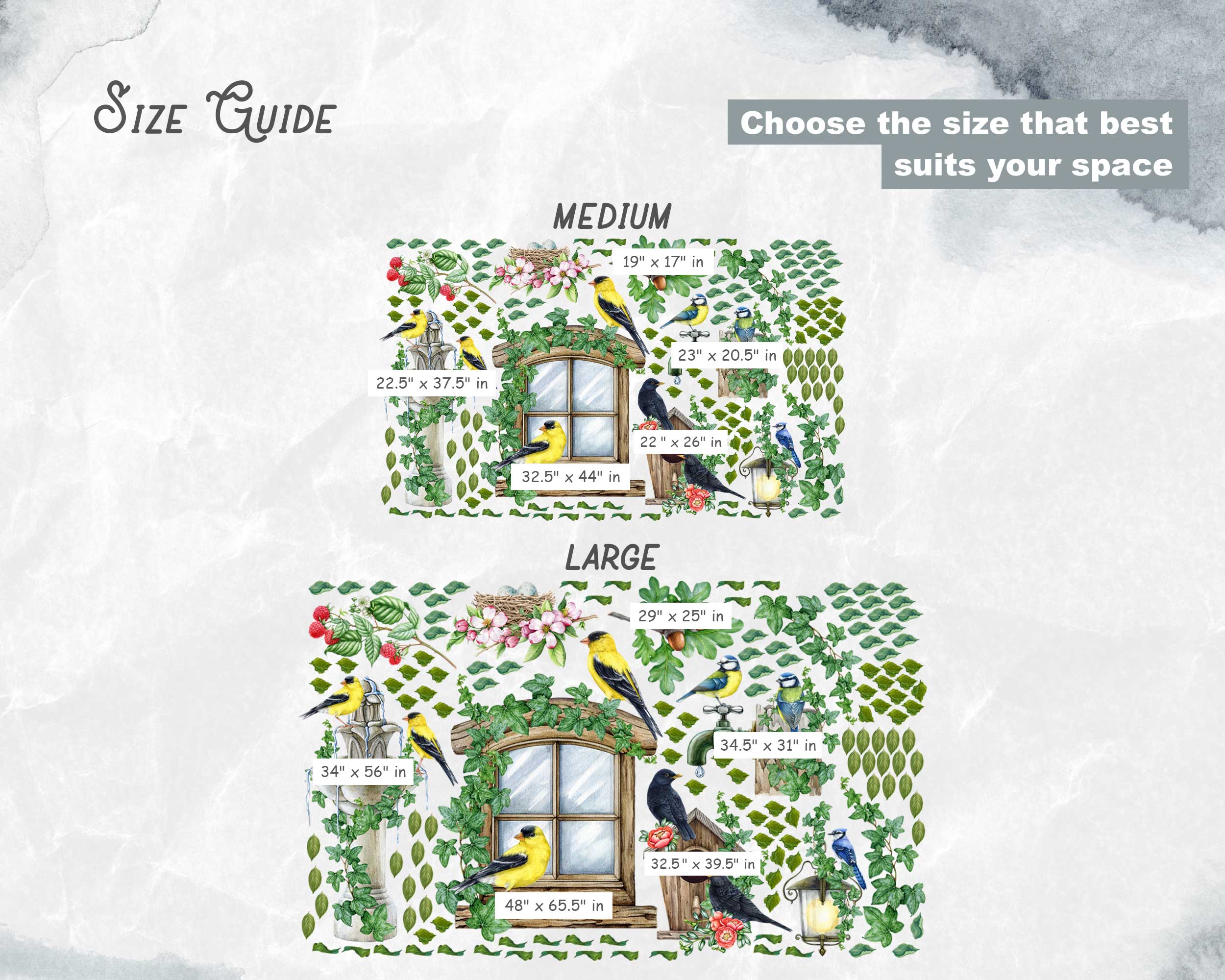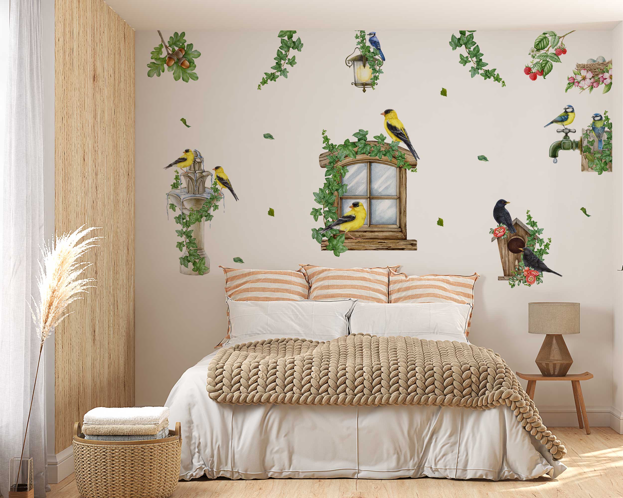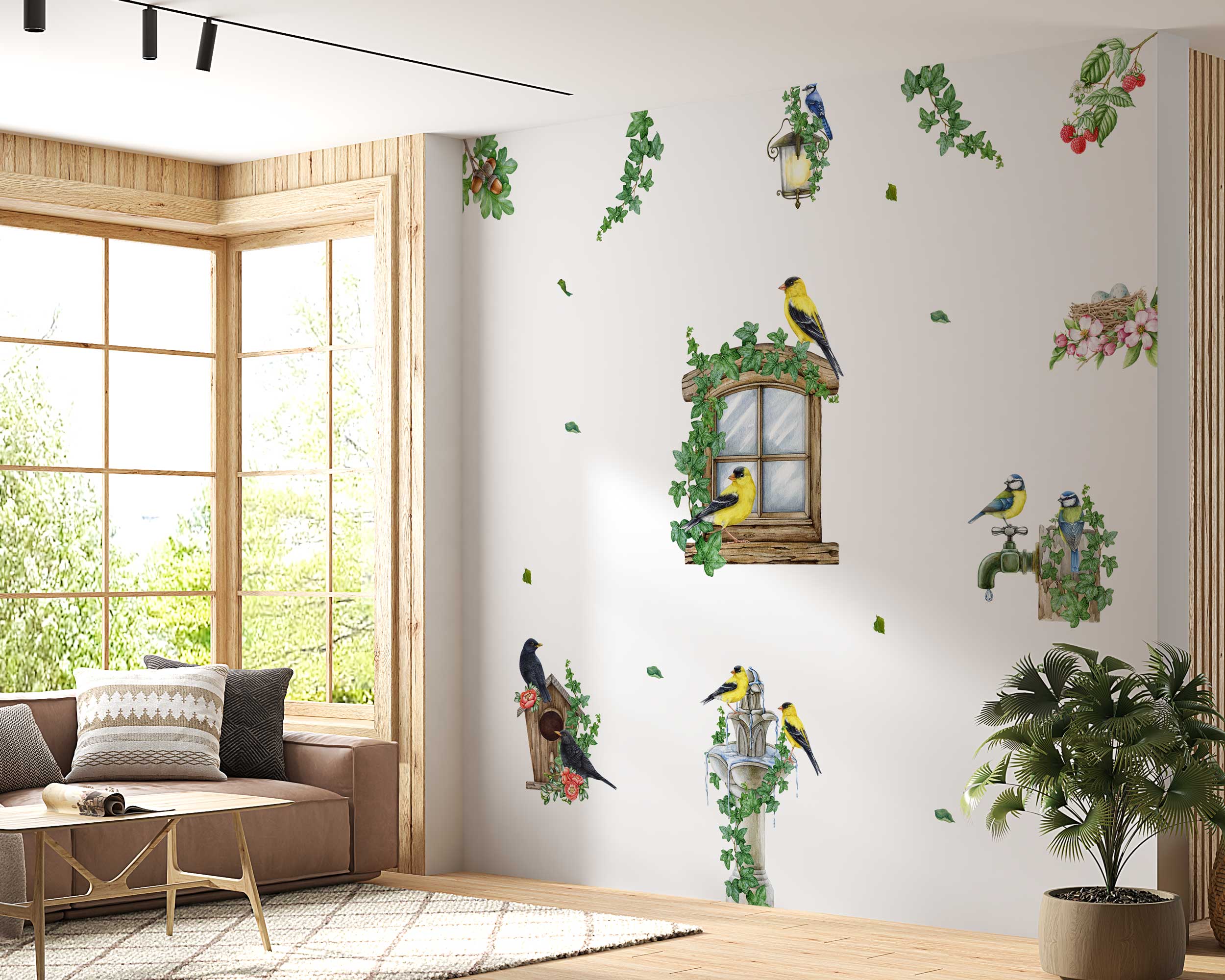 Bring the beauty of nature indoors with our Birds and Nature Wall Stickers. Featuring a whimsical garden window scene with vibrant birds, ivy, birdhouses, and blossoms, these decals add a touch of the outdoors to any nursery, living room, or bedroom. Made from premium fabric with non-toxic inks, these wall stickers are safe for children…
