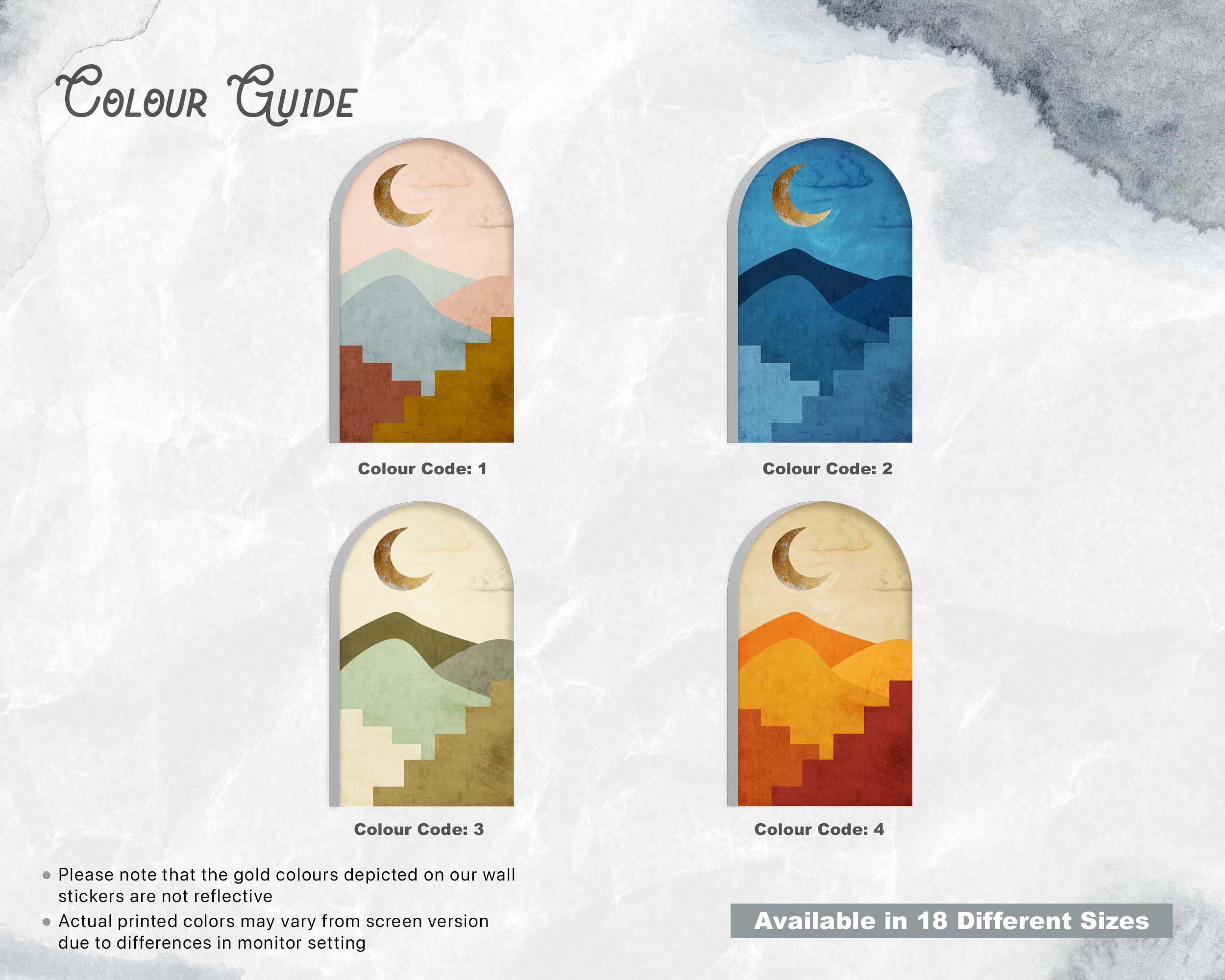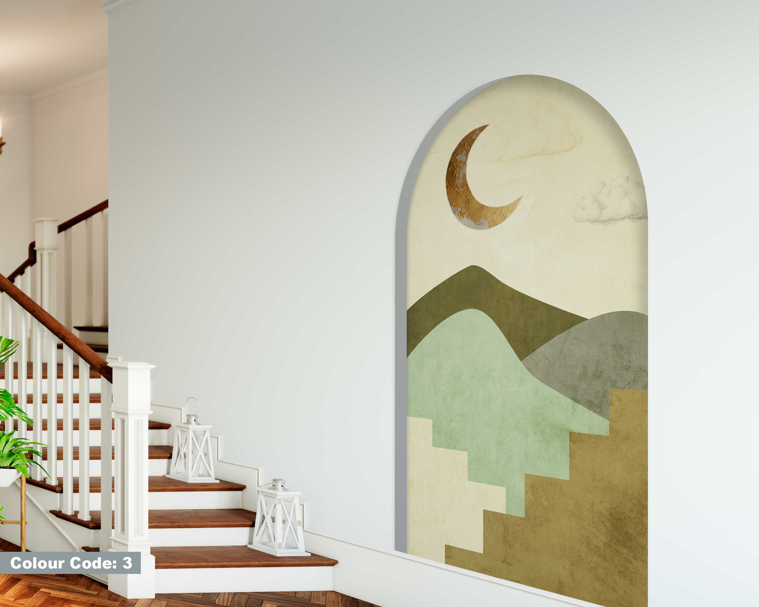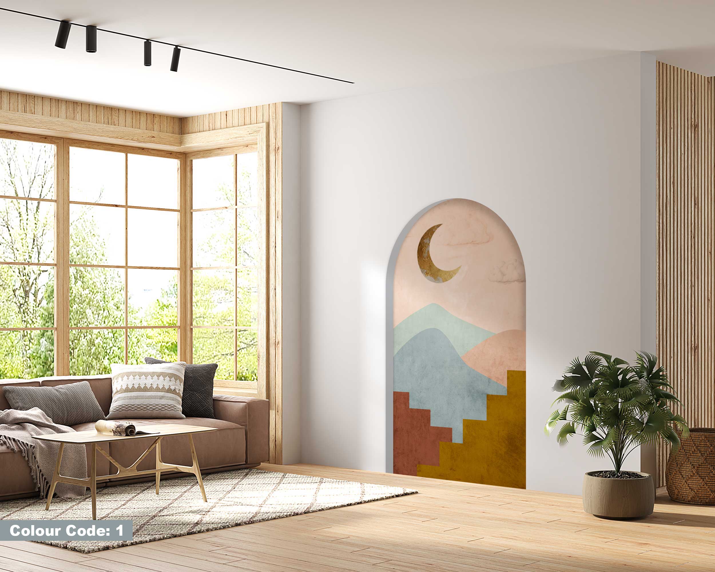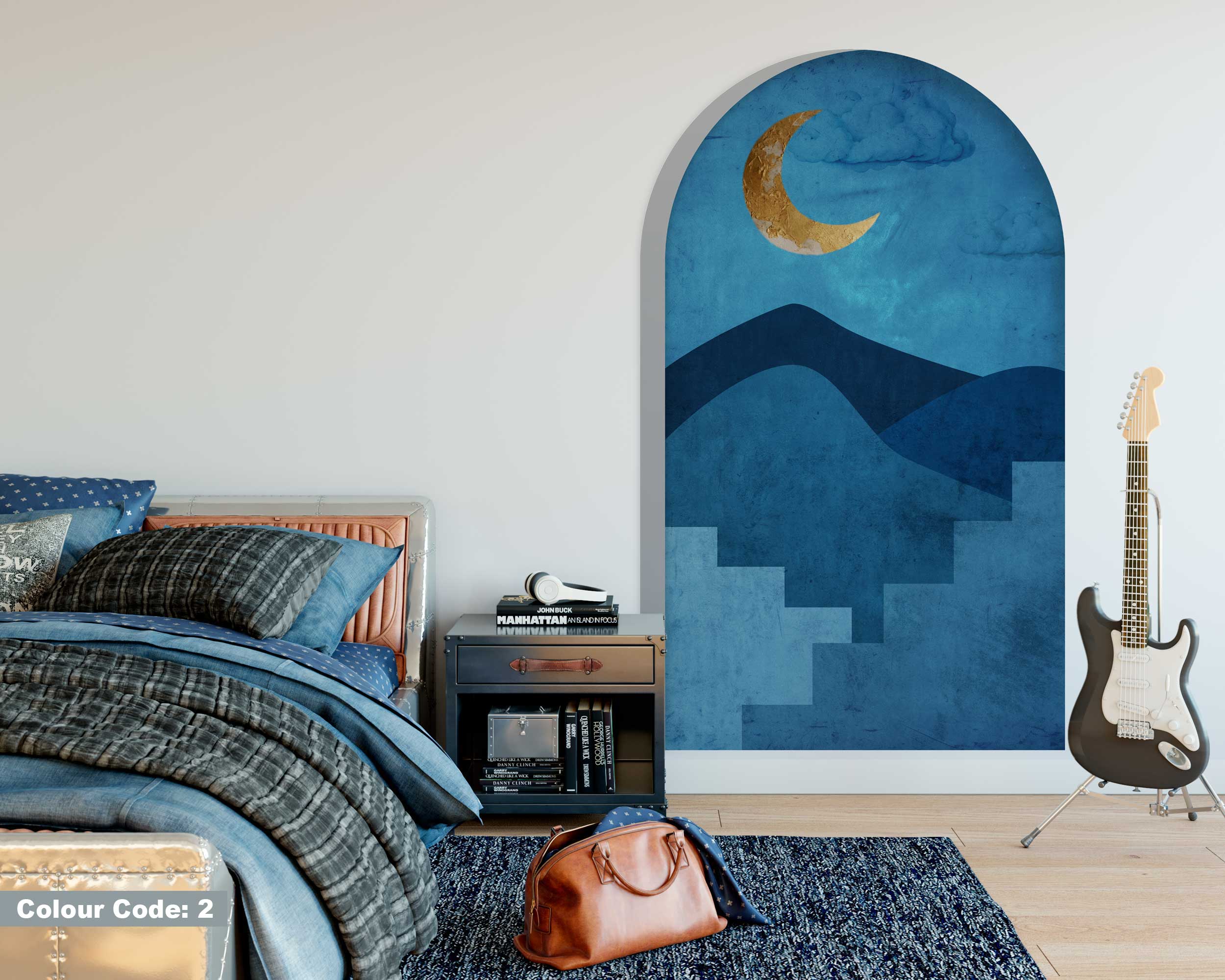 Enhance your interior decor with our Boho Arches Wall Stickers, featuring a captivating moonlit mountain view in a serene blue color. These exquisitely designed decals blend modern elegance with bohemian charm, making them perfect for bedrooms, living rooms, and other interior spaces. Made from premium fabric with non-toxic inks, our wall stickers are easy to apply and reposition, ensuring they are renter-friendly and safe for all ages. The harmonious combination of boho arches and serene natural elements creates a calming and stylish atmosphere in any room.