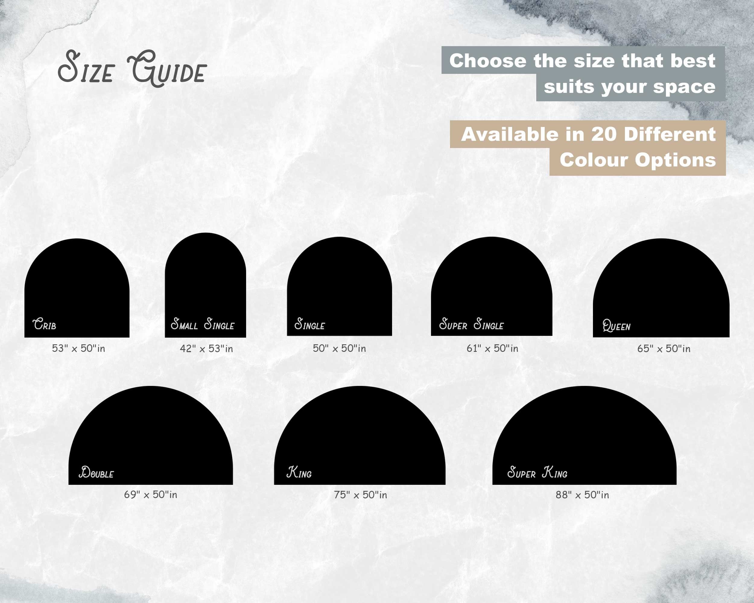 | Size | Crib: 53" x 50" in, Sm. Single:42" x 53", Single Bed:50" x 50", Su. Single:61" x 50", Queen: 65" x 50" in, Double: 69" x 50" in, King Bed: 75" x 50", Super King:88" x 50", 12 w x 24 h inches, 18 w x 24 h inches, 18 w x 34 h inches, 24 w x 30 h inches, 24 w x 50 h inches, 30 w x 36 h inches, 30 w x 56 h inches, 36 w x 48 h inches, 36 w x 60 h inches, 36 w x 72 h inches, 36 w x 94 h inches, 42 w x 72 h inches, 48 w x 94 h inches |
