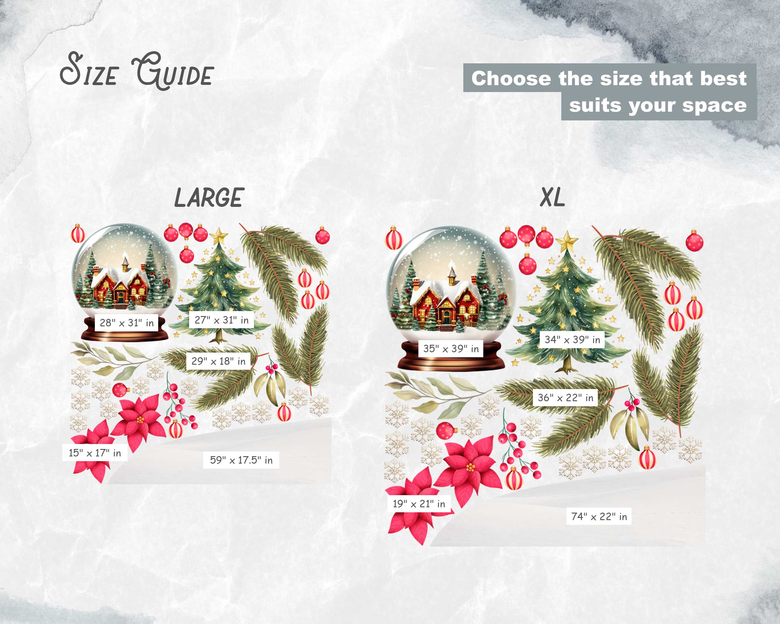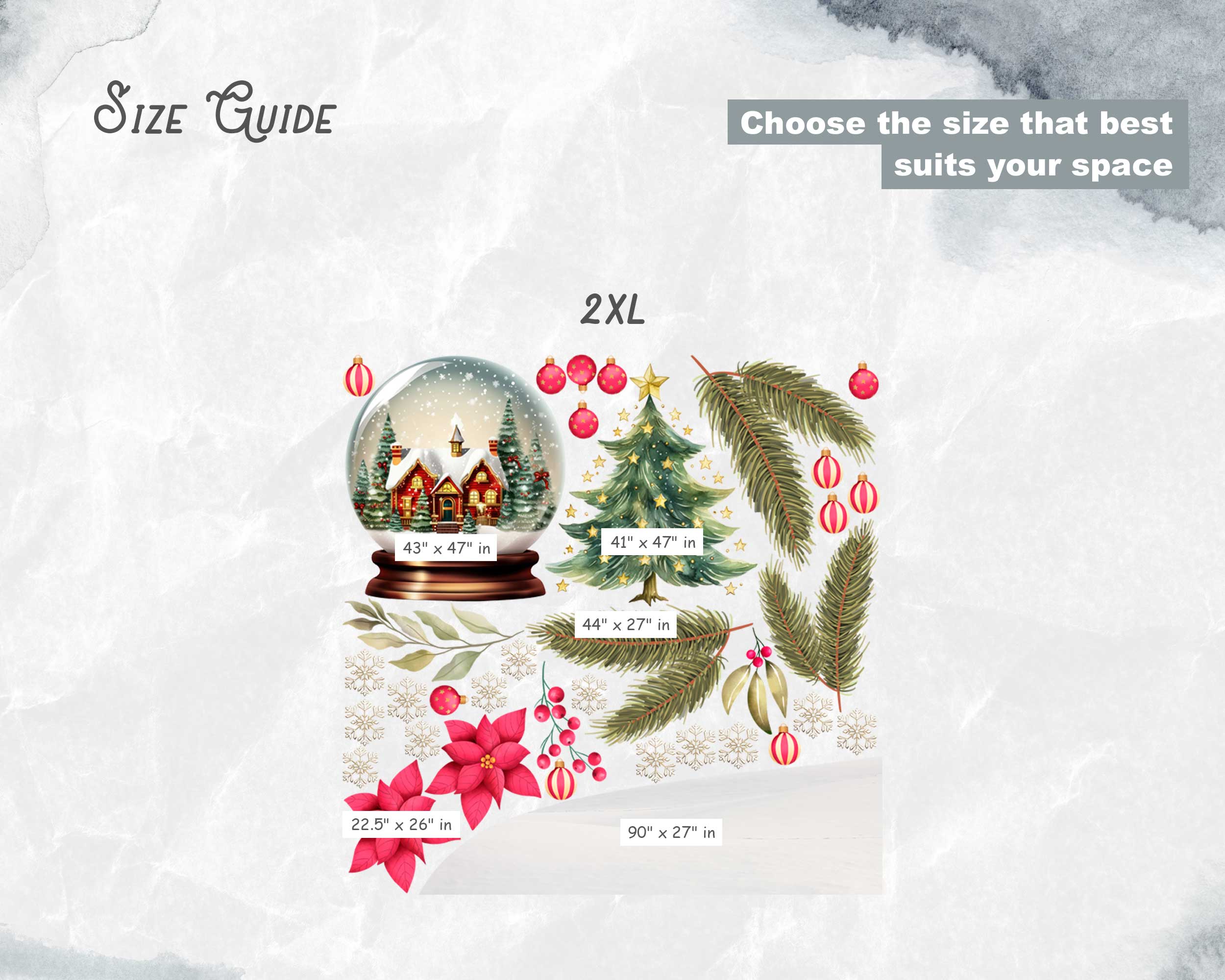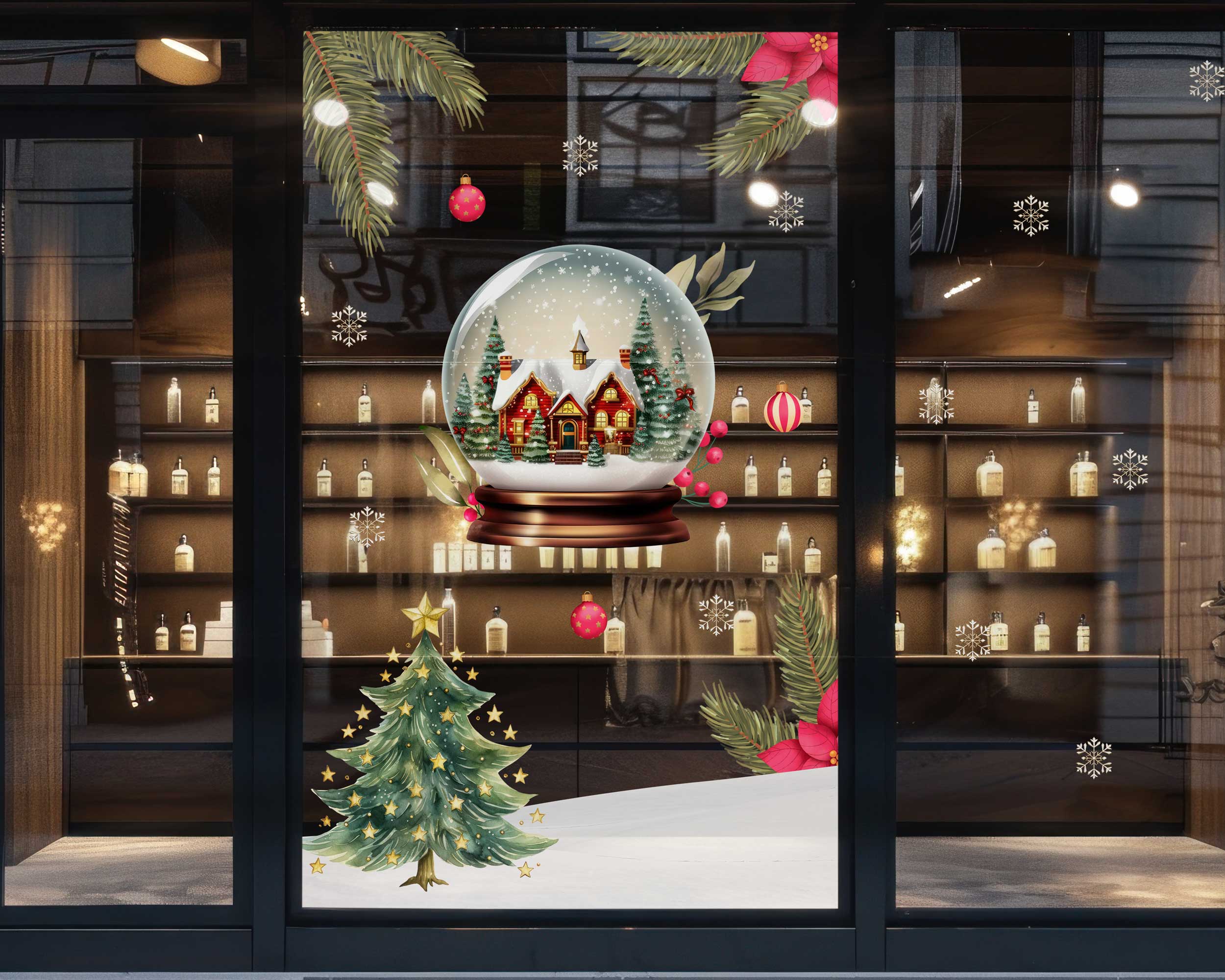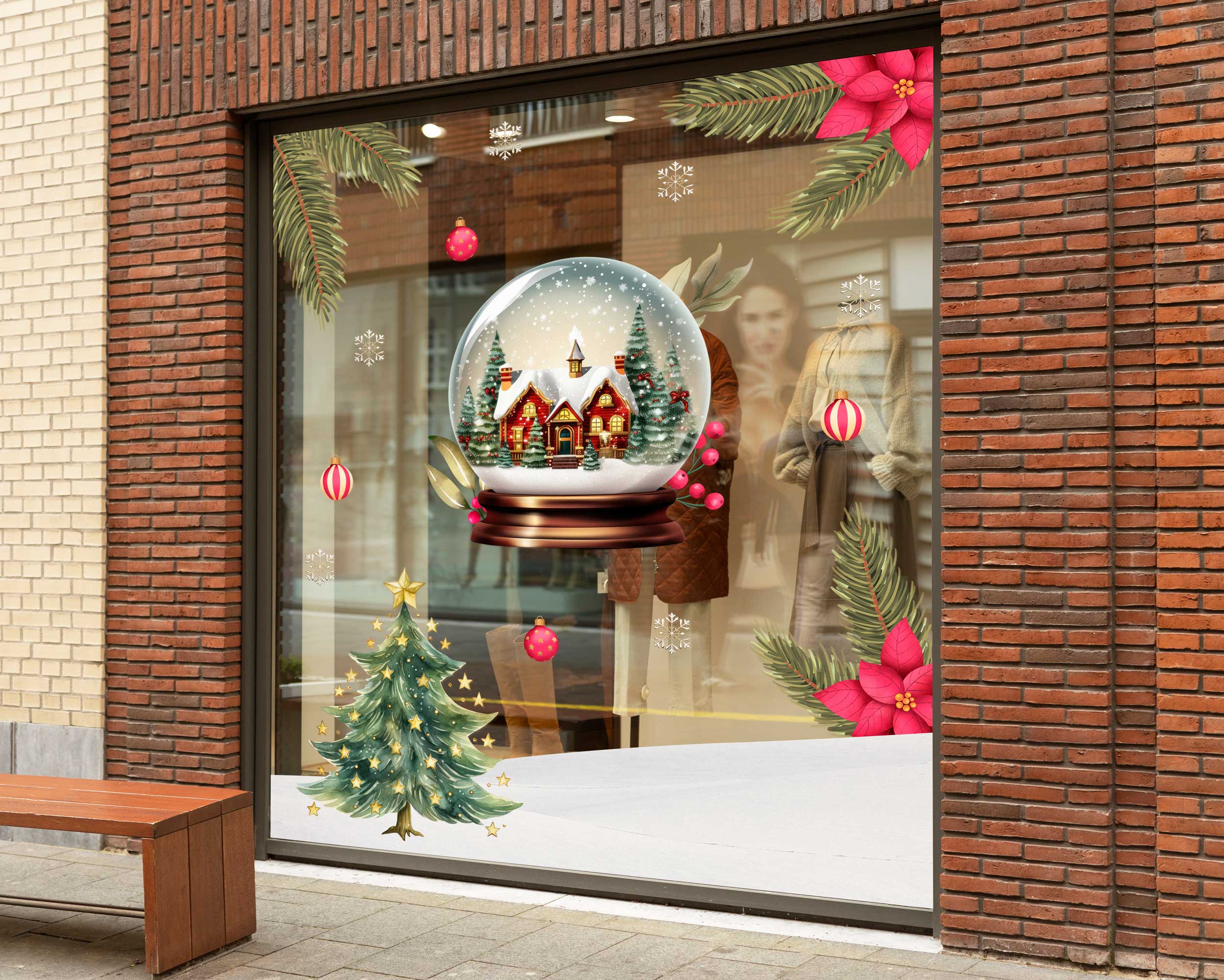 Bring a magical holiday touch to your storefront with these stunning Christmas Window Decals. Featuring a snow globe with a cozy winter scene, a decorated Christmas tree, snowflakes, ornaments, and poinsettia accents, these decals are perfect for festive displays.