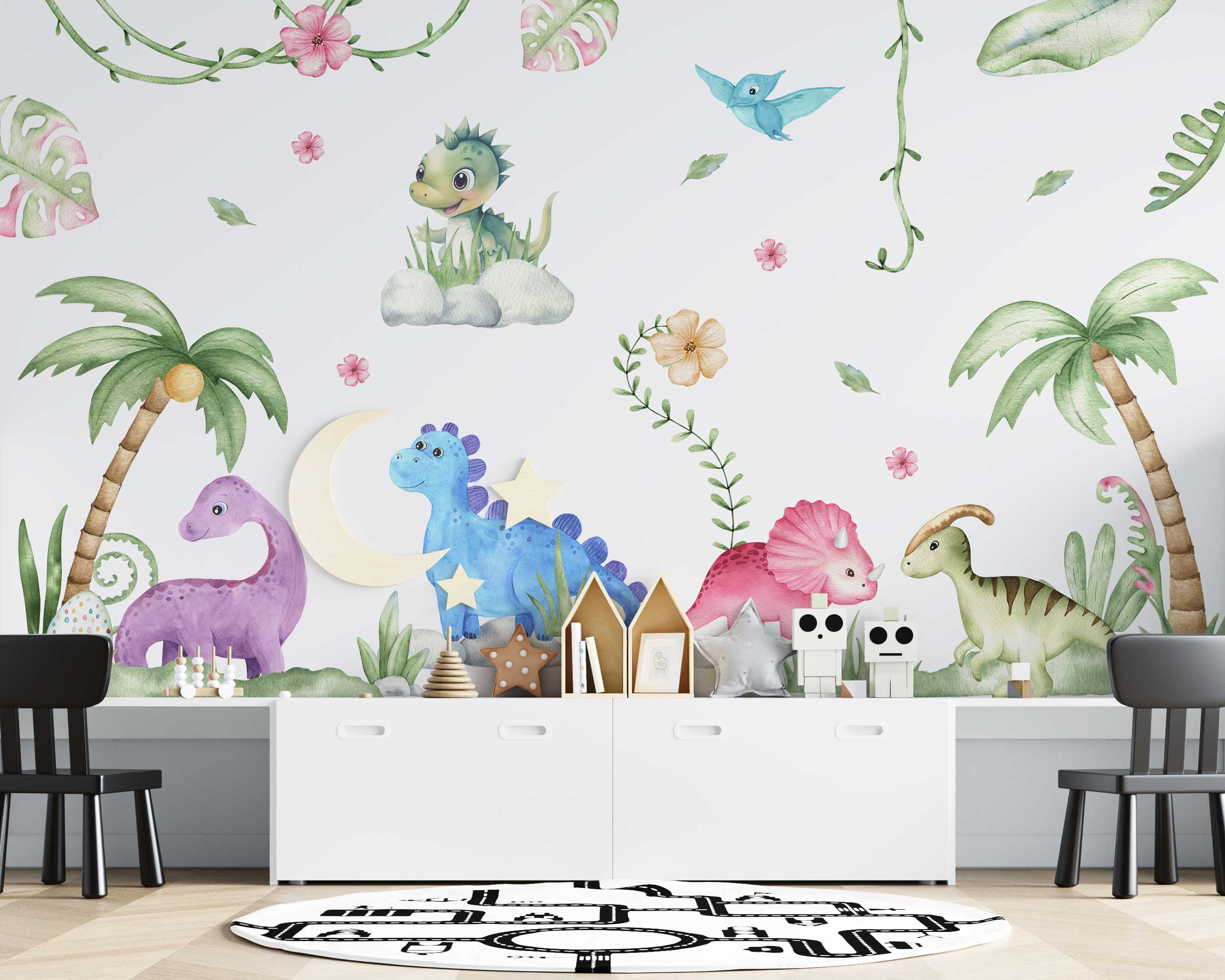 Transform your child’s room into a prehistoric paradise with our Colorful Dinosaur Wall Stickers. Designed with vibrant hues and playful illustrations, these jungle-themed decals are perfect for nurseries, playrooms, and bedrooms. Featuring a variety of friendly dinosaurs in shades of purple, blue, green, and pink, each sticker brings a touch of adventure to your child’s space.