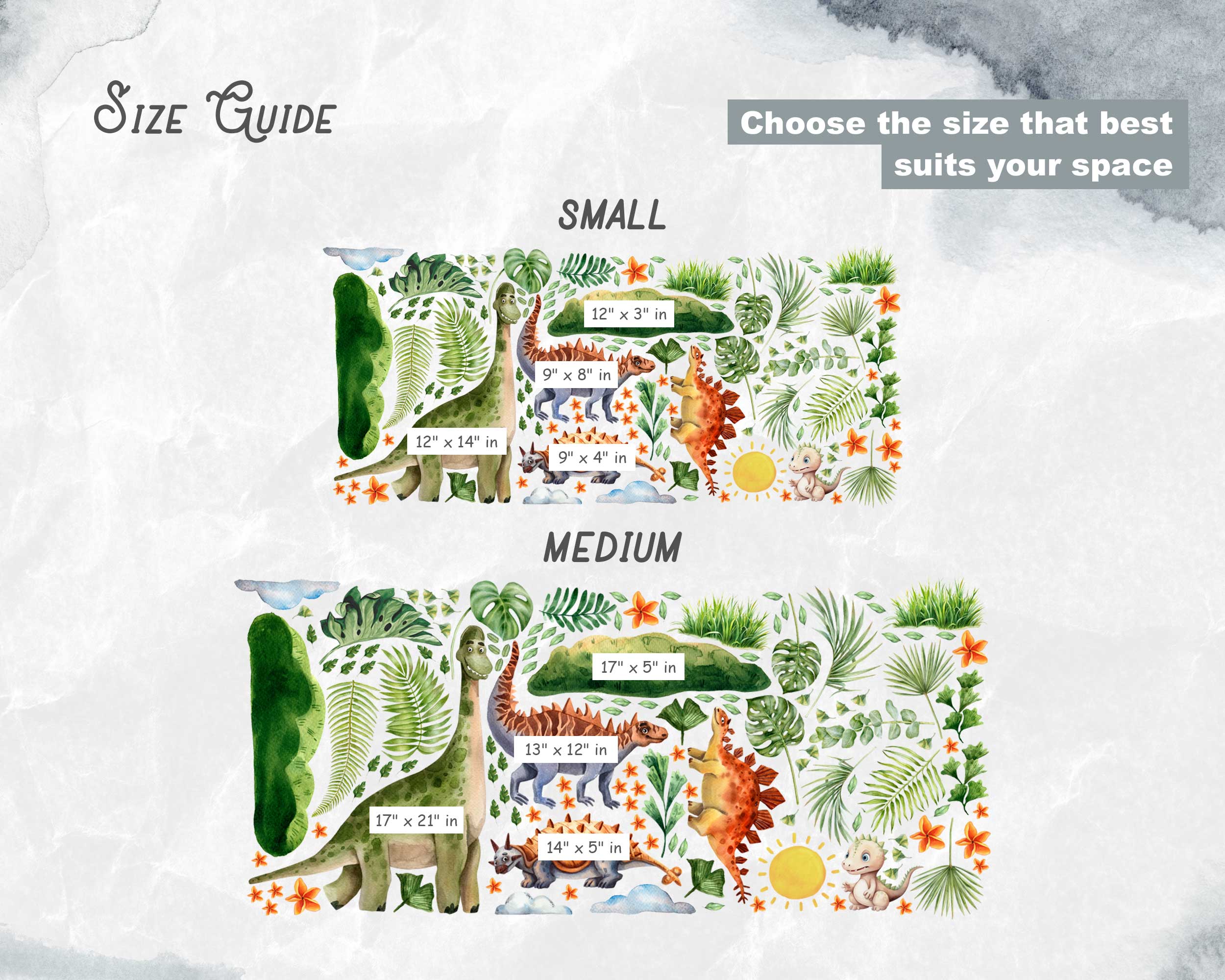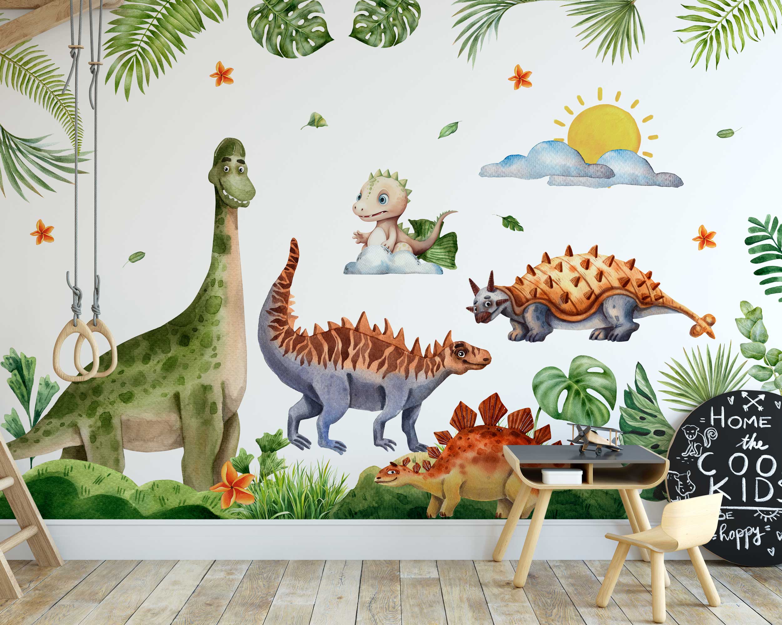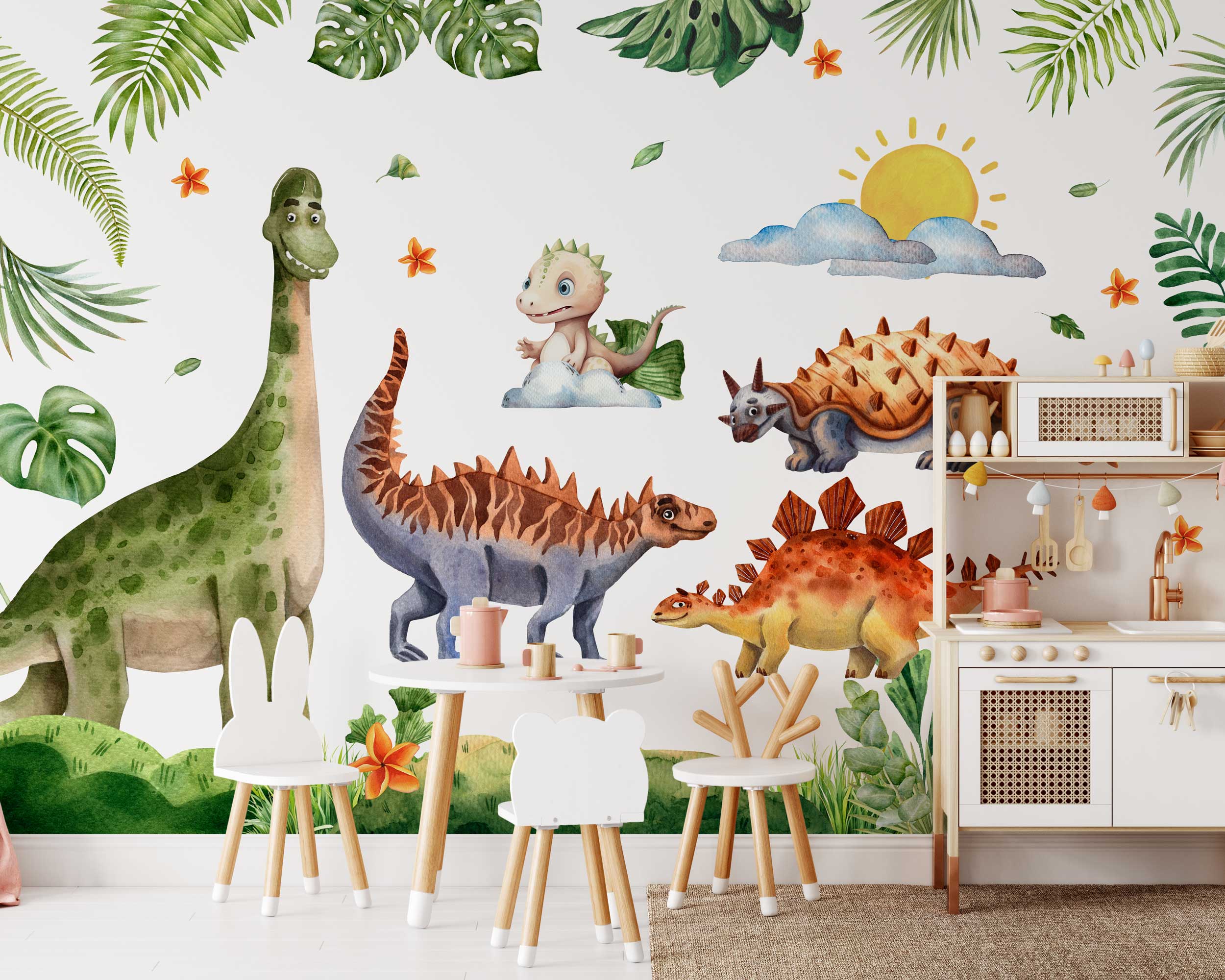 Bring the prehistoric jungle to life in your child’s room with our vibrant dinosaur wall stickers featuring a friendly sun and lush greenery. These colorful and playful wall decals are perfect for nurseries, playrooms, or kids’ bedrooms, creating a fun and imaginative atmosphere. The design includes a variety of dinosaurs, tropical leaves, and a smiling sun, making it an ideal décor choice for young adventurers.
