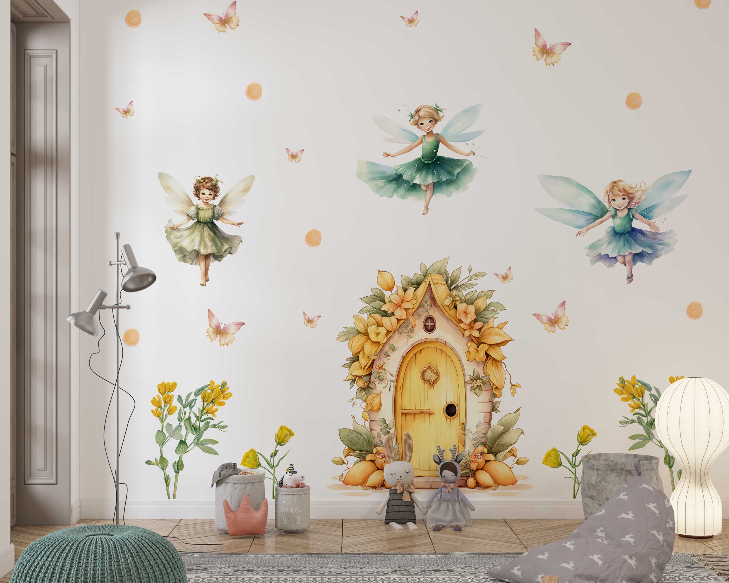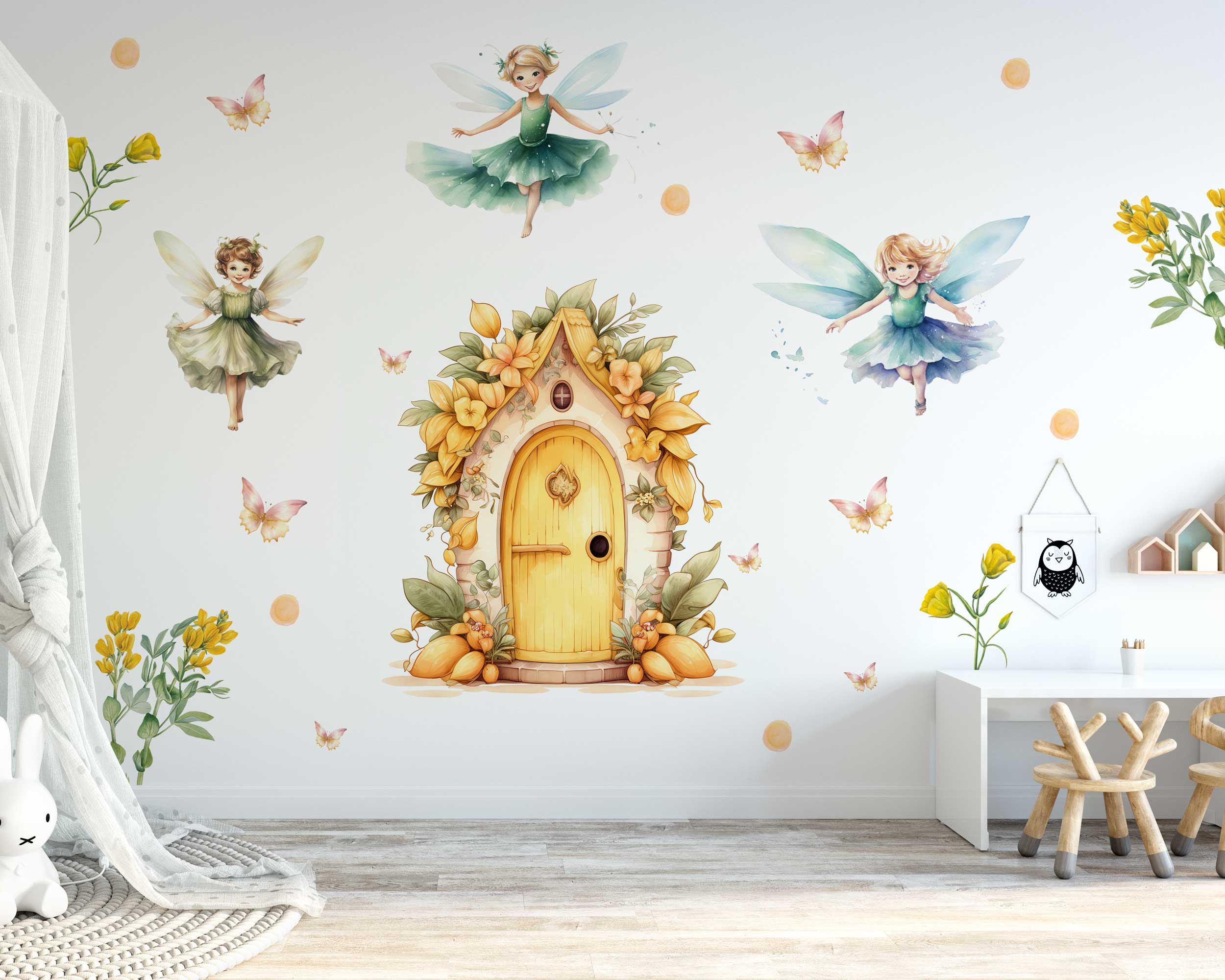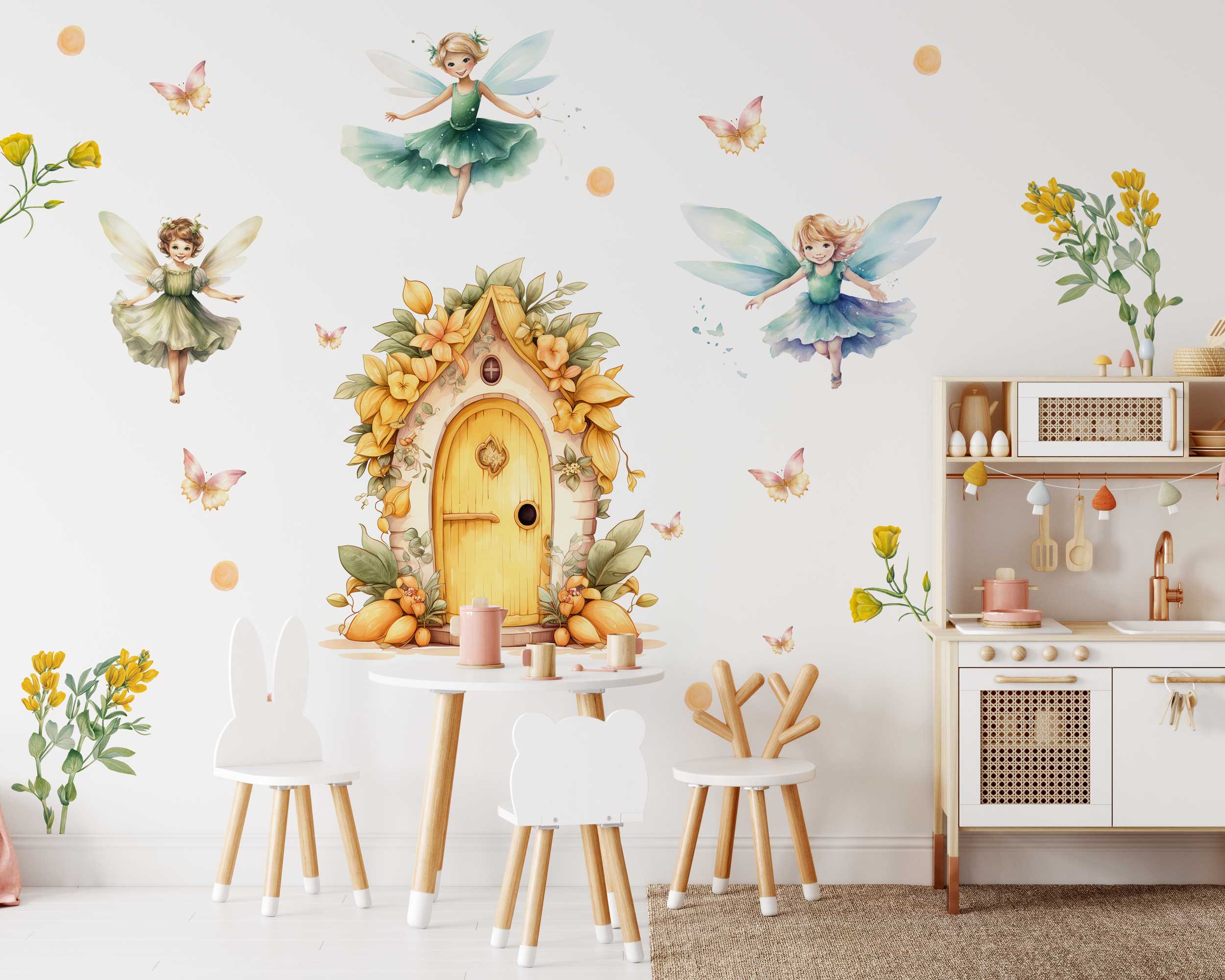 Transform your child’s room into a magical fairy tale world with this charming Yellow Fairy House Wall Sticker Set. Featuring a whimsical fairy home adorned with bright yellow flowers, fluttering butterflies, and playful fairies, this wall decal brings a touch of enchantment to any nursery or kids’ room. The soft pastel colors and intricate details create a warm and inviting atmosphere, making it the perfect choice for creating a fairy tale-inspired space that will spark your child’s imagination.