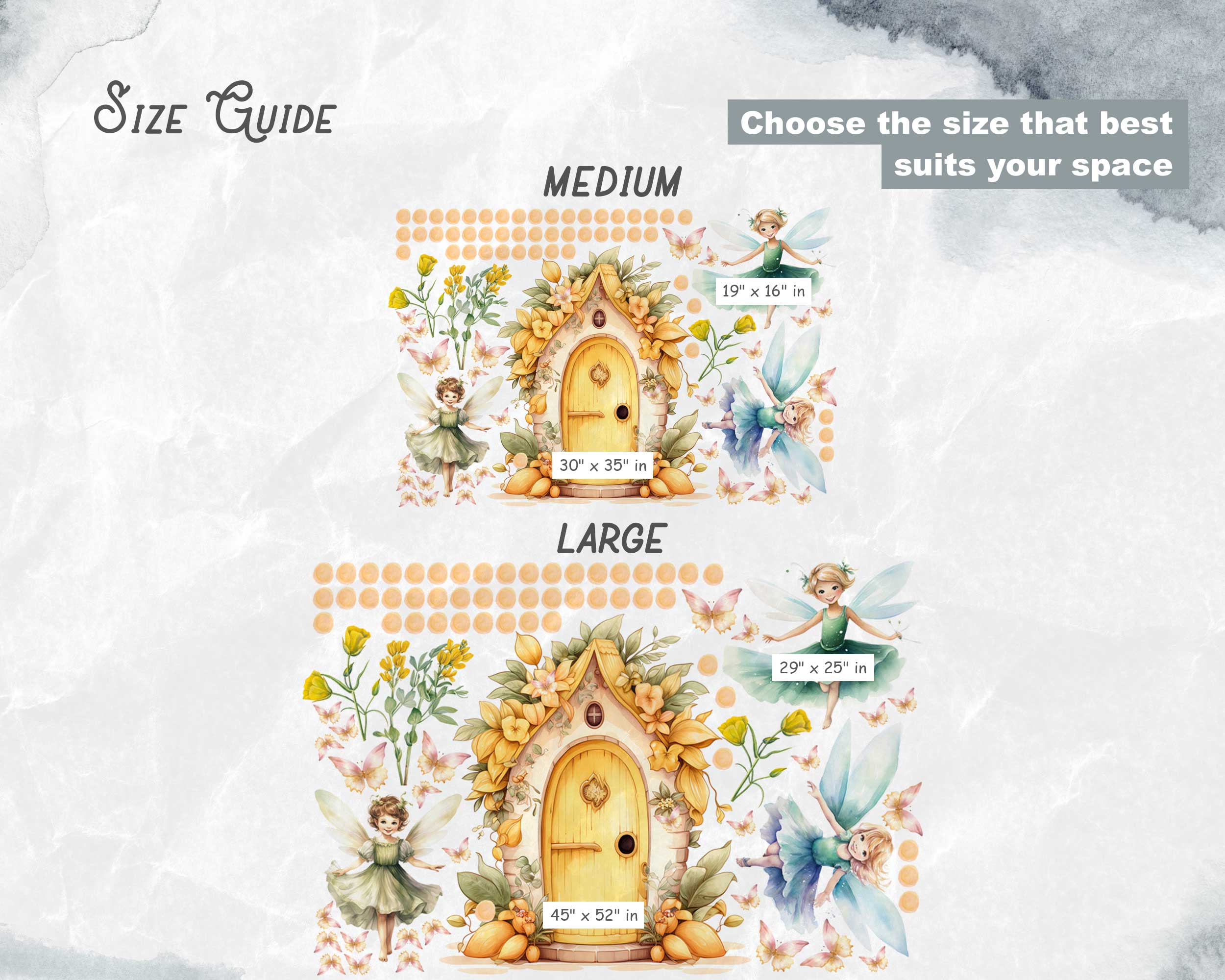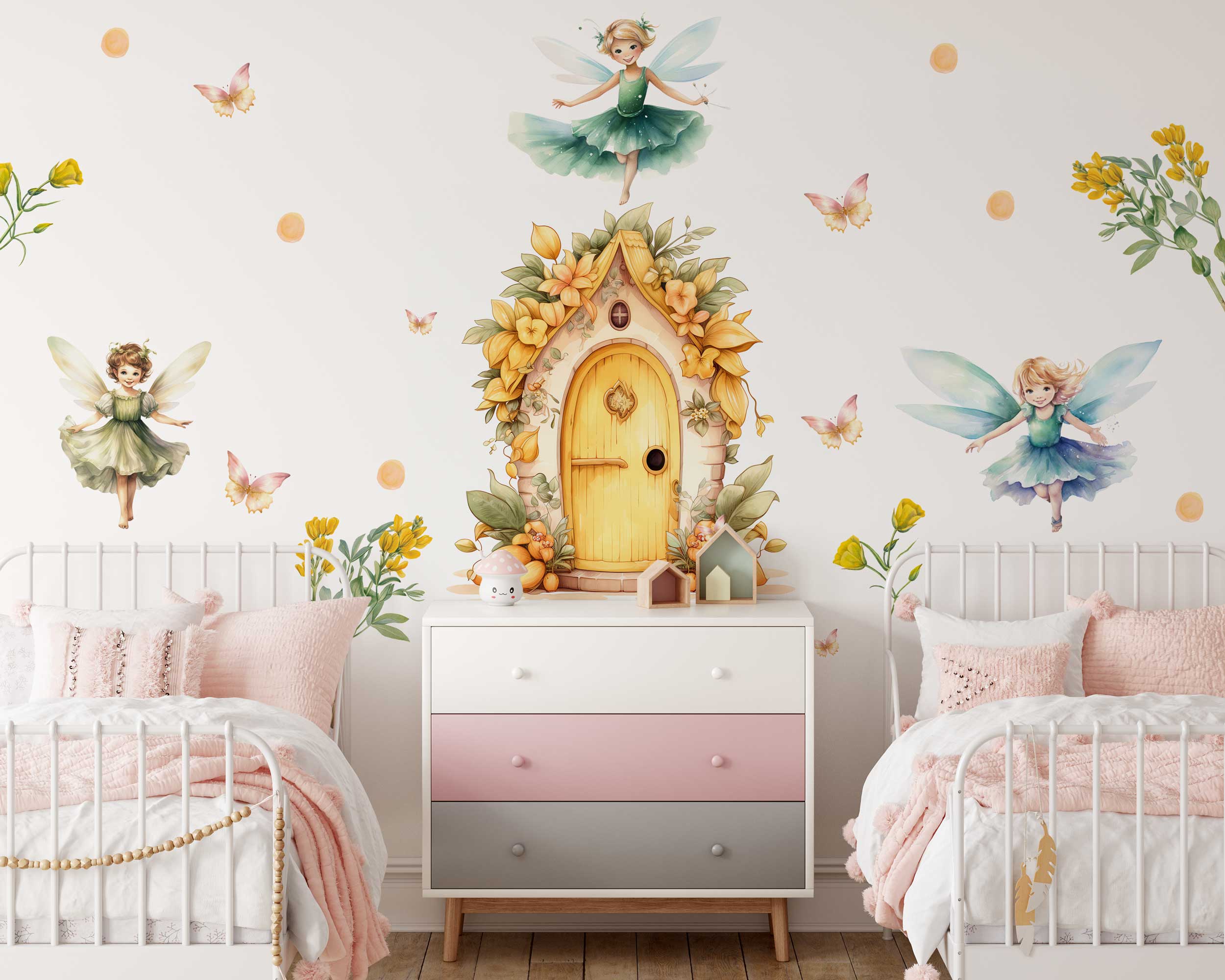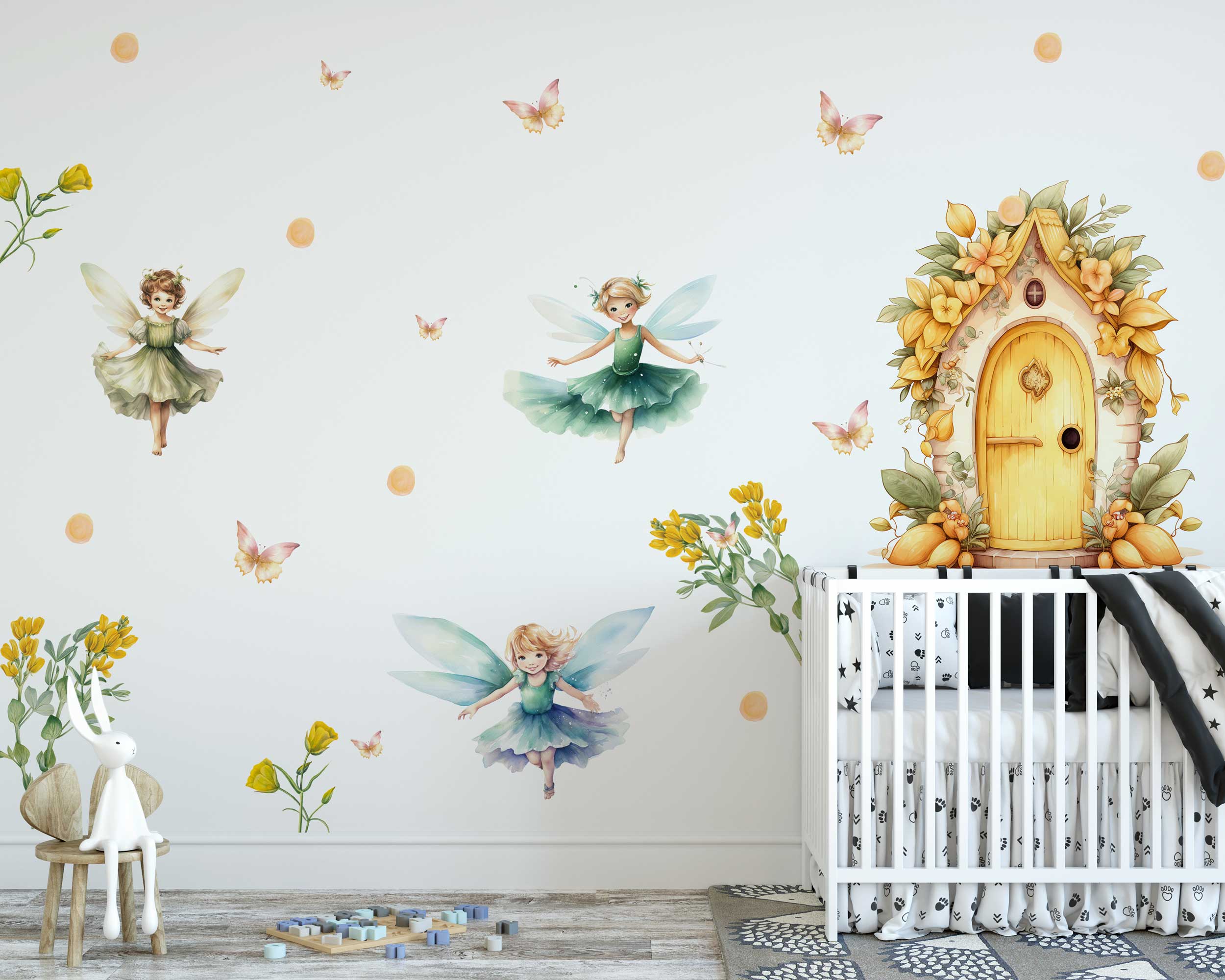 Transform your child’s room into a magical fairy tale world with this charming Yellow Fairy House Wall Sticker Set. Featuring a whimsical fairy home adorned with bright yellow flowers, fluttering butterflies, and playful fairies, this wall decal brings a touch of enchantment to any nursery or kids’ room. The soft pastel colors and intricate details create a warm and inviting atmosphere, making it the perfect choice for creating a fairy tale-inspired space that will spark your child’s imagination.