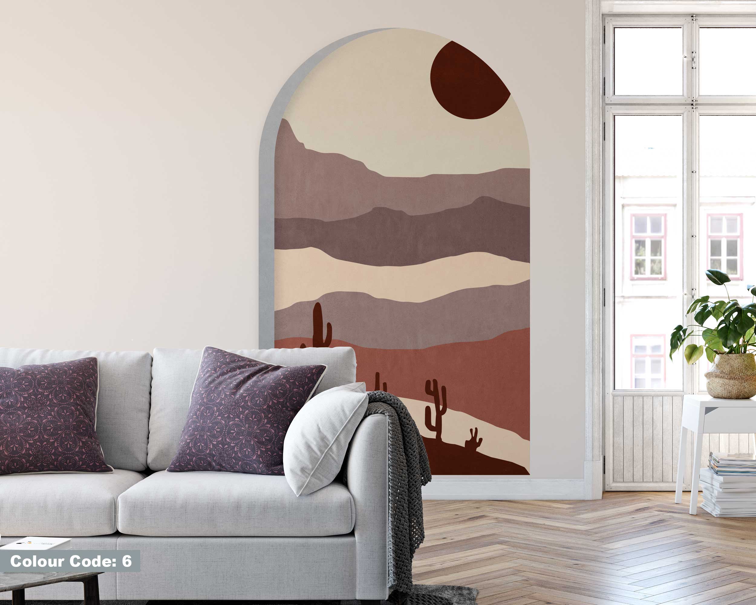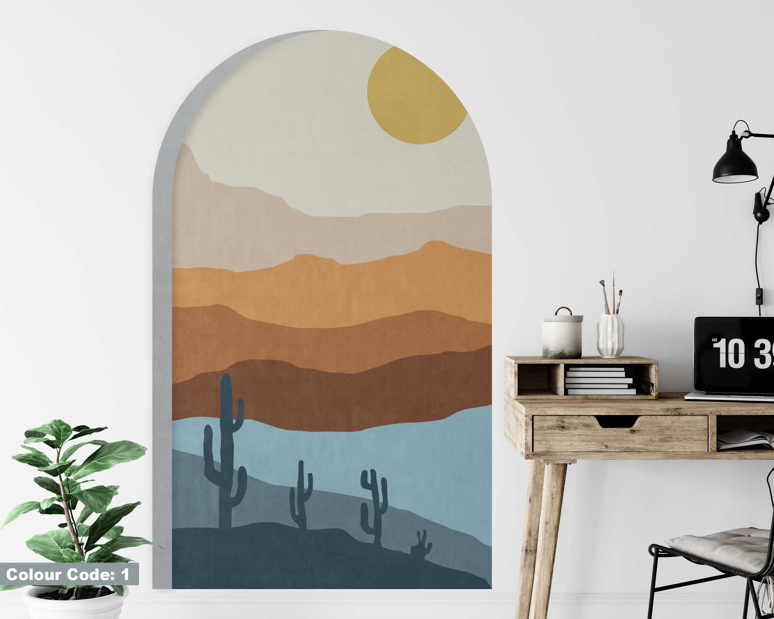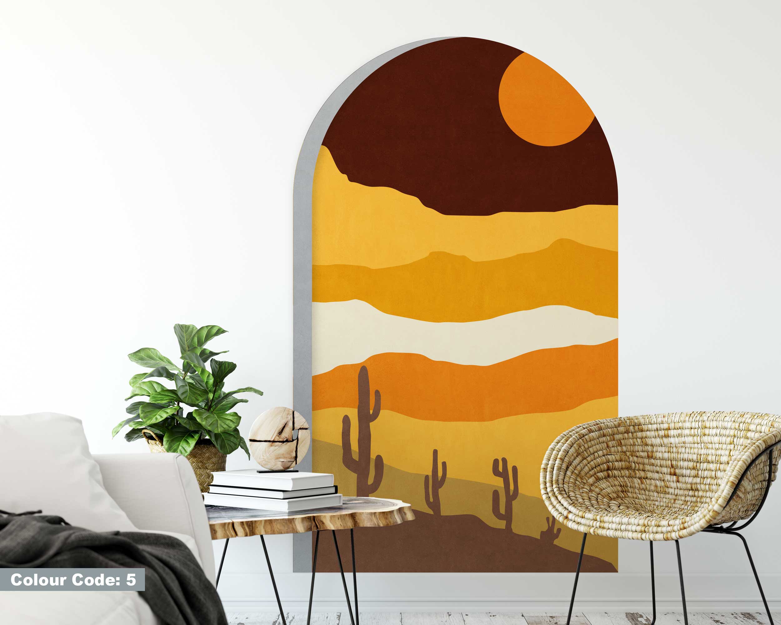Elevate your home decor with the serene beauty of our Large Arch Sunrise Boho Watercolor Wall Stickers. This captivating design features a majestic mountain landscape under the soft hues of a sunrise, all enclosed within an elegant arch. It’s perfect for creating a peaceful and inspiring atmosphere in any room, particularly suited for living rooms and bedrooms.