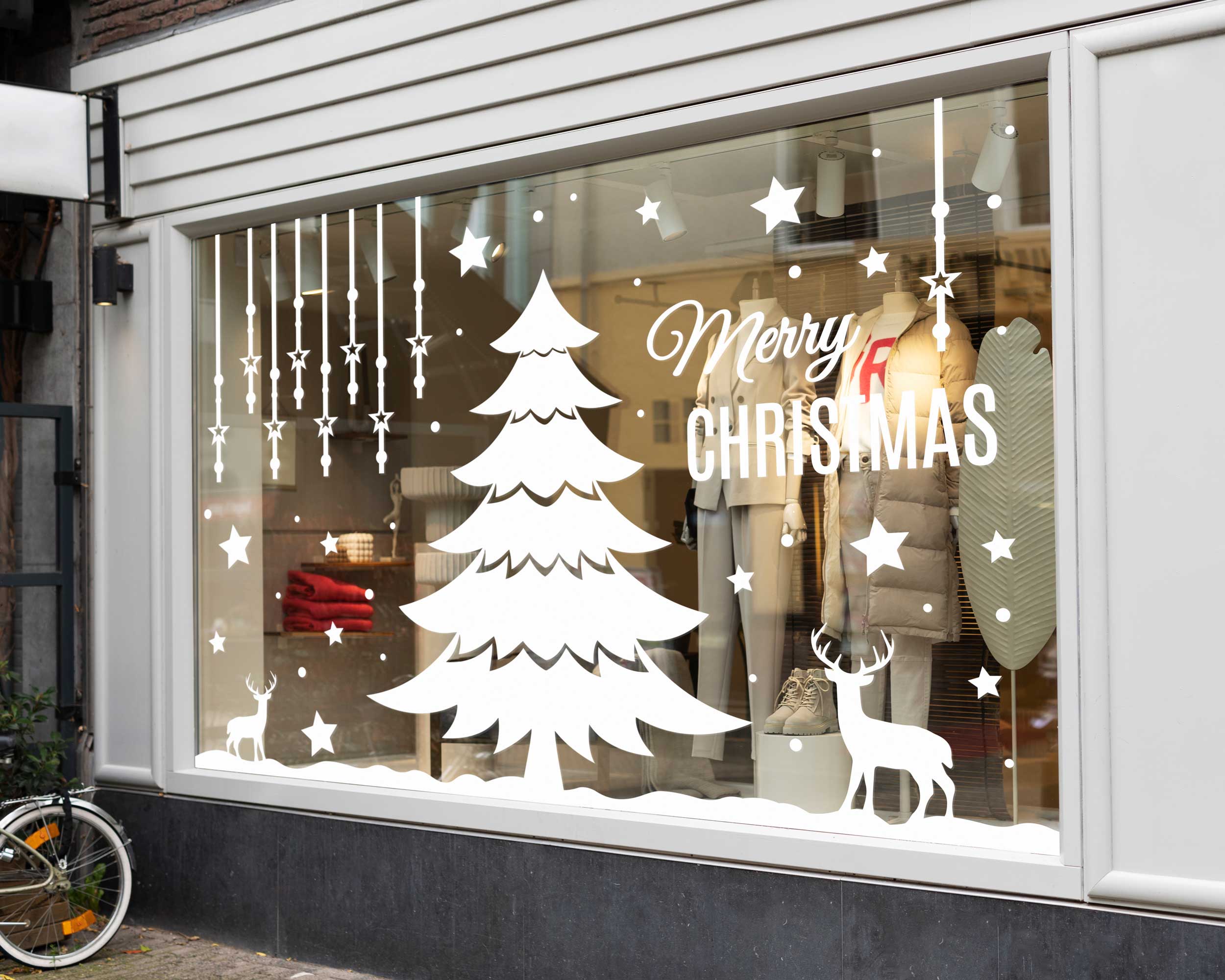 Transform your storefront into a winter wonderland with these Merry Christmas Window Decals featuring a majestic Christmas tree, elegant reindeer, hanging stars, and snowflakes. Crafted from premium white vinyl, these decals add festive charm to any shop window.