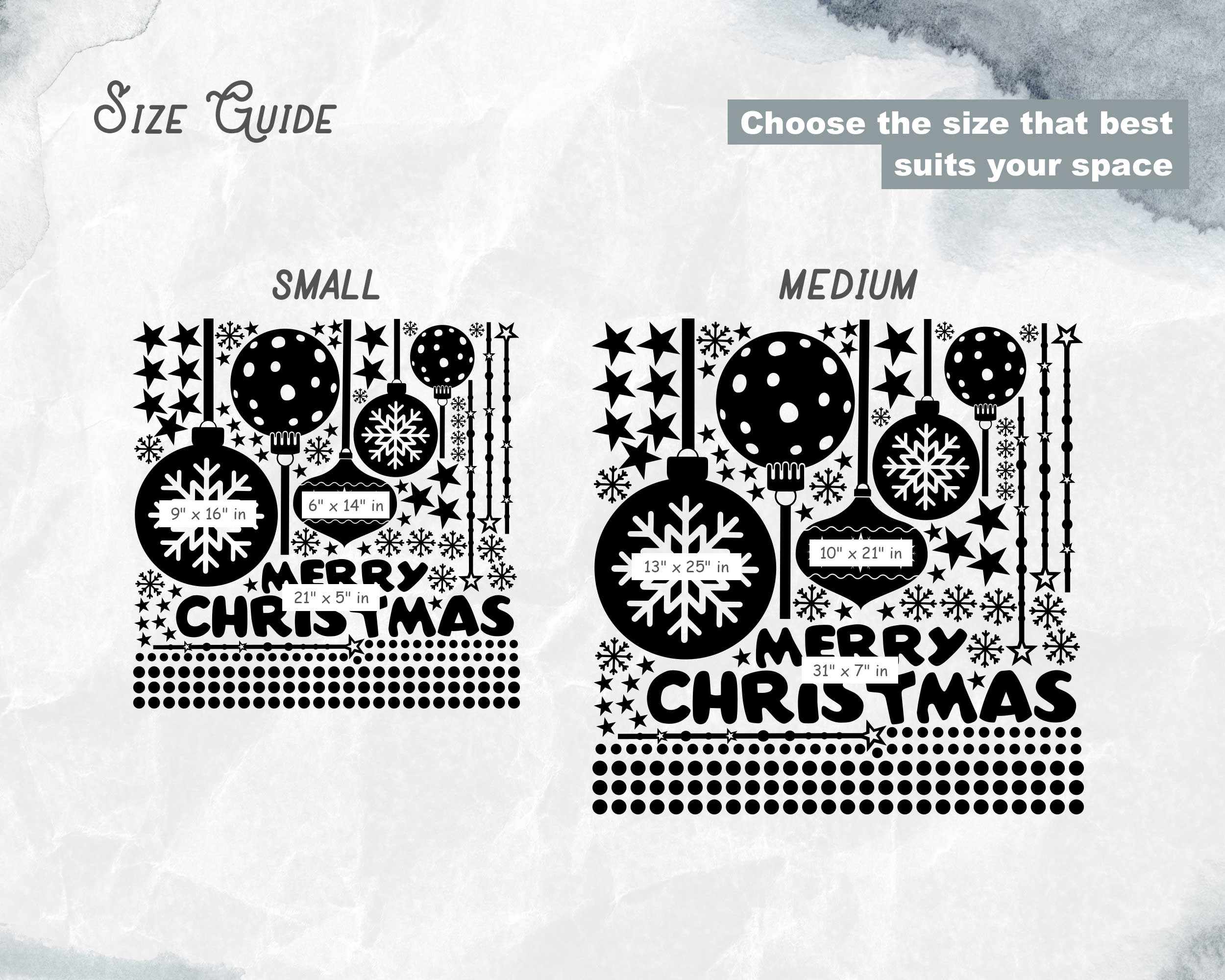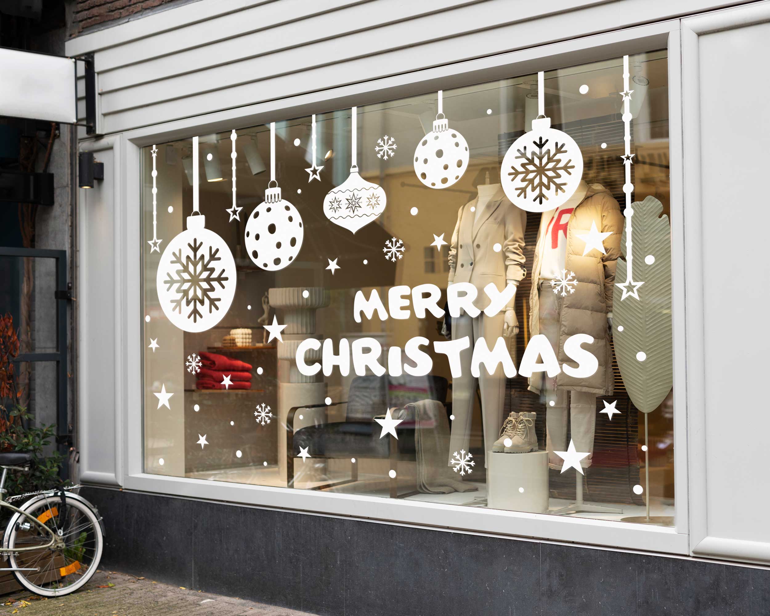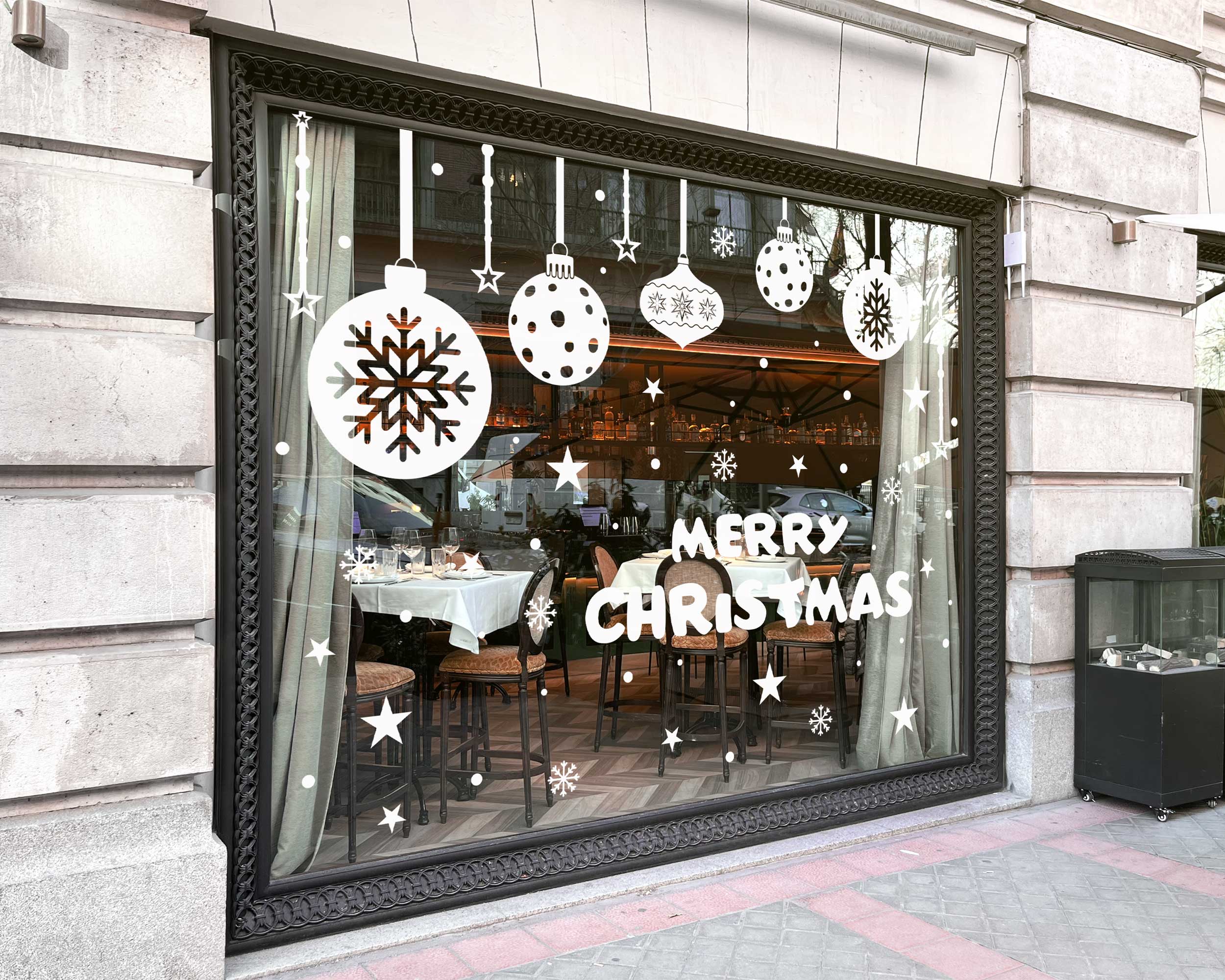 Perfect for retail shops, boutiques, or restaurants, these decals will elevate your holiday decor. The playful mix of hanging ornaments, snowflakes, and bold Merry Christmas text creates an eye-catching display that attracts customers and spreads holiday cheer.