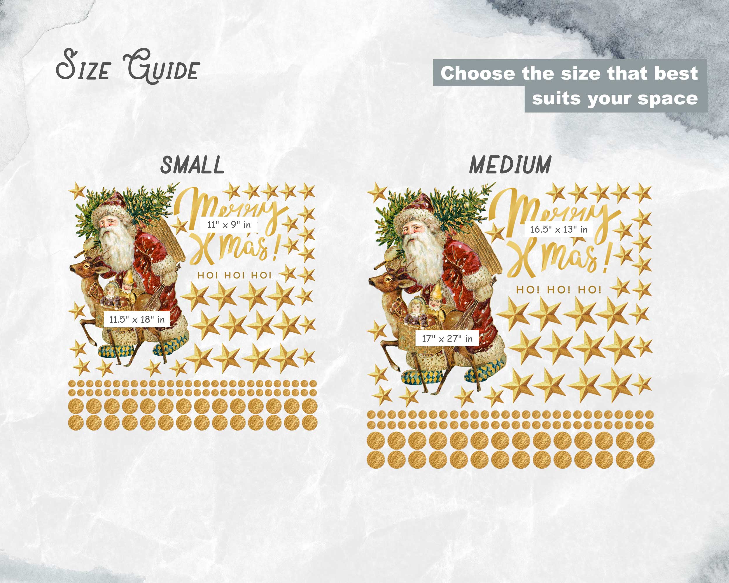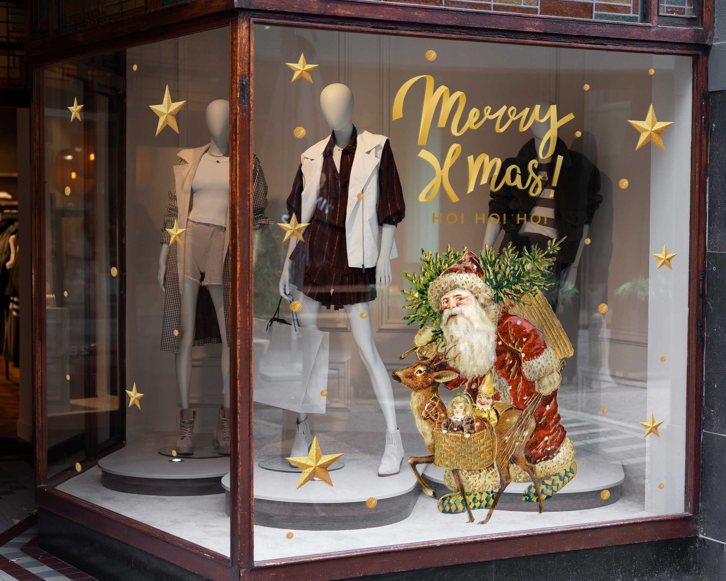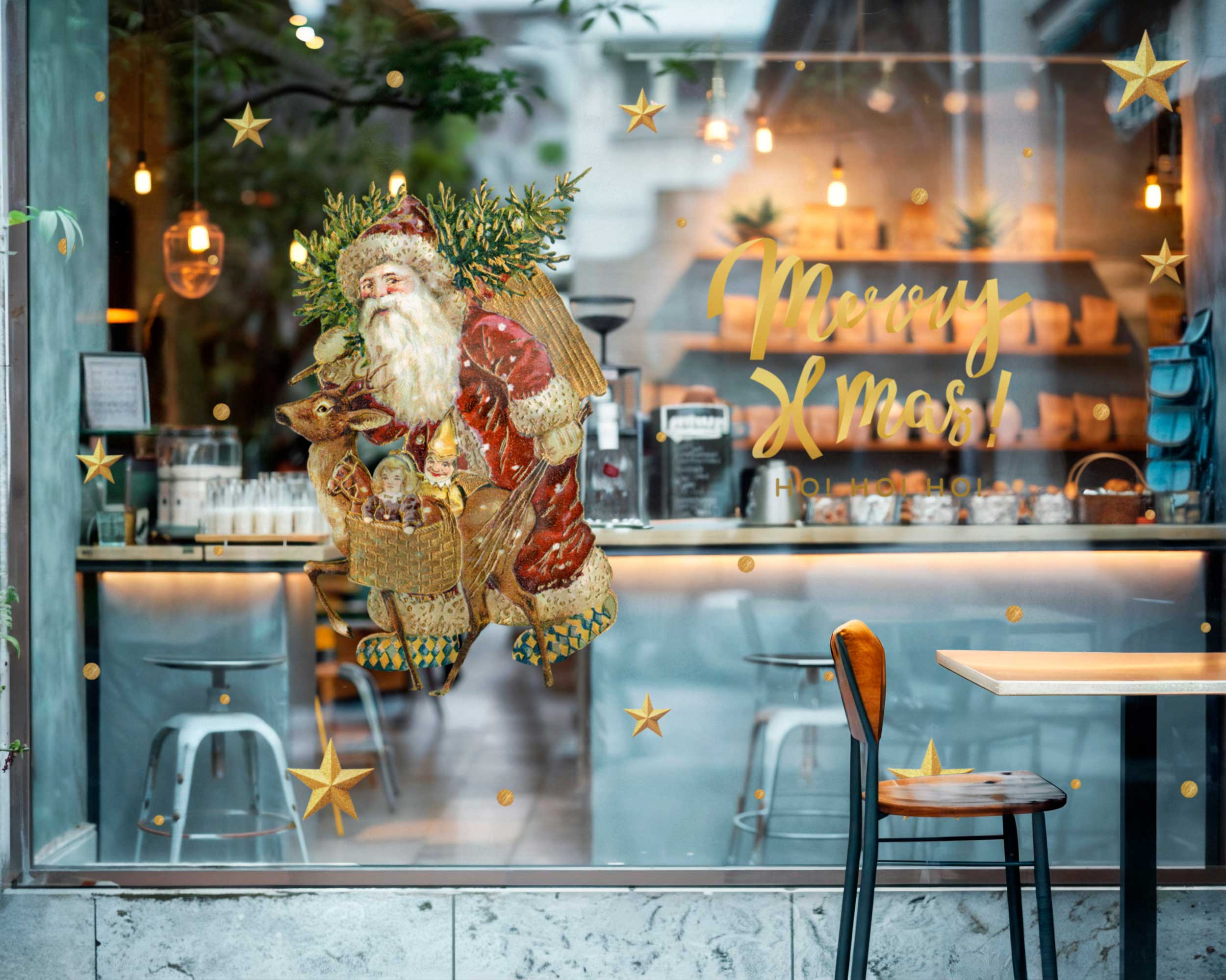 Add vintage holiday charm to your storefront with these Merry Xmas Window Decals featuring Santa, gold stars, and Ho Ho Ho text. These elegant vinyl stickers bring festive cheer to your shop window, creating a warm and inviting atmosphere for the holiday season.