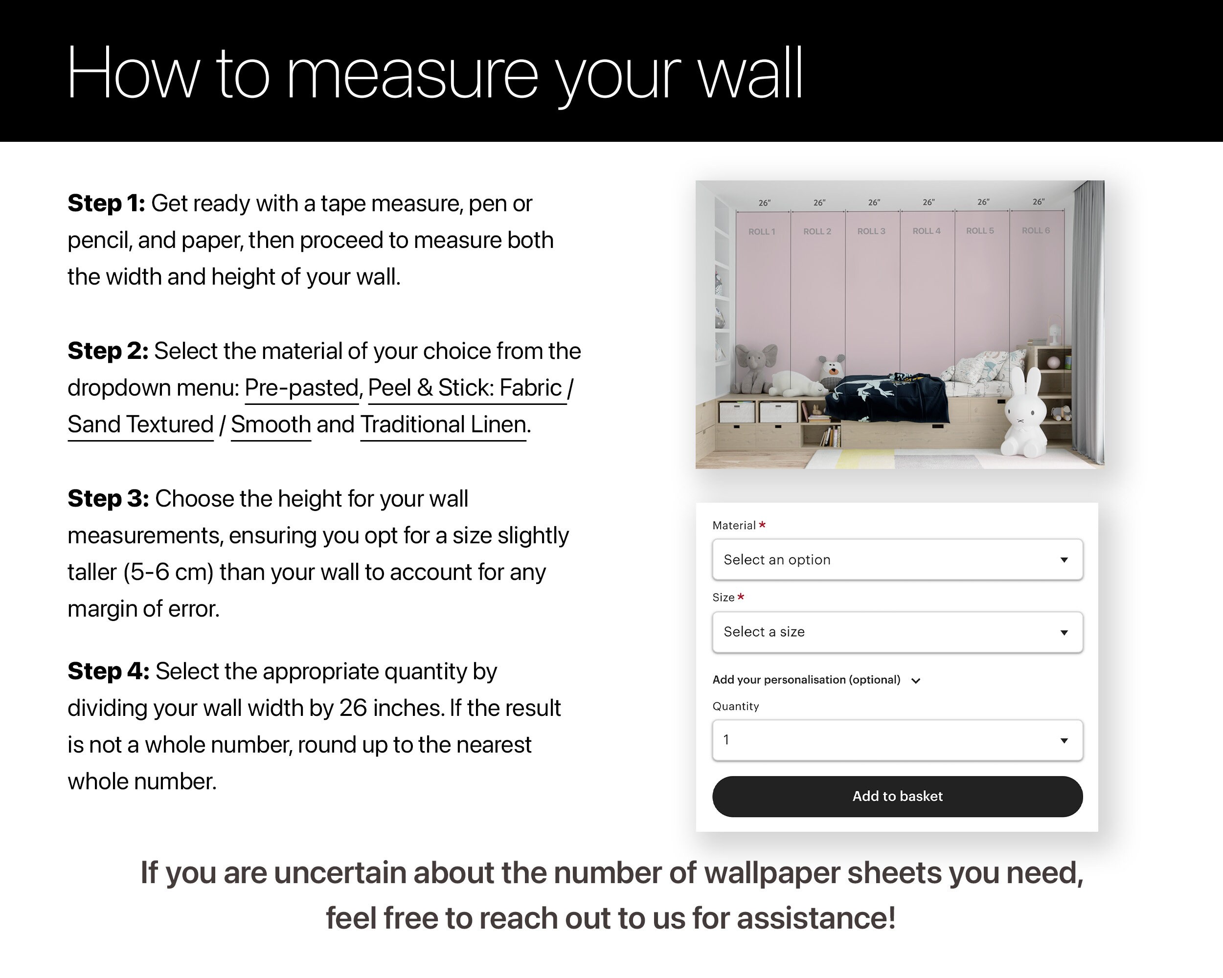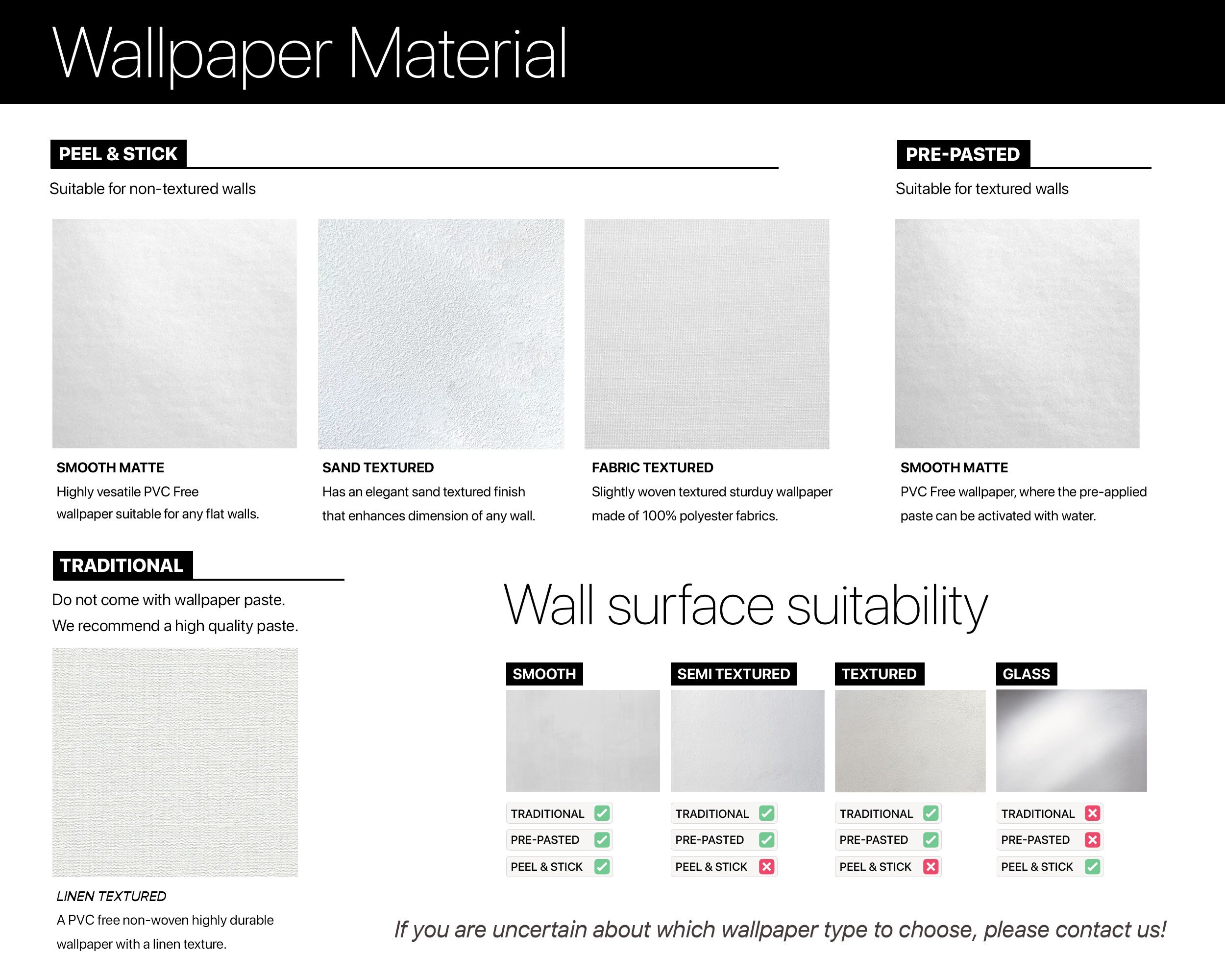 | Material | Peel & Stick: Smooth, Peel & Stick: Sand, Peel & Stick: Fabric, Pre-Pasted:Wallpaper, Traditional: Linen |