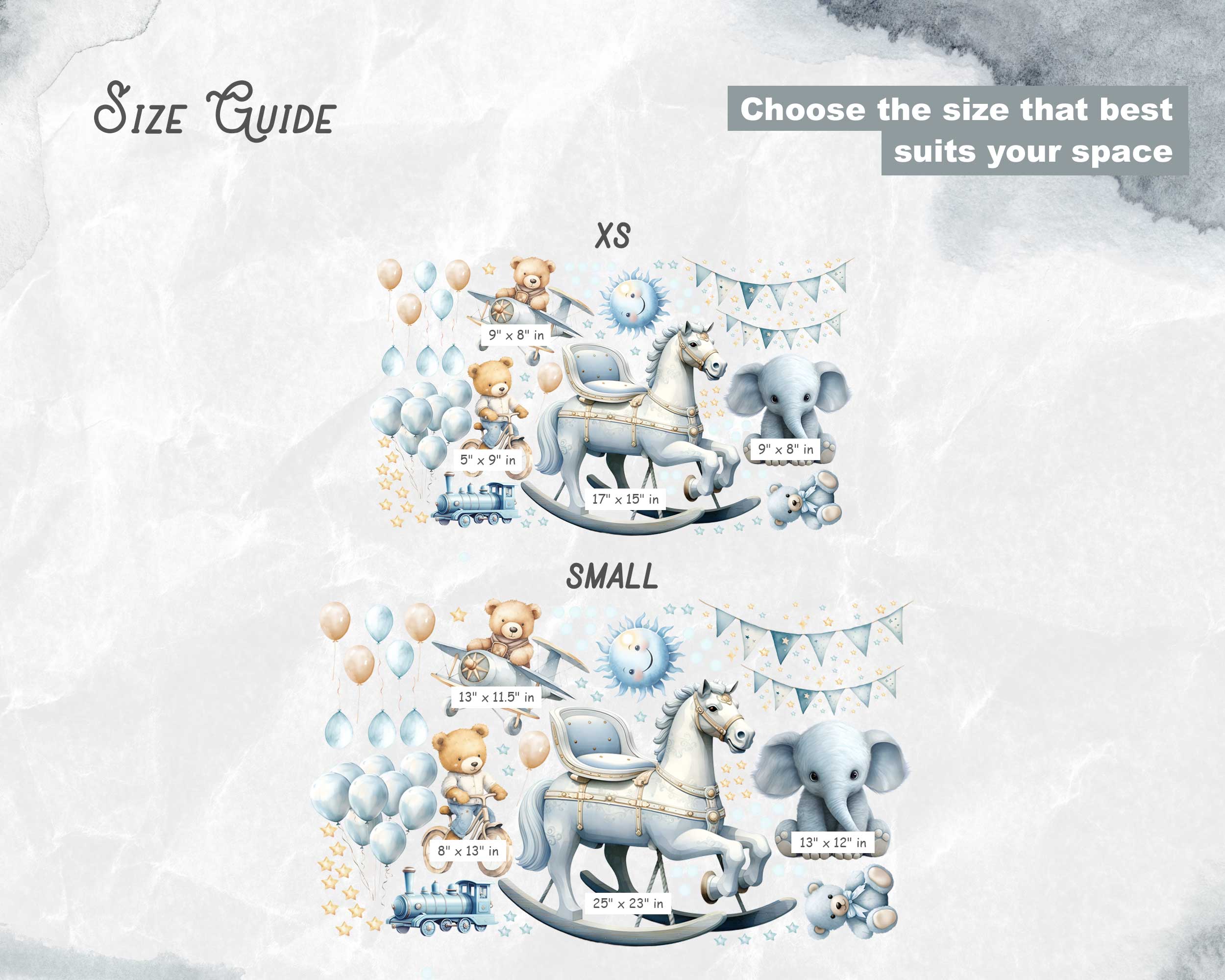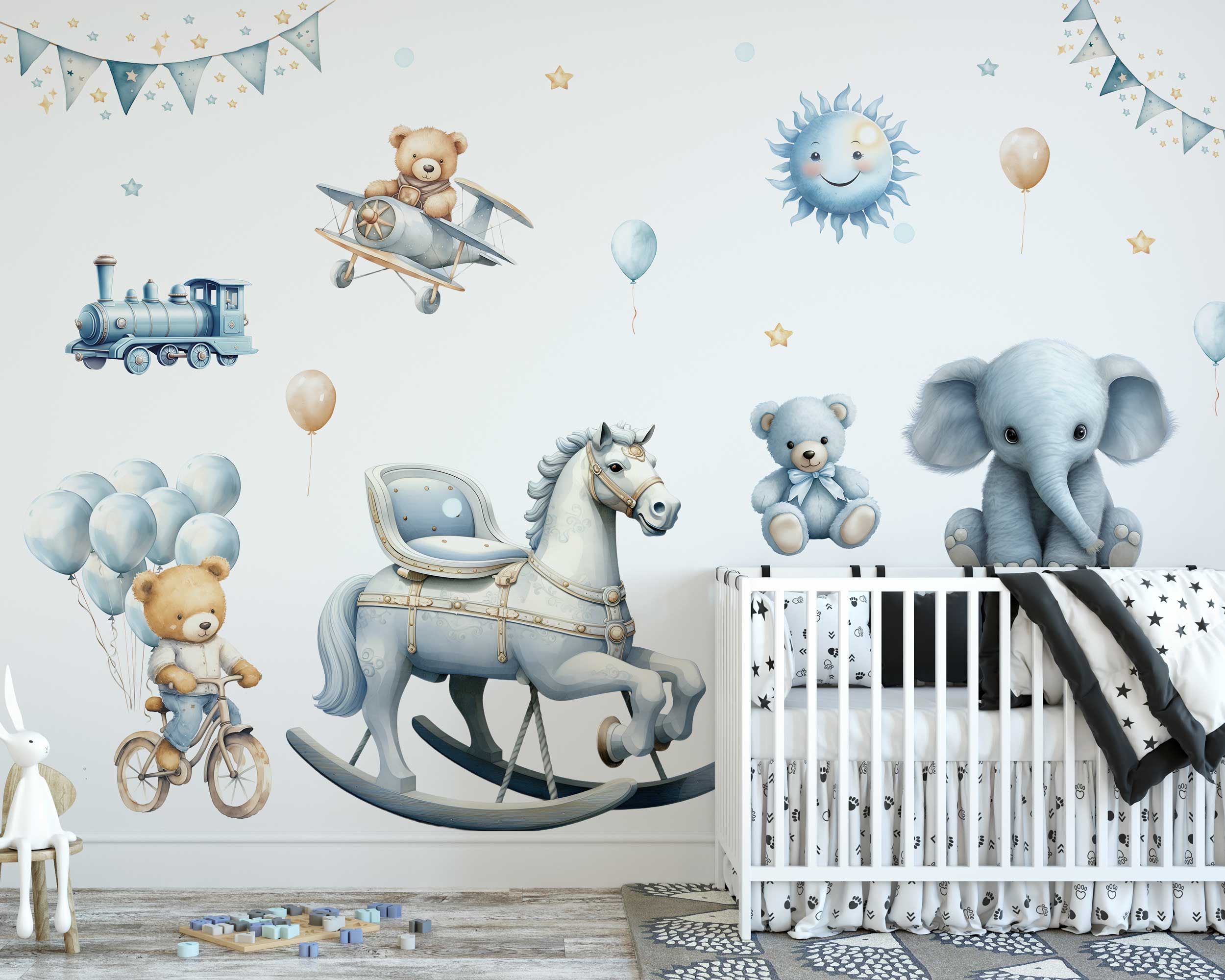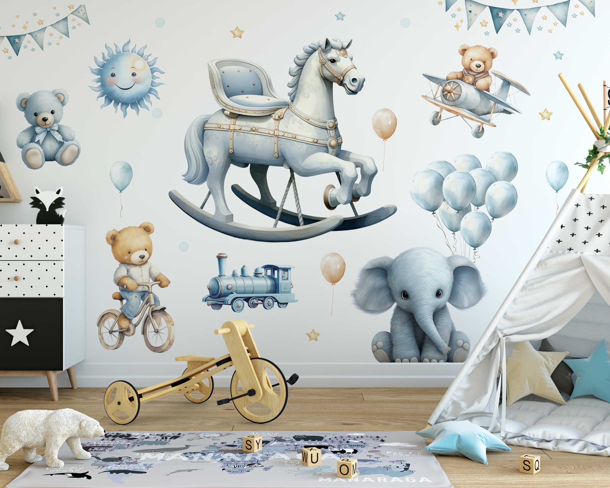 Create a dreamy nursery with our Blue Theme Nursery Wall Stickers. These adorable decals feature a variety of charming designs, including a rocking horse, teddy bears, a cute elephant, and more, all in soothing blue tones. Perfect for nurseries, playrooms, and bedrooms, these wall stickers are made from premium fabric with non-toxic inks, ensuring they are safe for children and easy to apply and reposition. Transform any room into a peaceful haven for your little one with these delightful and playful wall decals.