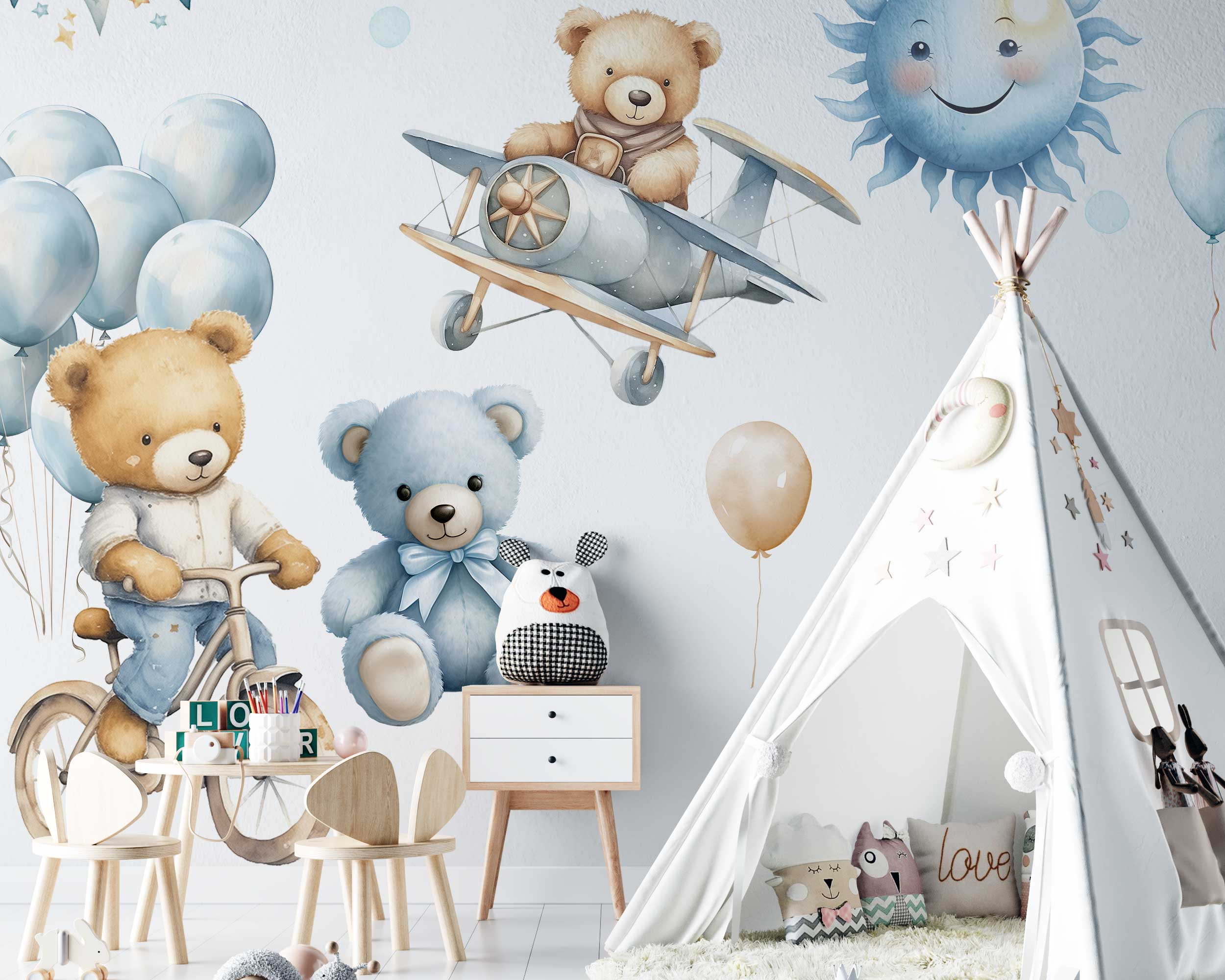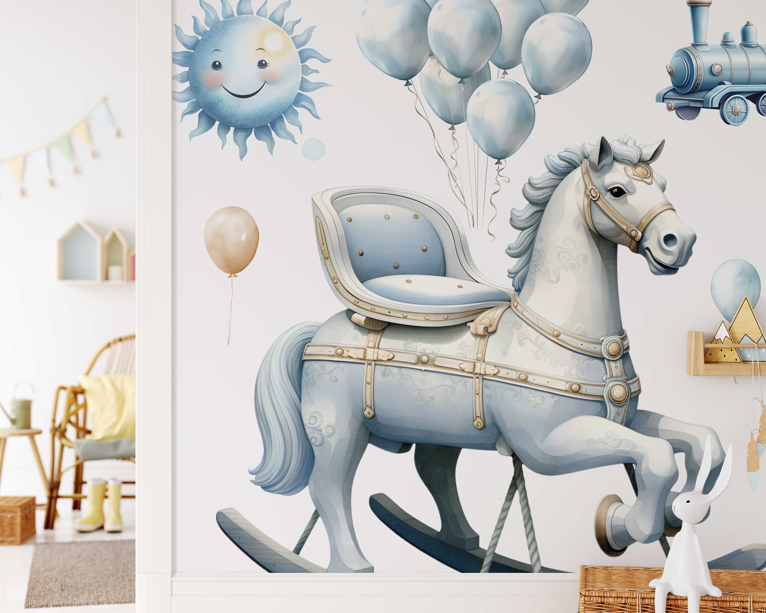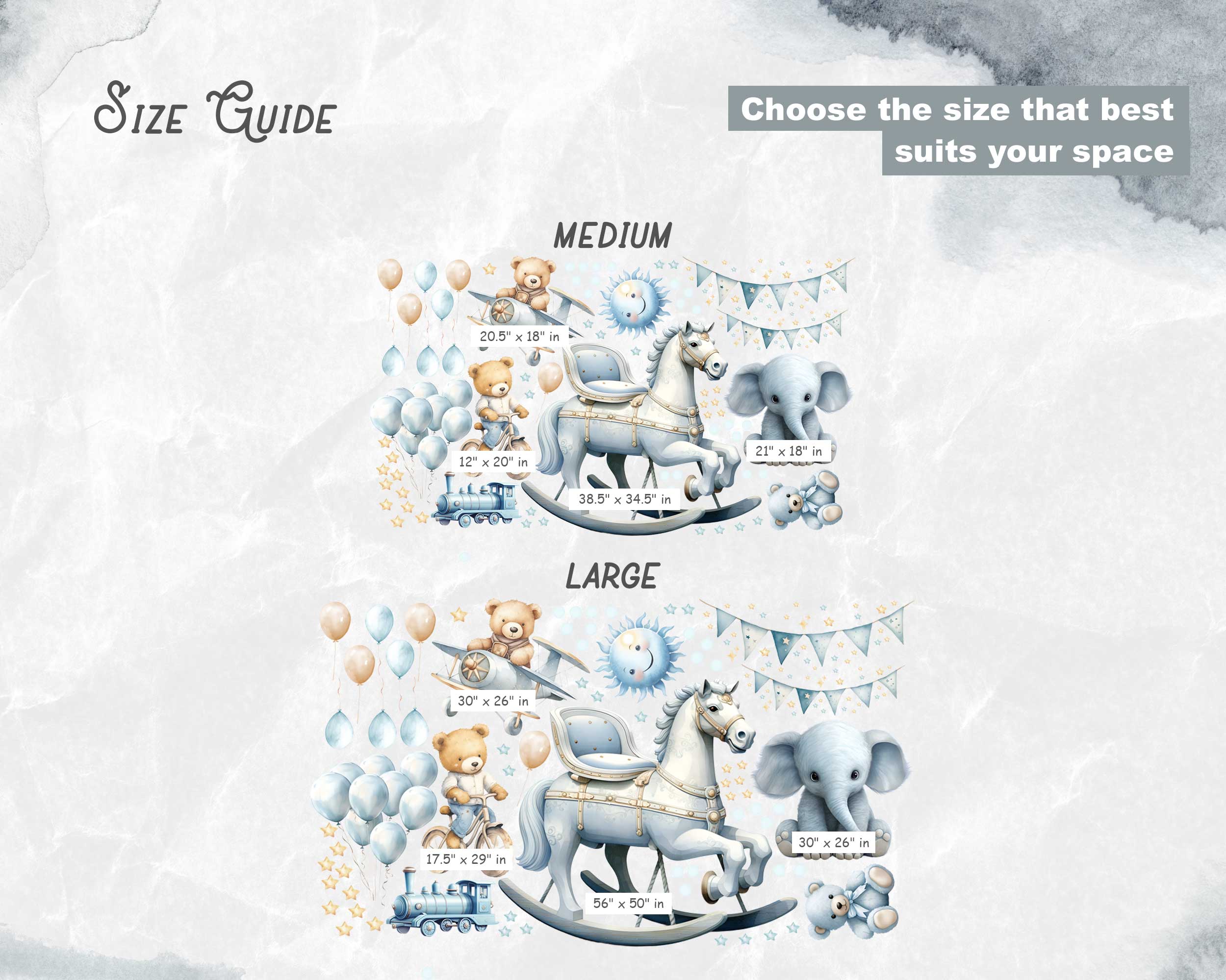 Create a dreamy nursery with our Blue Theme Nursery Wall Stickers. These adorable decals feature a variety of charming designs, including a rocking horse, teddy bears, a cute elephant, and more, all in soothing blue tones. Perfect for nurseries, playrooms, and bedrooms, these wall stickers are made from premium fabric with non-toxic inks, ensuring they are safe for children and easy to apply and reposition. Transform any room into a peaceful haven for your little one with these delightful and playful wall decals.