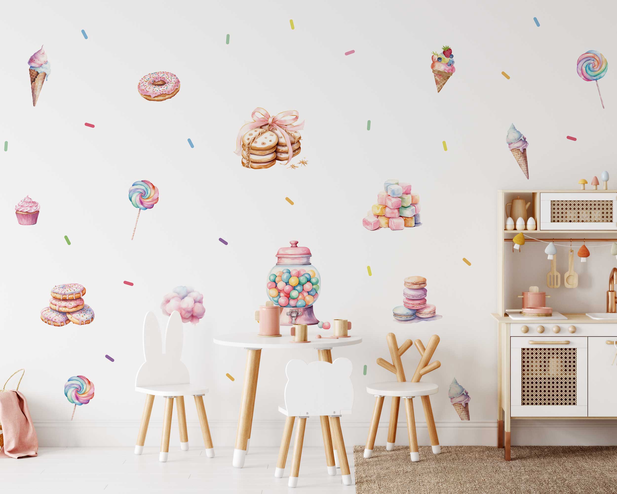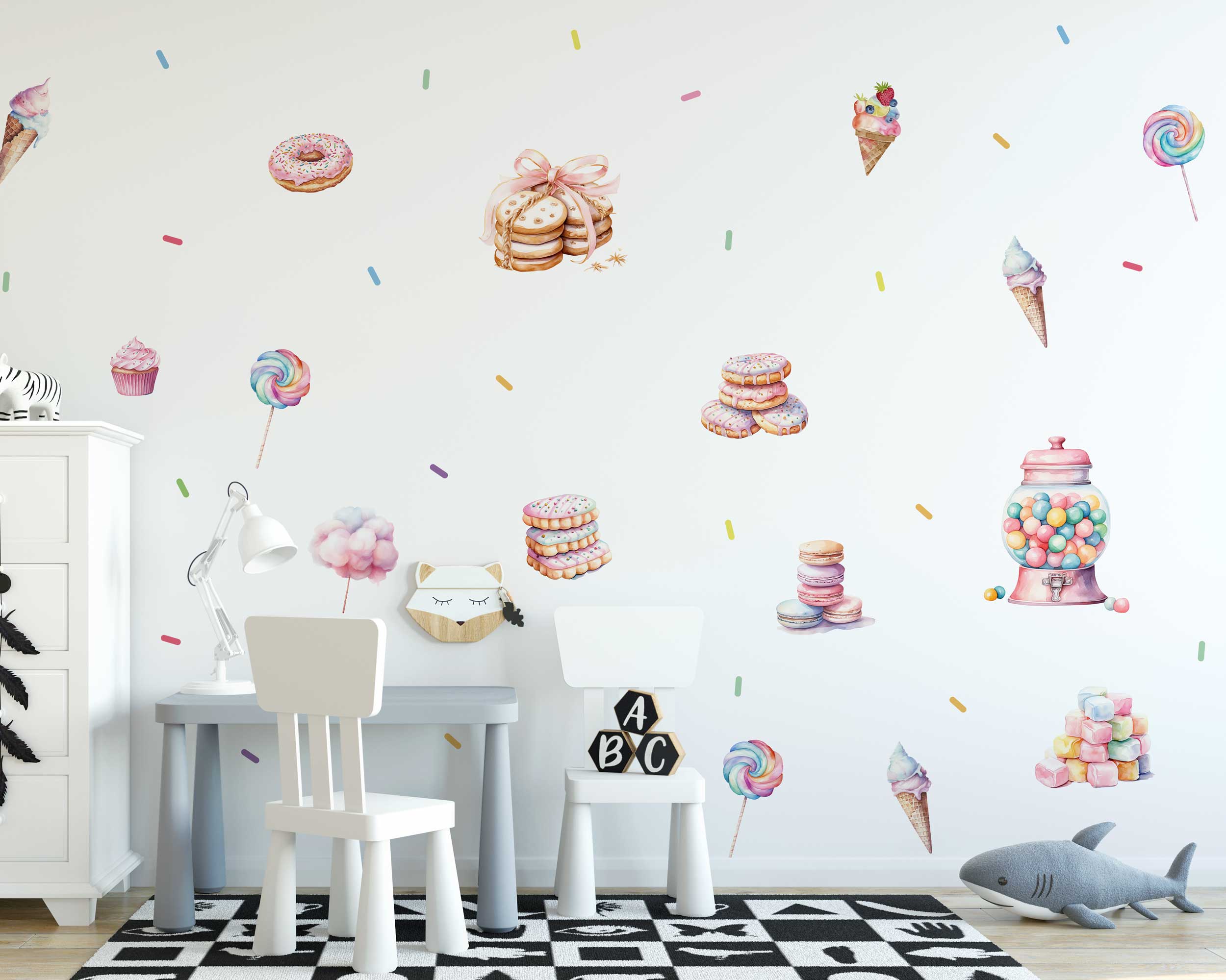 Bring the magic of a candy-filled world to your child’s room with this delightful pastel candy and cookie wall sticker set. Designed with vibrant yet soft colors, this set features a variety of sweet treats, including ice cream cones, donuts, cupcakes, macarons, and more. The playful dessert-themed designs add a whimsical and charming touch to nurseries, playrooms, or any space that could use a dose of fun.