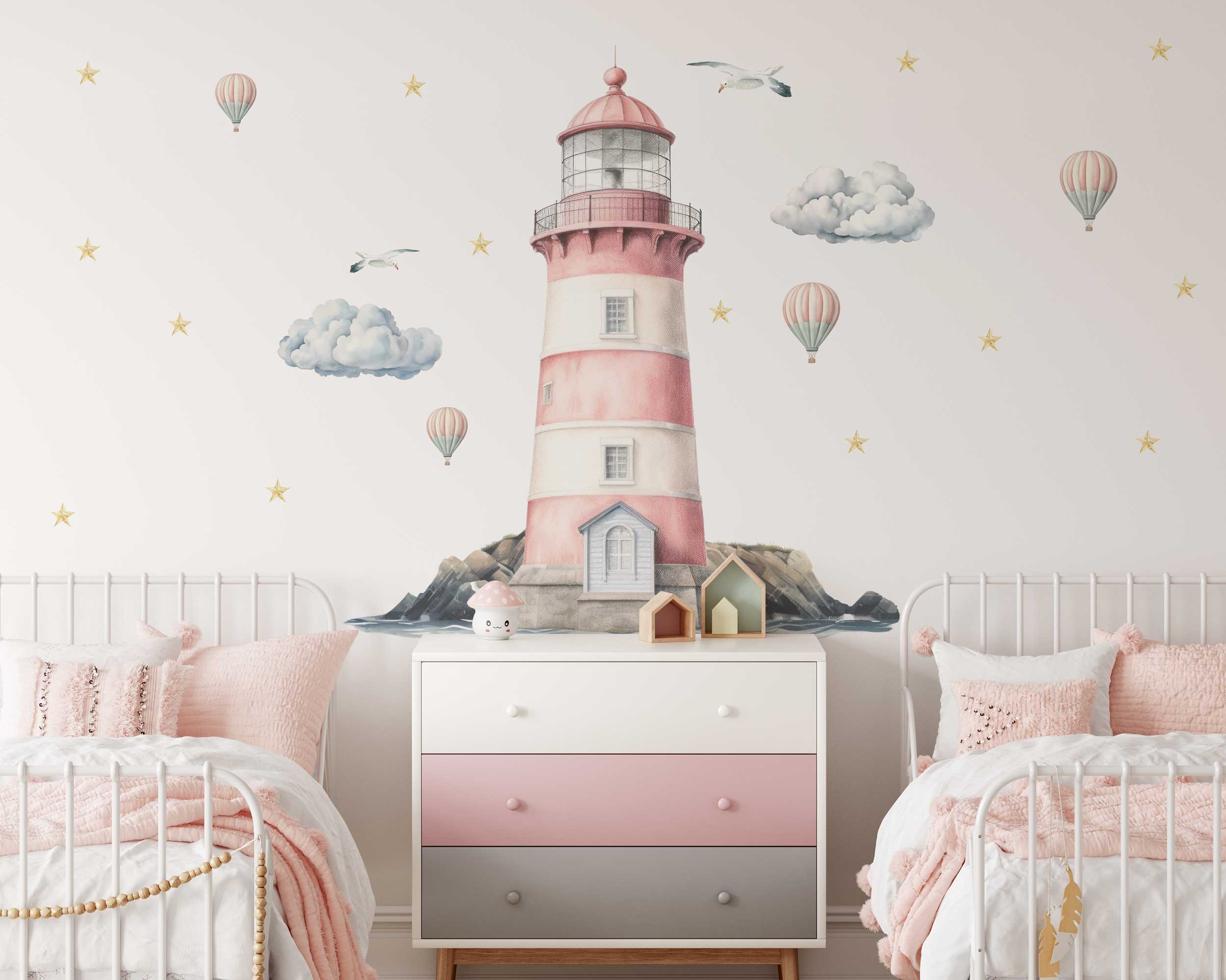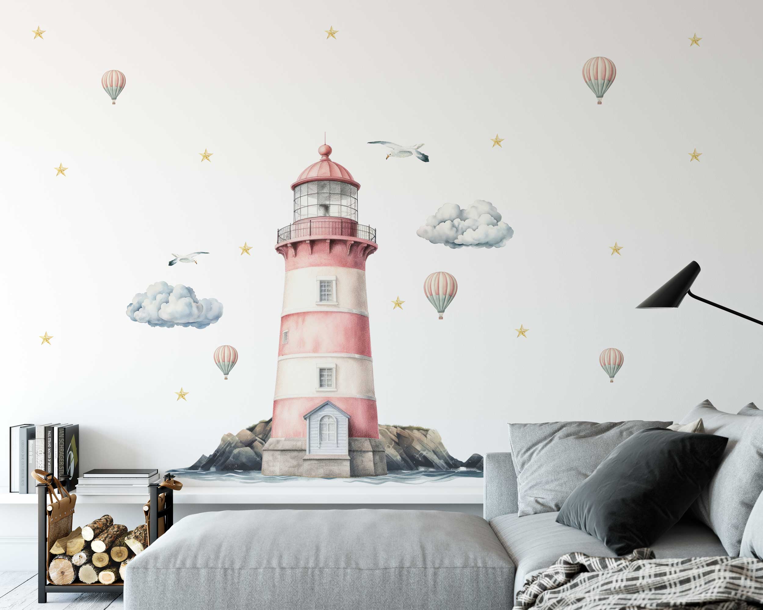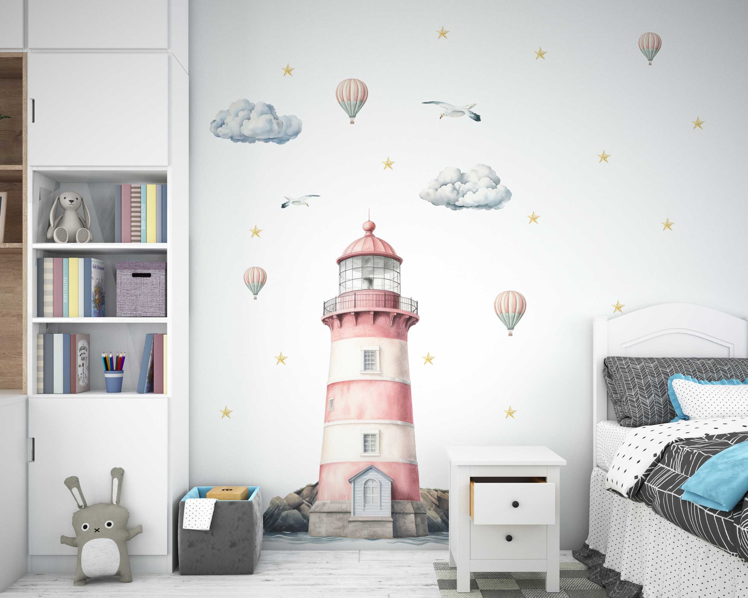 Our lighthouse wall decal features a beautifully illustrated lighthouse surrounded by clouds, hot air balloons, seagulls, and stars. This enchanting design brings the charm of the seaside into any room, making it a delightful focal point. Available in a range of sizes, you can choose the perfect fit for your space.
