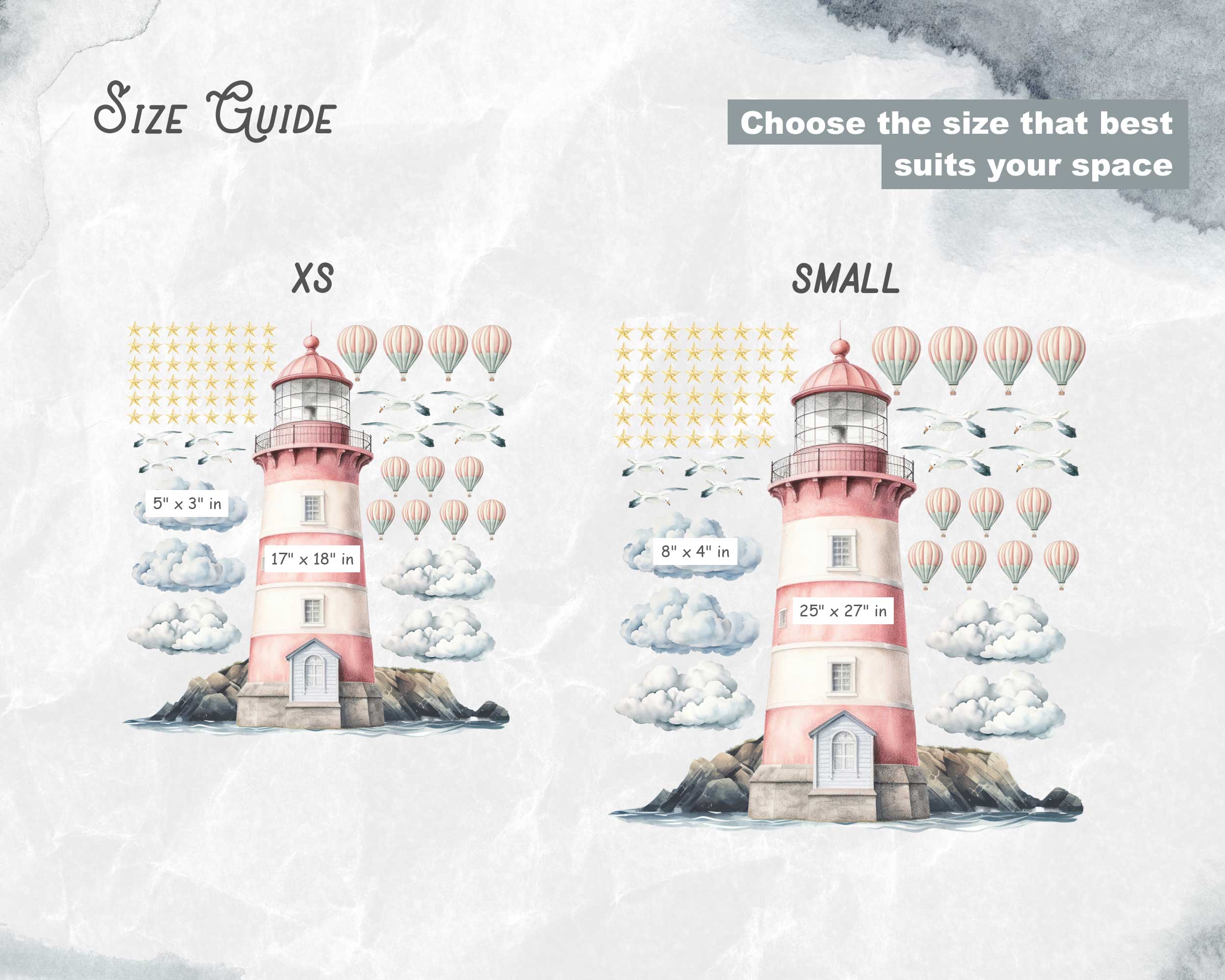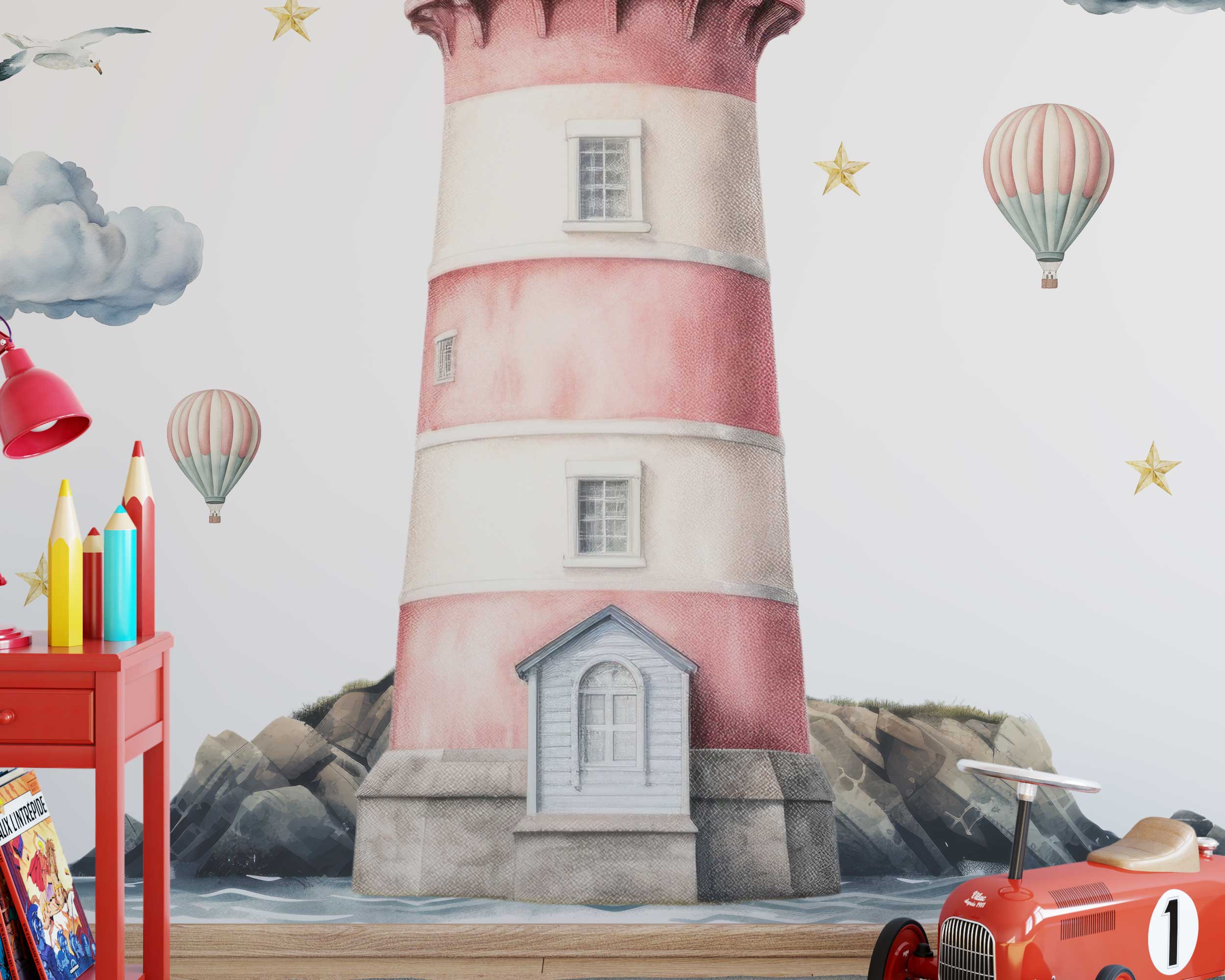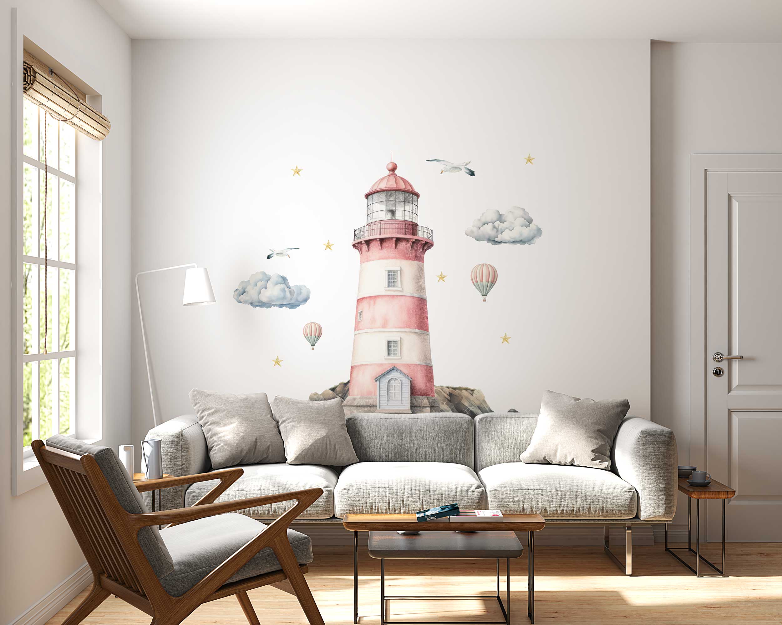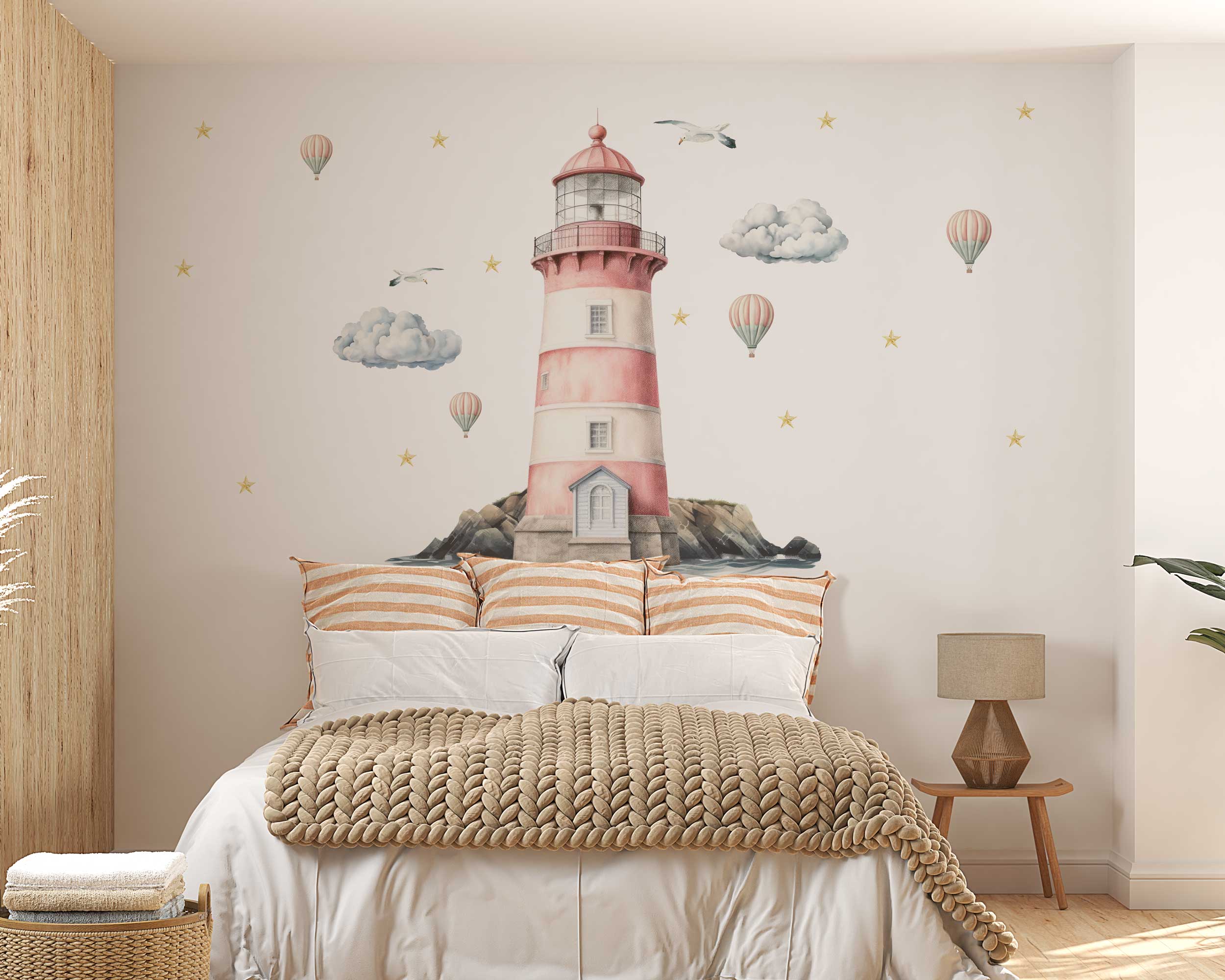 Our lighthouse wall decal features a beautifully illustrated lighthouse surrounded by clouds, hot air balloons, seagulls, and stars. This enchanting design brings the charm of the seaside into any room, making it a delightful focal point. Available in a range of sizes, you can choose the perfect fit for your space.