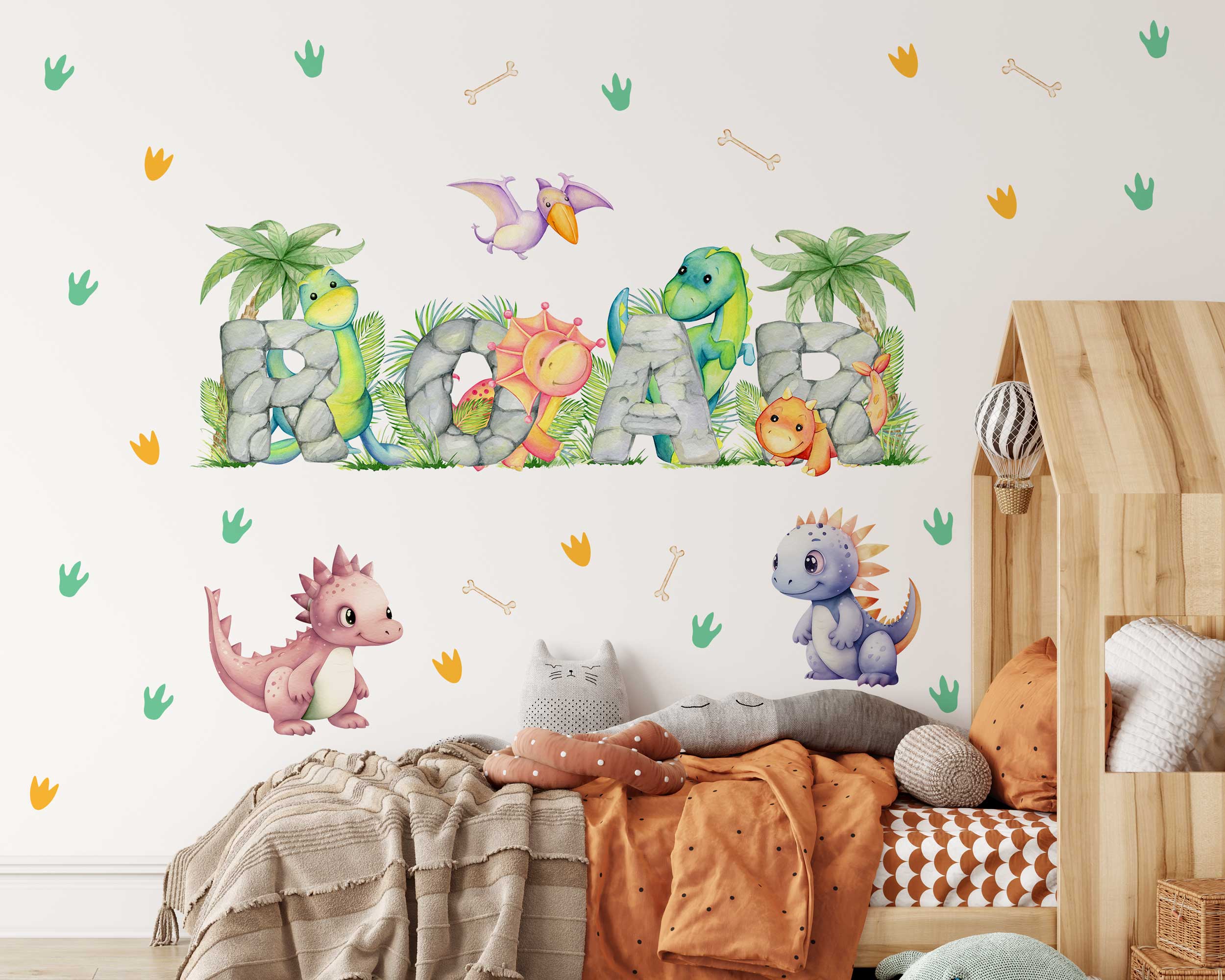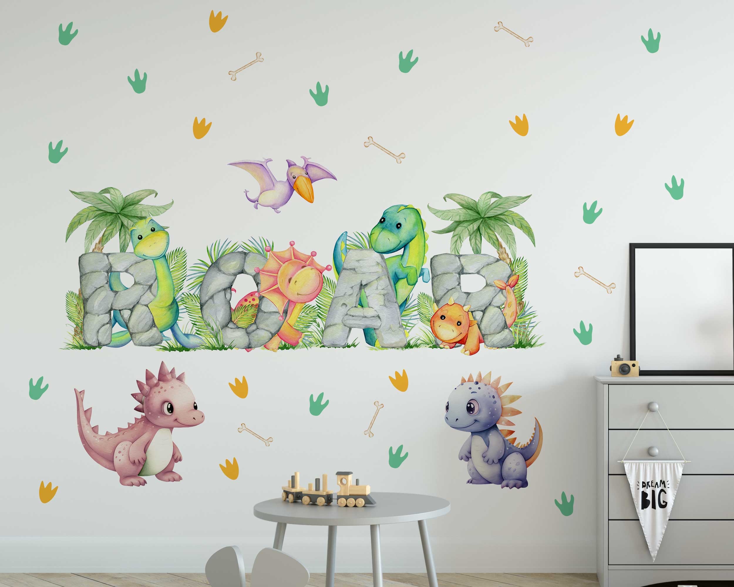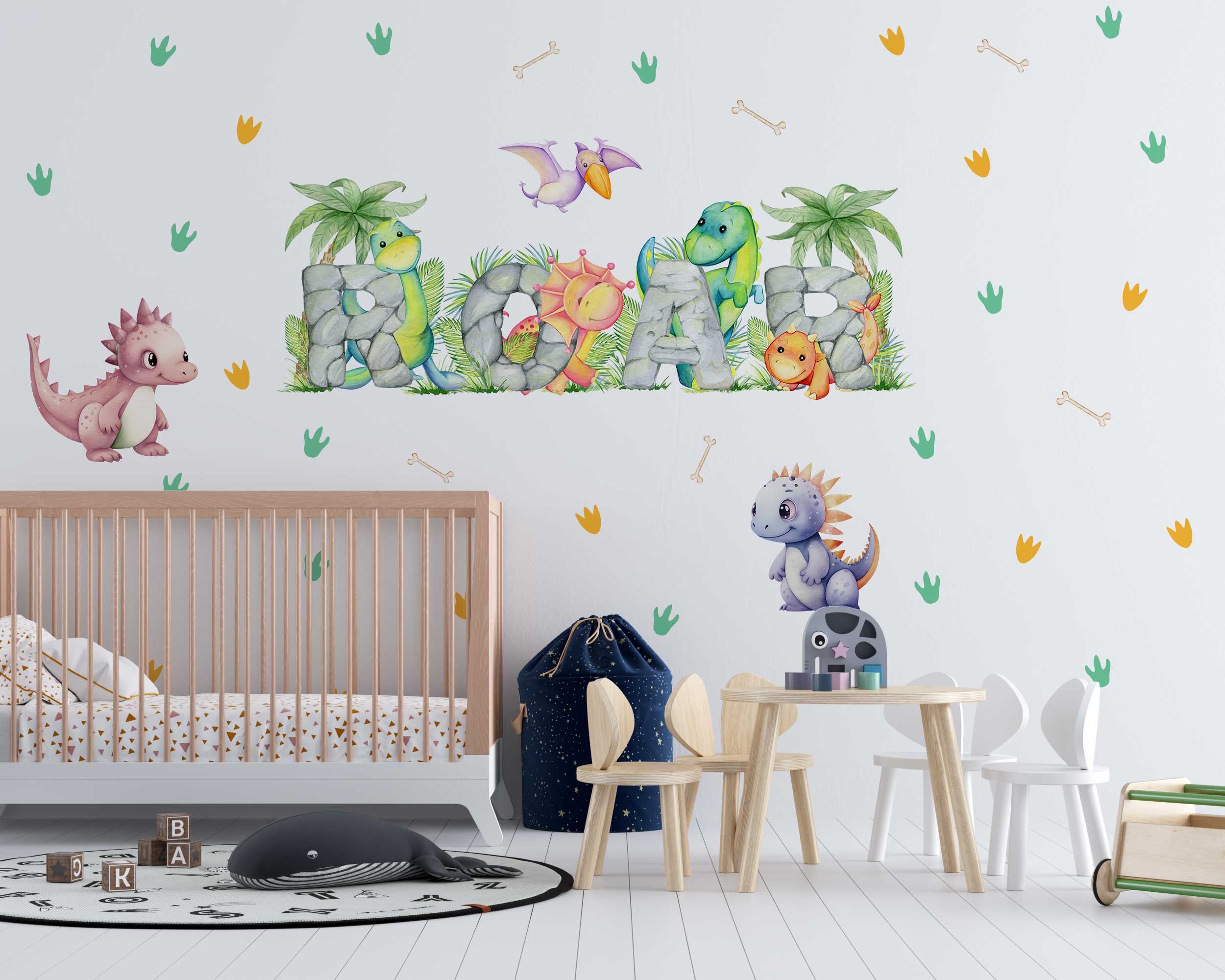 Transform your child’s room into a prehistoric paradise with our vibrant ROAR Dinosaur Wall Stickers! Perfect for nurseries, playrooms, and bedrooms, these charming dino-themed wall decals add a playful touch to any space. Featuring adorable dinosaurs spelling out “ROAR” with colorful stones and surrounded by tropical plants, footprints, and bones, these decals create a fun and engaging environment that little ones will love.