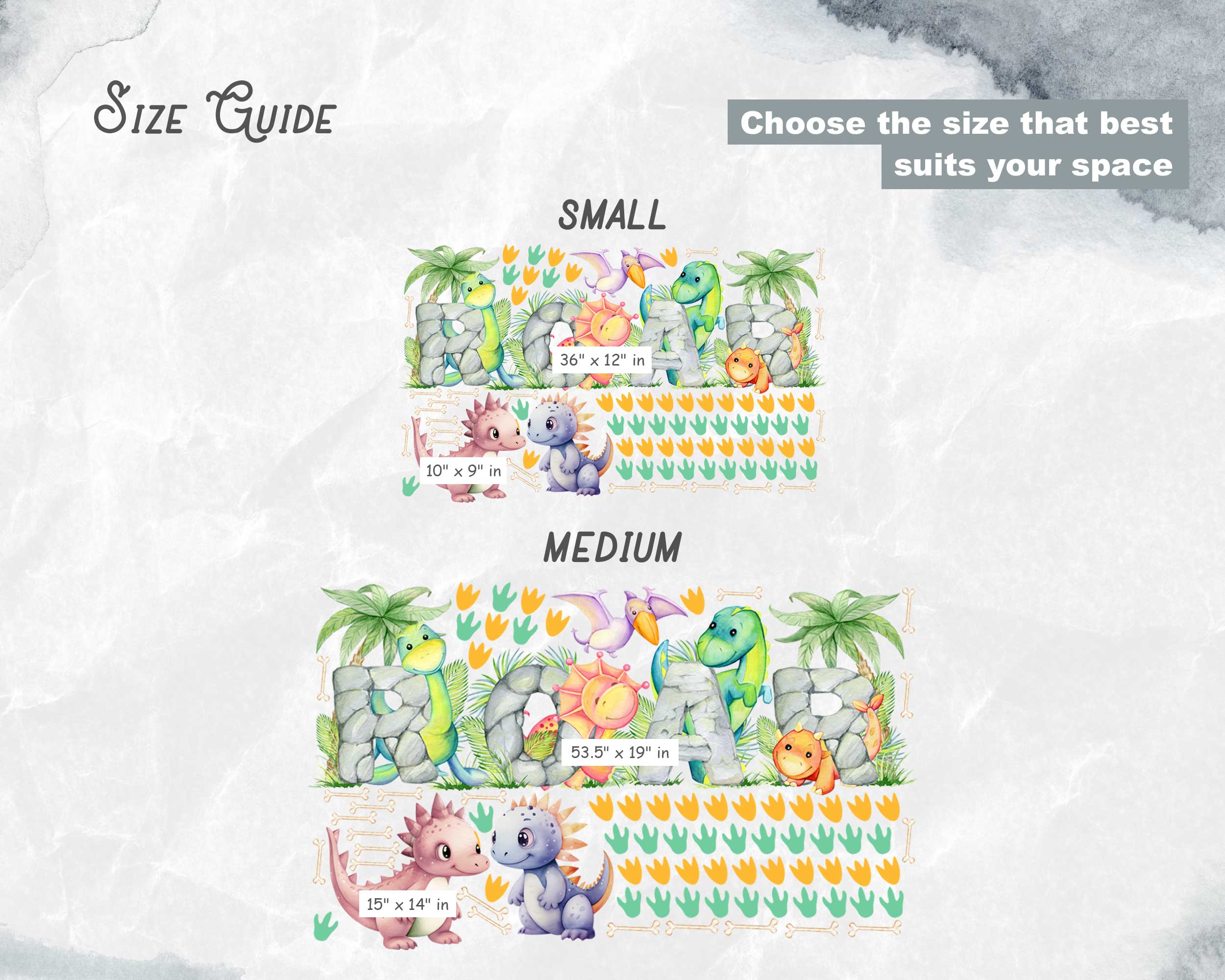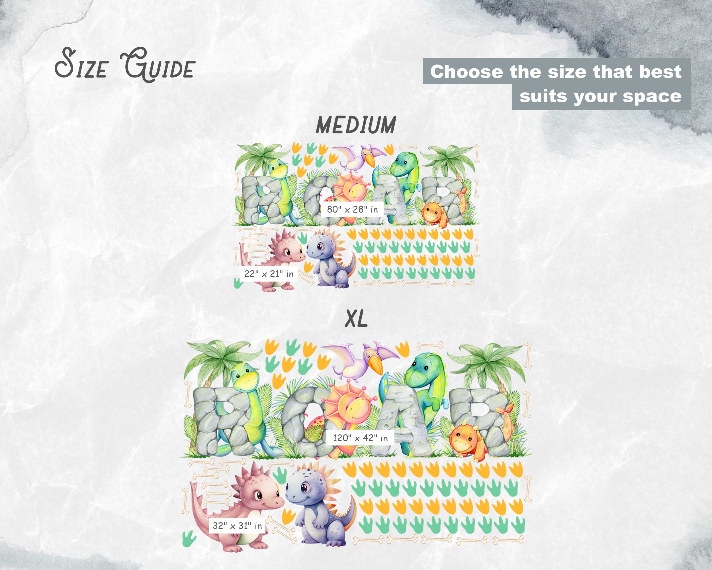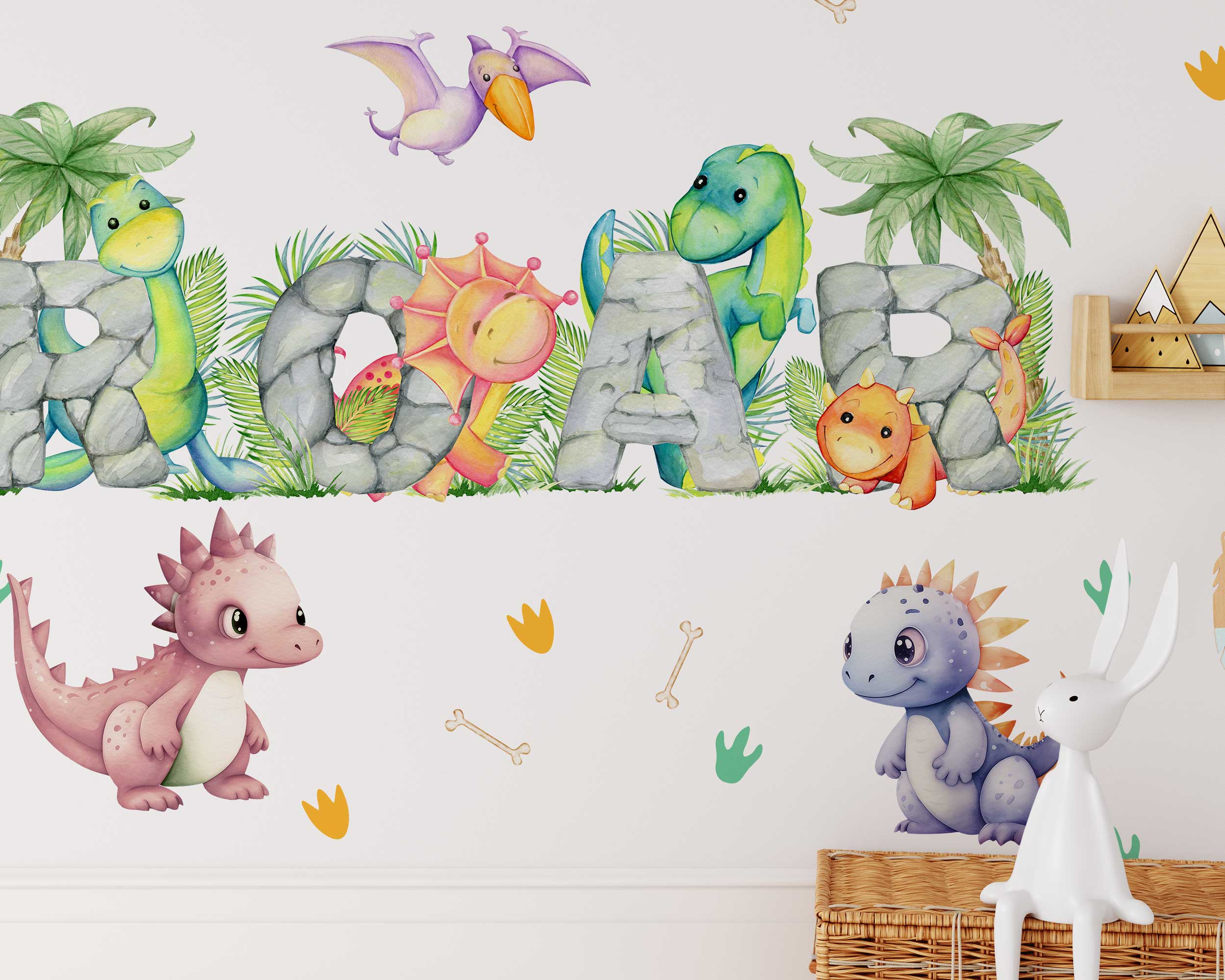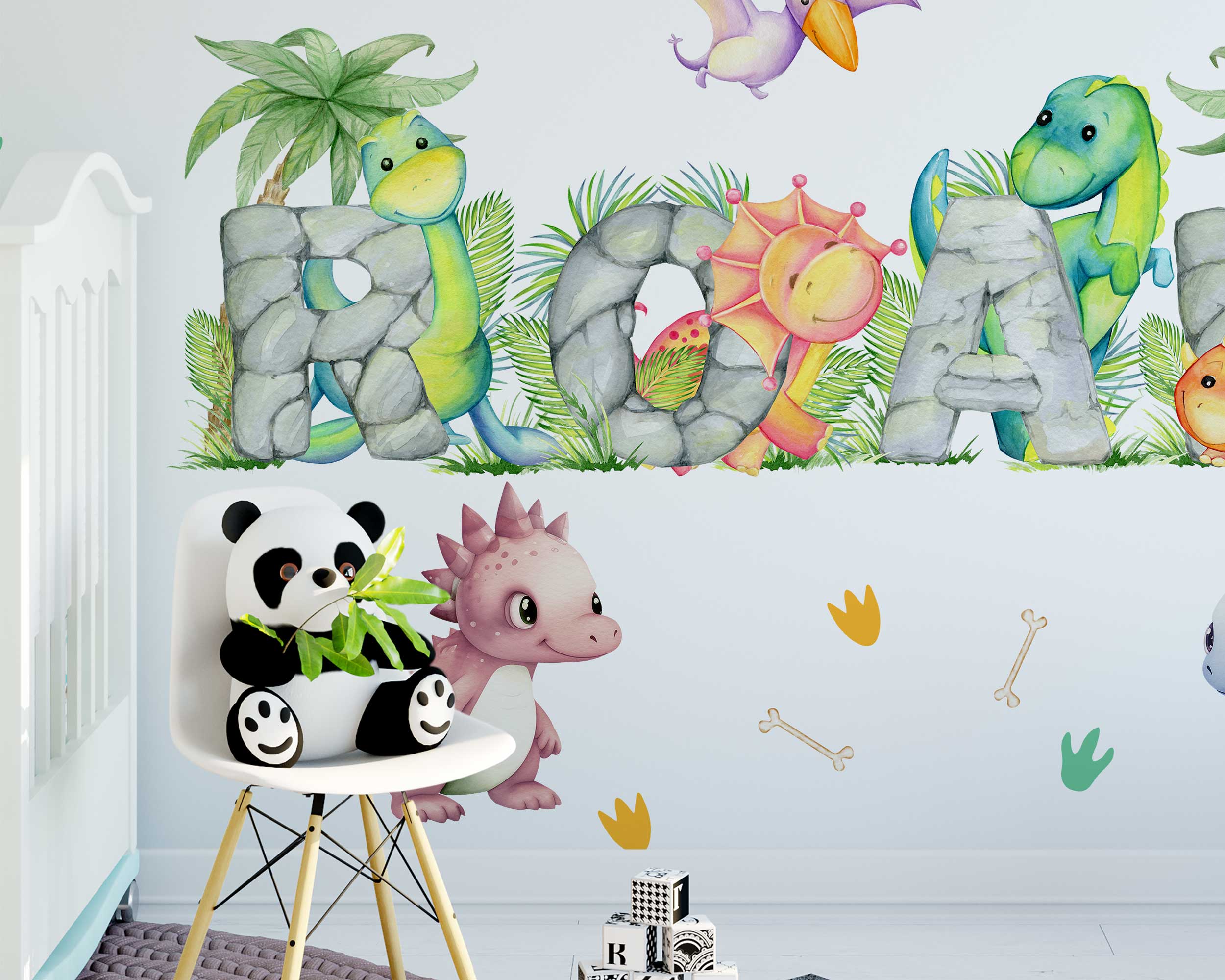 Transform your child’s room into a prehistoric paradise with our vibrant ROAR Dinosaur Wall Stickers! Perfect for nurseries, playrooms, and bedrooms, these charming dino-themed wall decals add a playful touch to any space. Featuring adorable dinosaurs spelling out “ROAR” with colorful stones and surrounded by tropical plants, footprints, and bones, these decals create a fun and engaging environment that little ones will love.