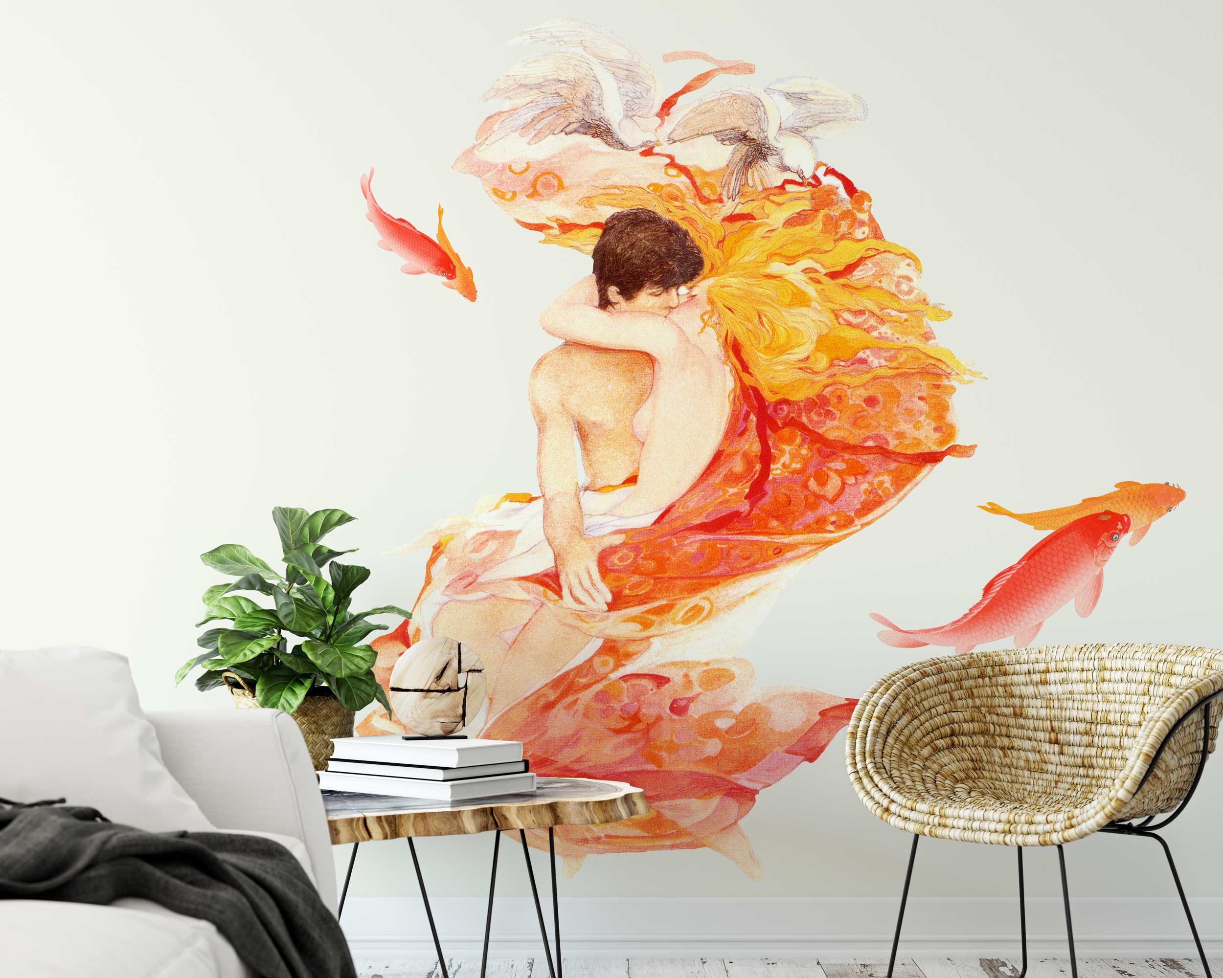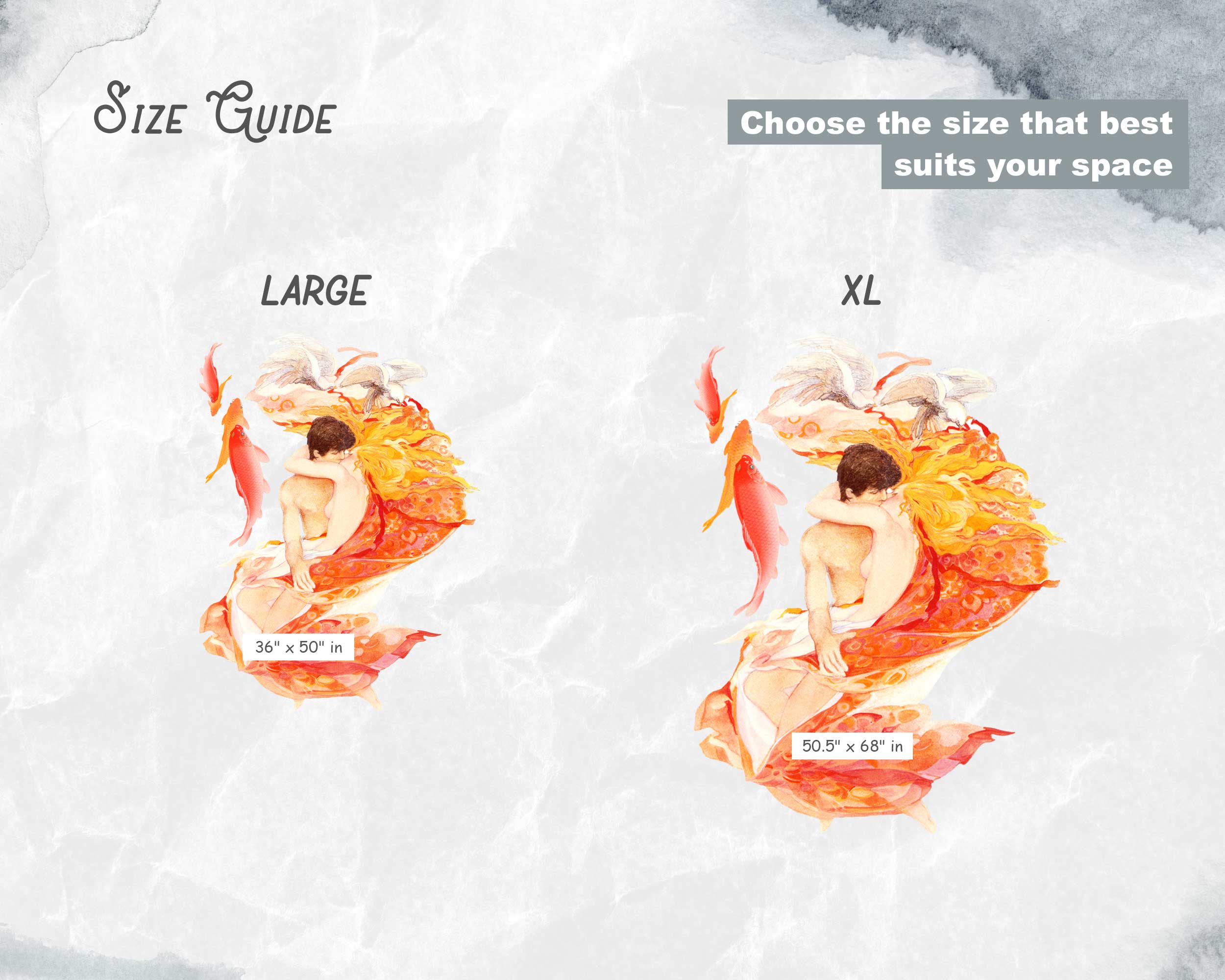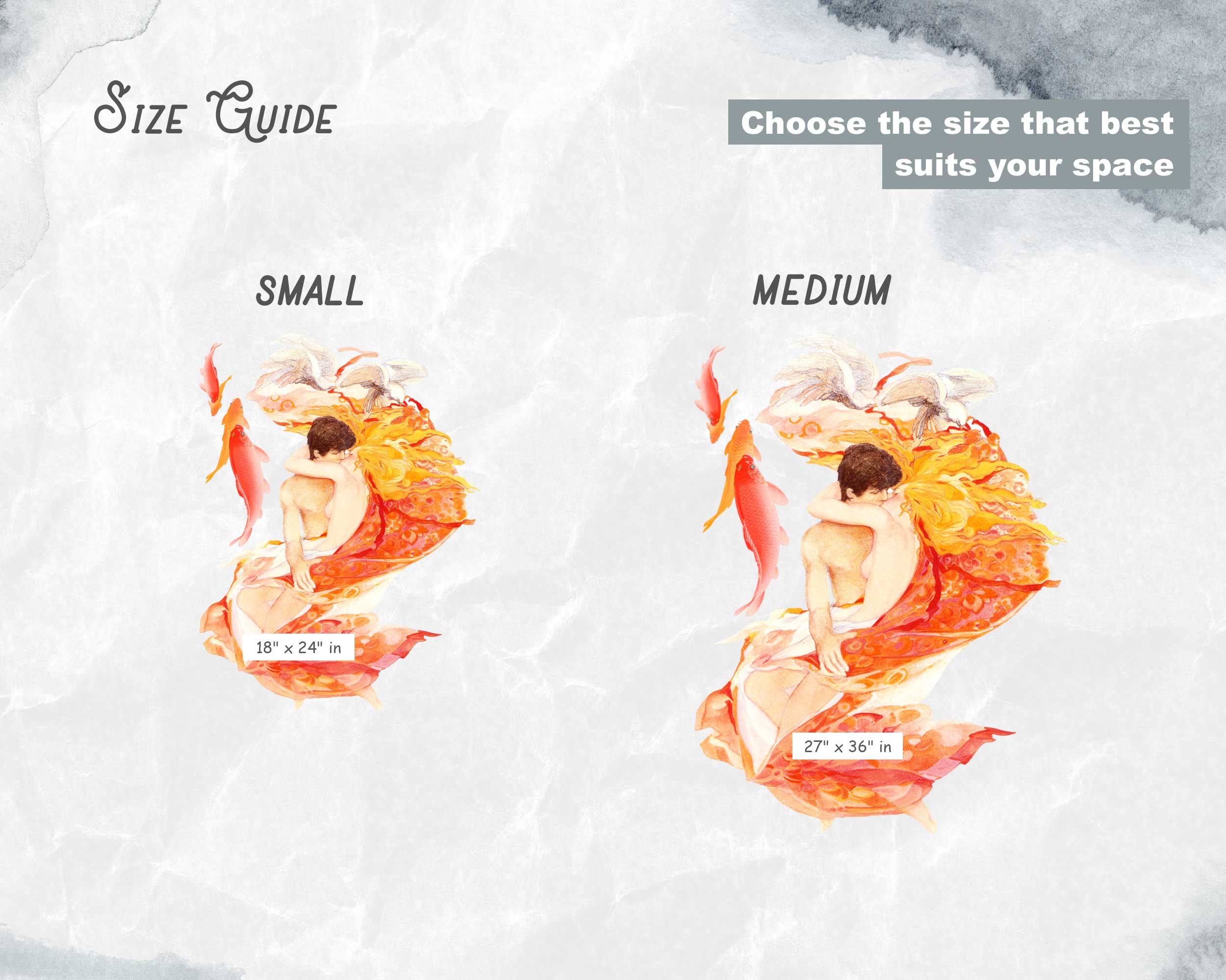 Create a dreamy and romantic atmosphere with this Romantic Couple Kissing Wall Sticker. Featuring an artistic design of an embracing couple surrounded by flowing fabric and koi fish, this decal brings a touch of passion and elegance to any space. The watercolor-inspired design blends beautifully with various decor styles, making it a perfect addition to bedrooms, living rooms, or creative spaces.