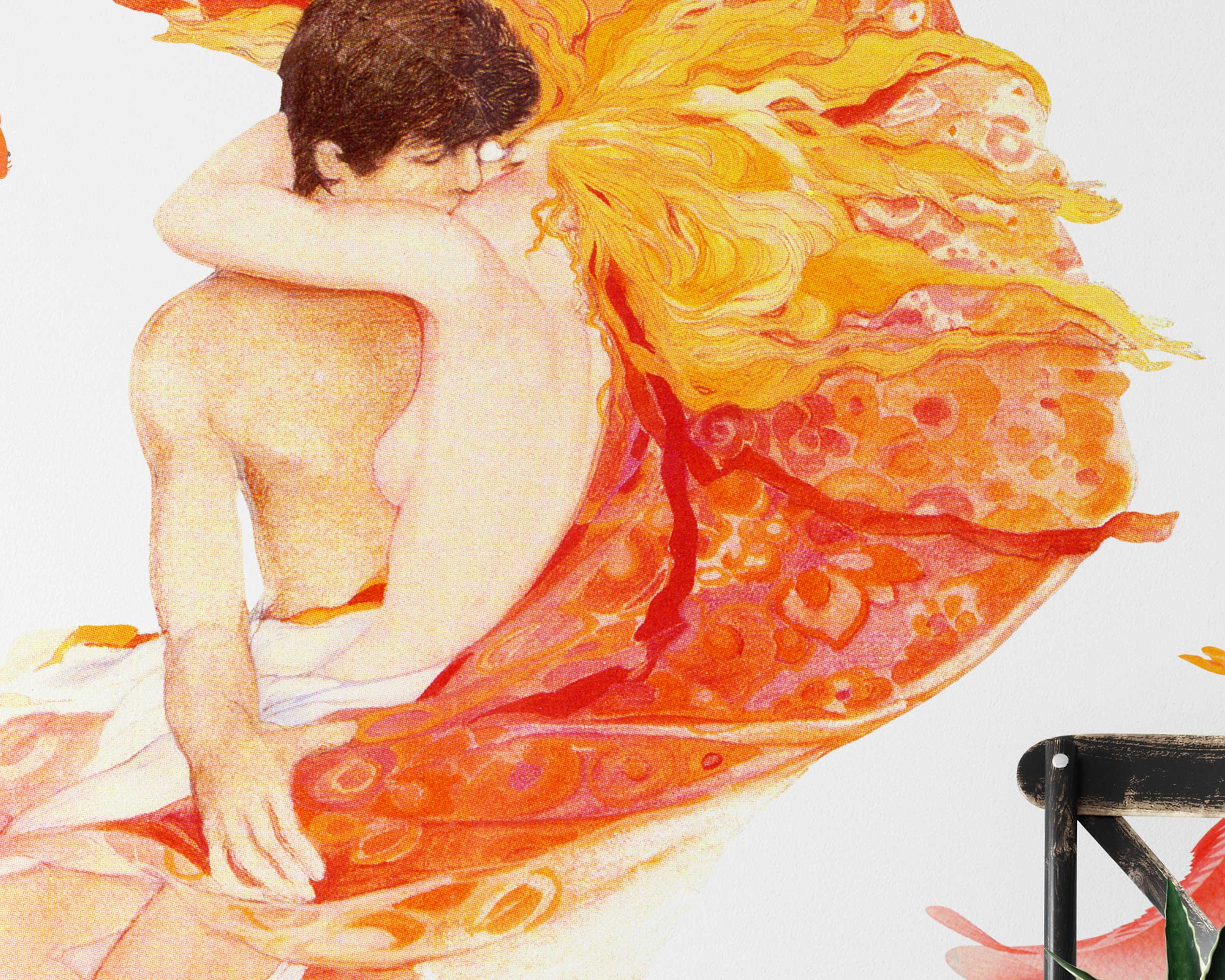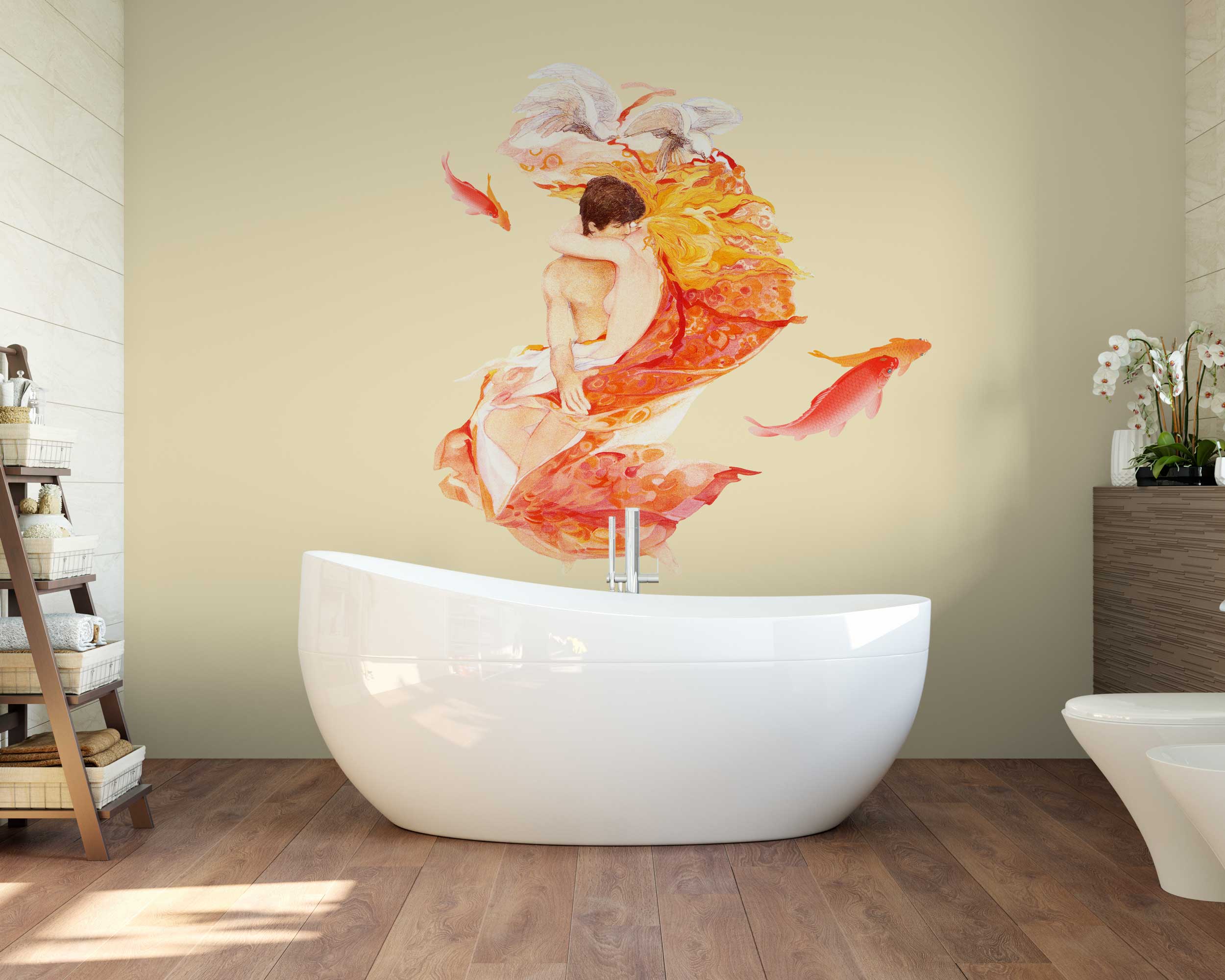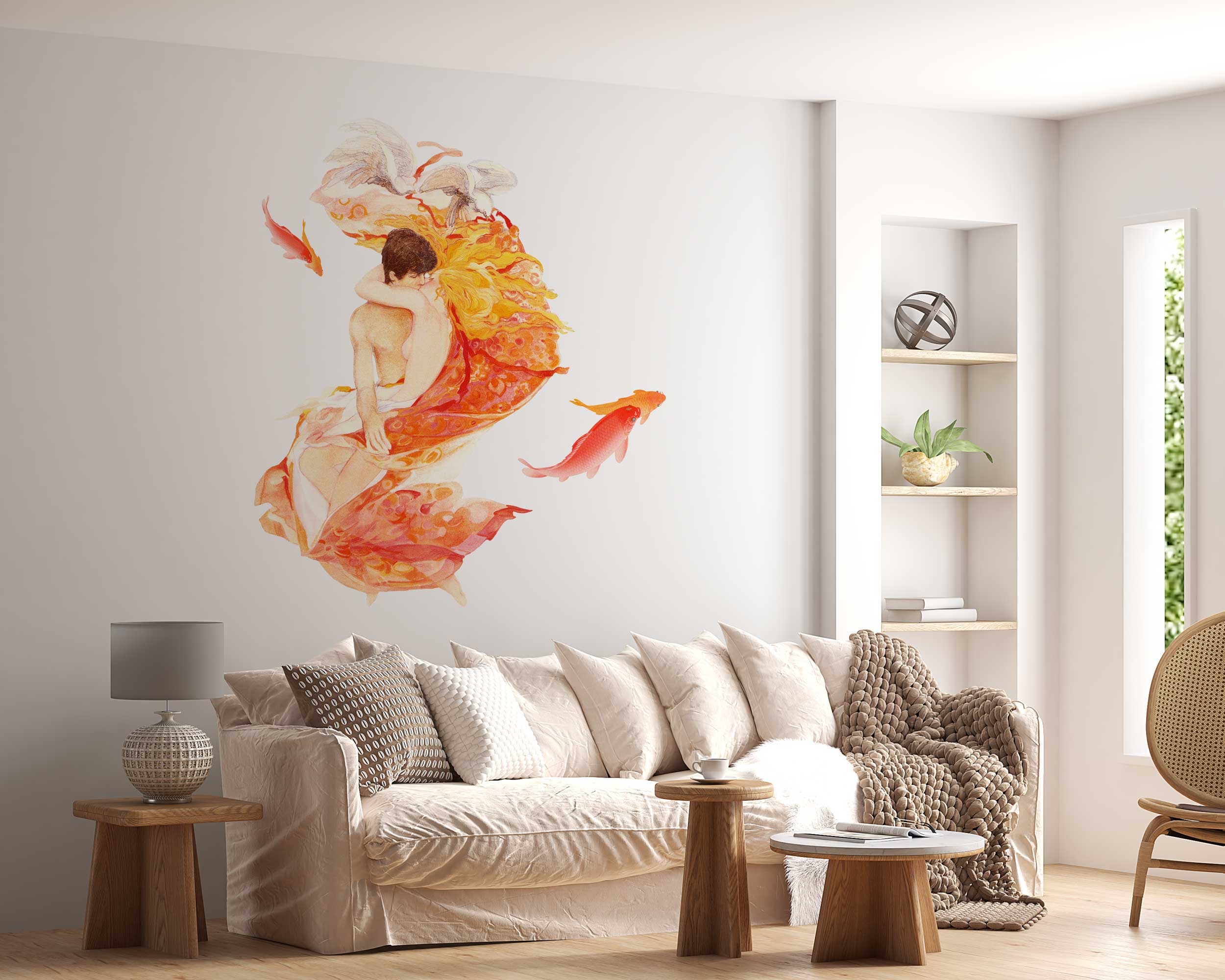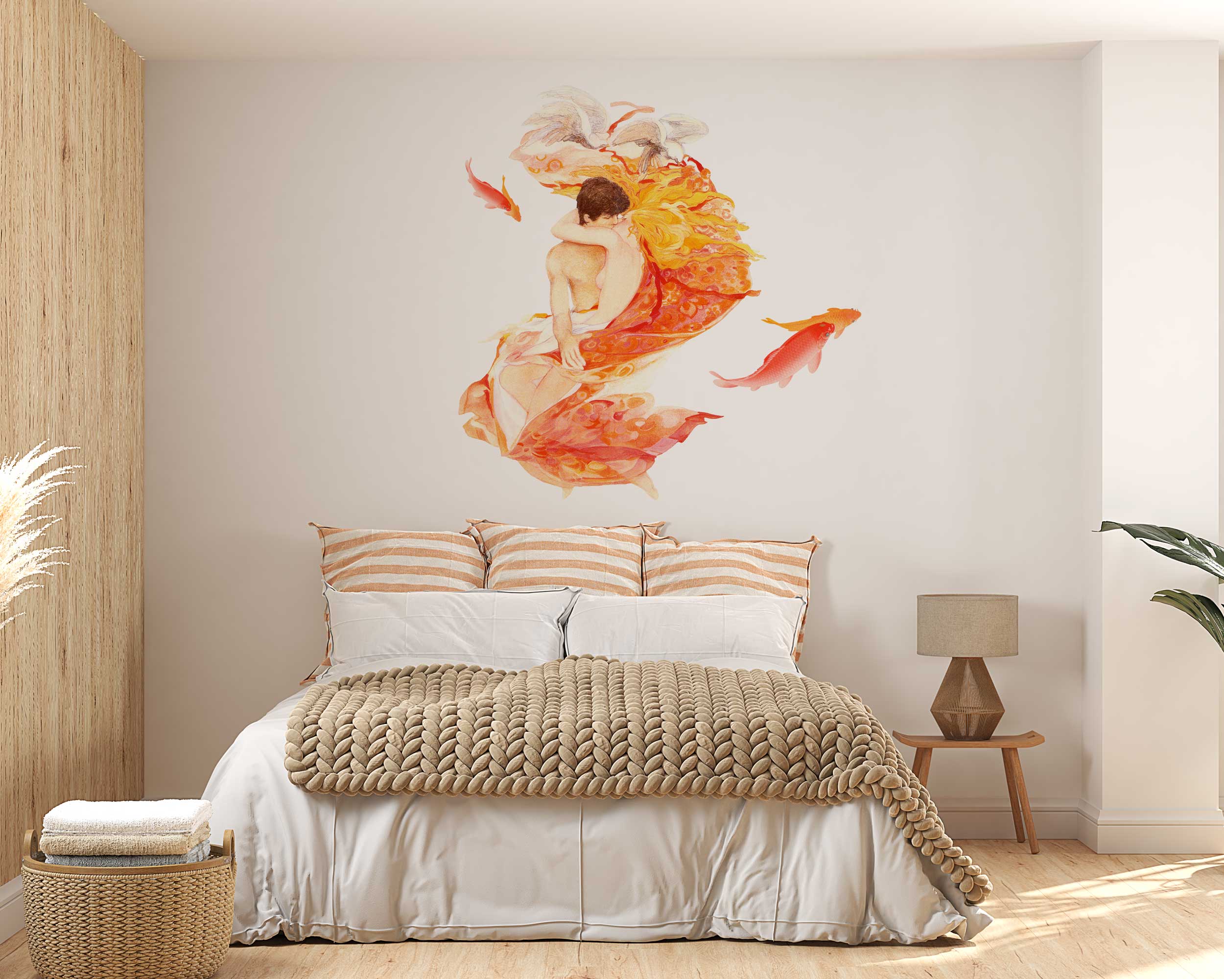 Create a dreamy and romantic atmosphere with this Romantic Couple Kissing Wall Sticker. Featuring an artistic design of an embracing couple surrounded by flowing fabric and koi fish, this decal brings a touch of passion and elegance to any space. The watercolor-inspired design blends beautifully with various decor styles, making it a perfect addition to bedrooms, living rooms, or creative spaces.