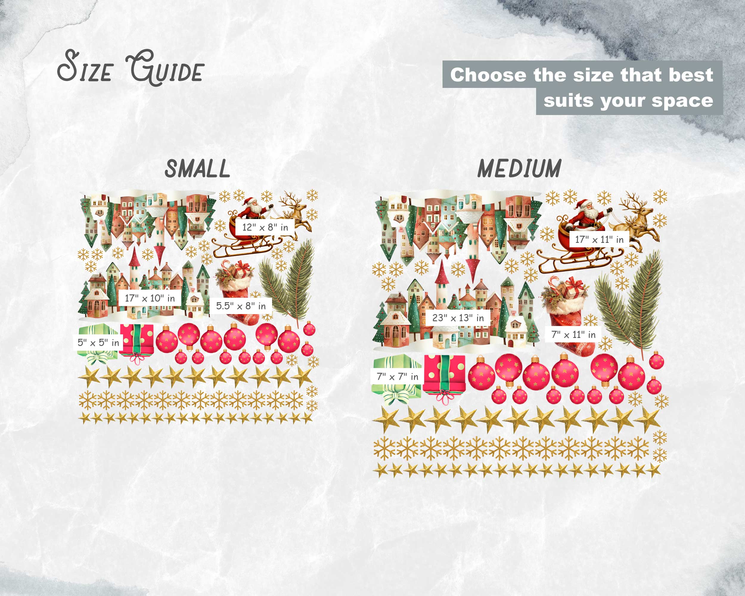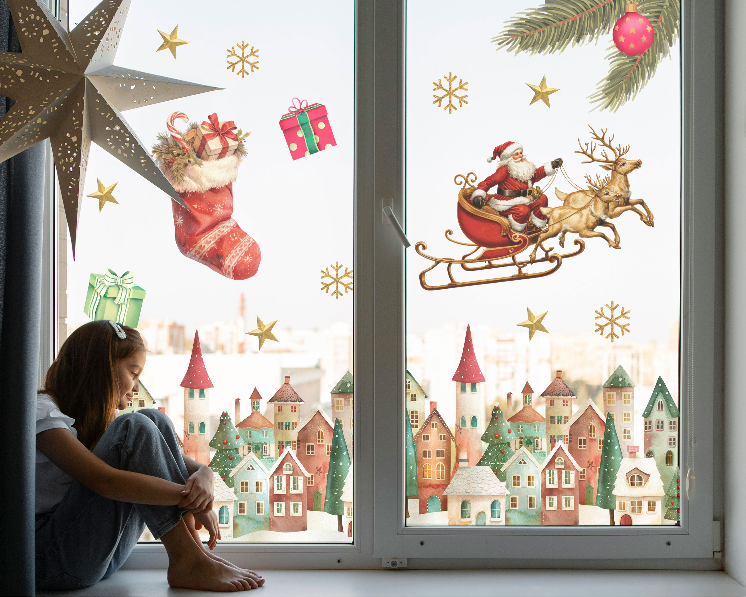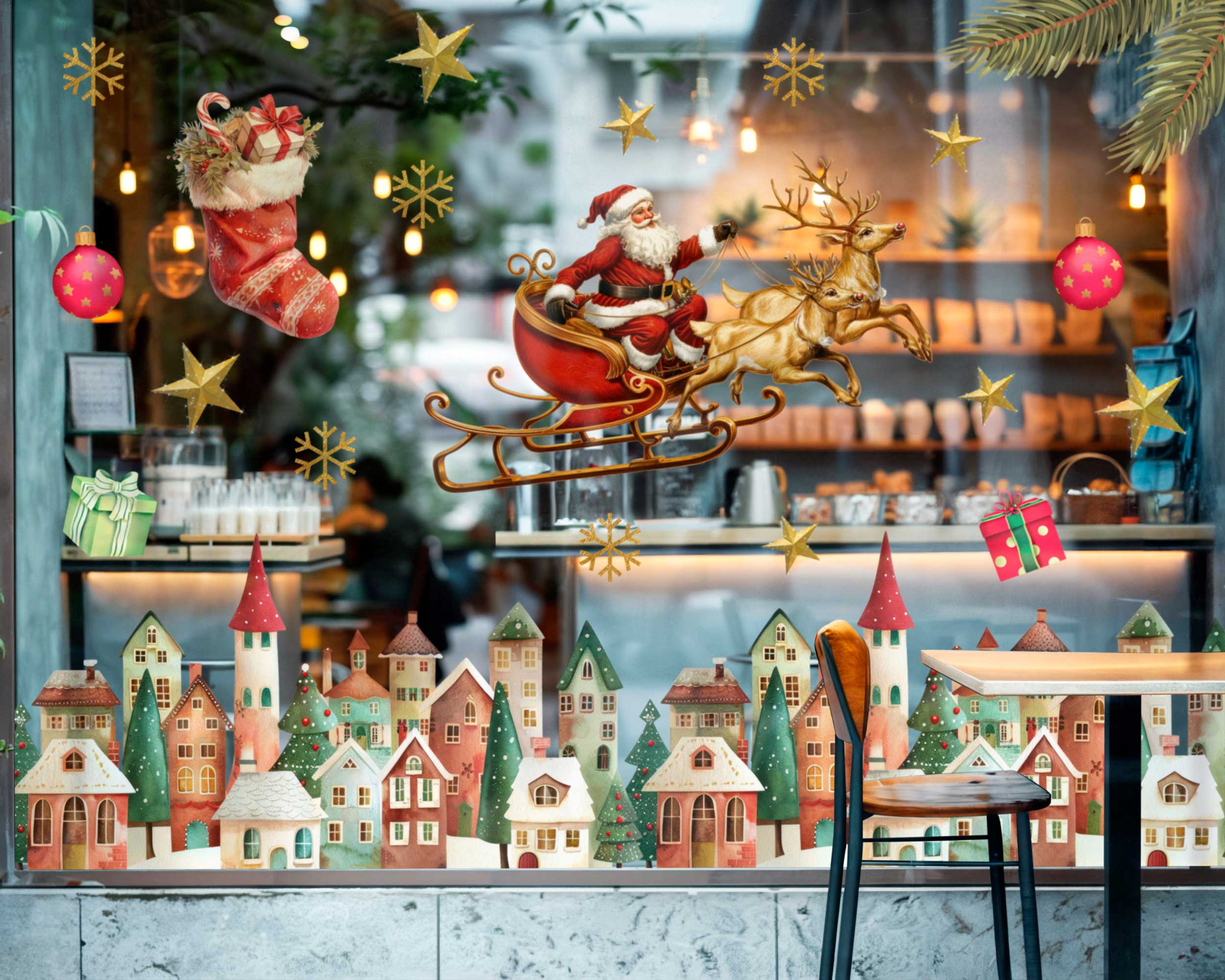 Ideal for creating a joyful Christmas atmosphere, these decals combine traditional holiday icons like Santa in his sleigh and a quaint village with playful elements like colorful gifts and stockings. Perfect for retail stores, cafés, or home decor, these decals add warmth and charm to any space.