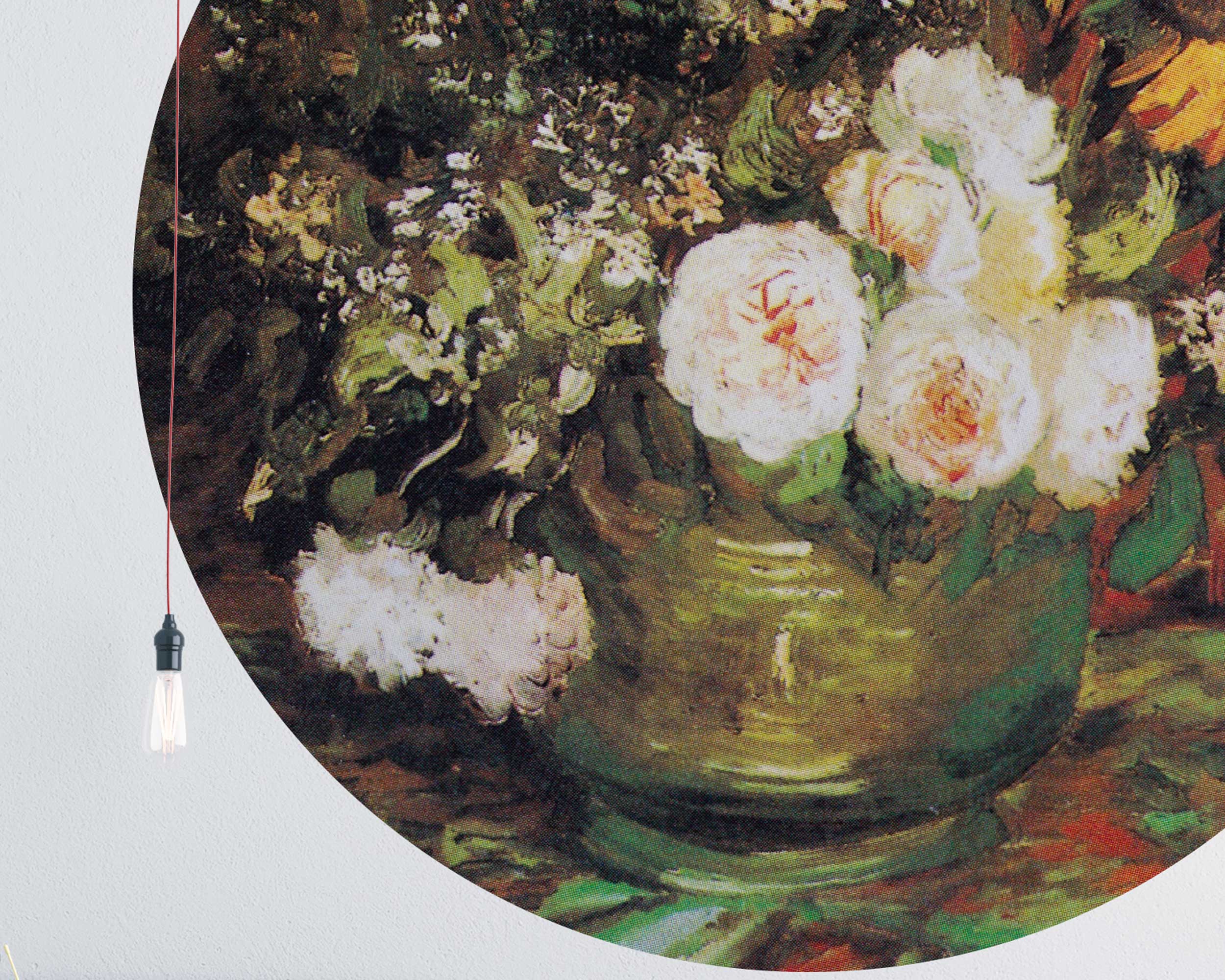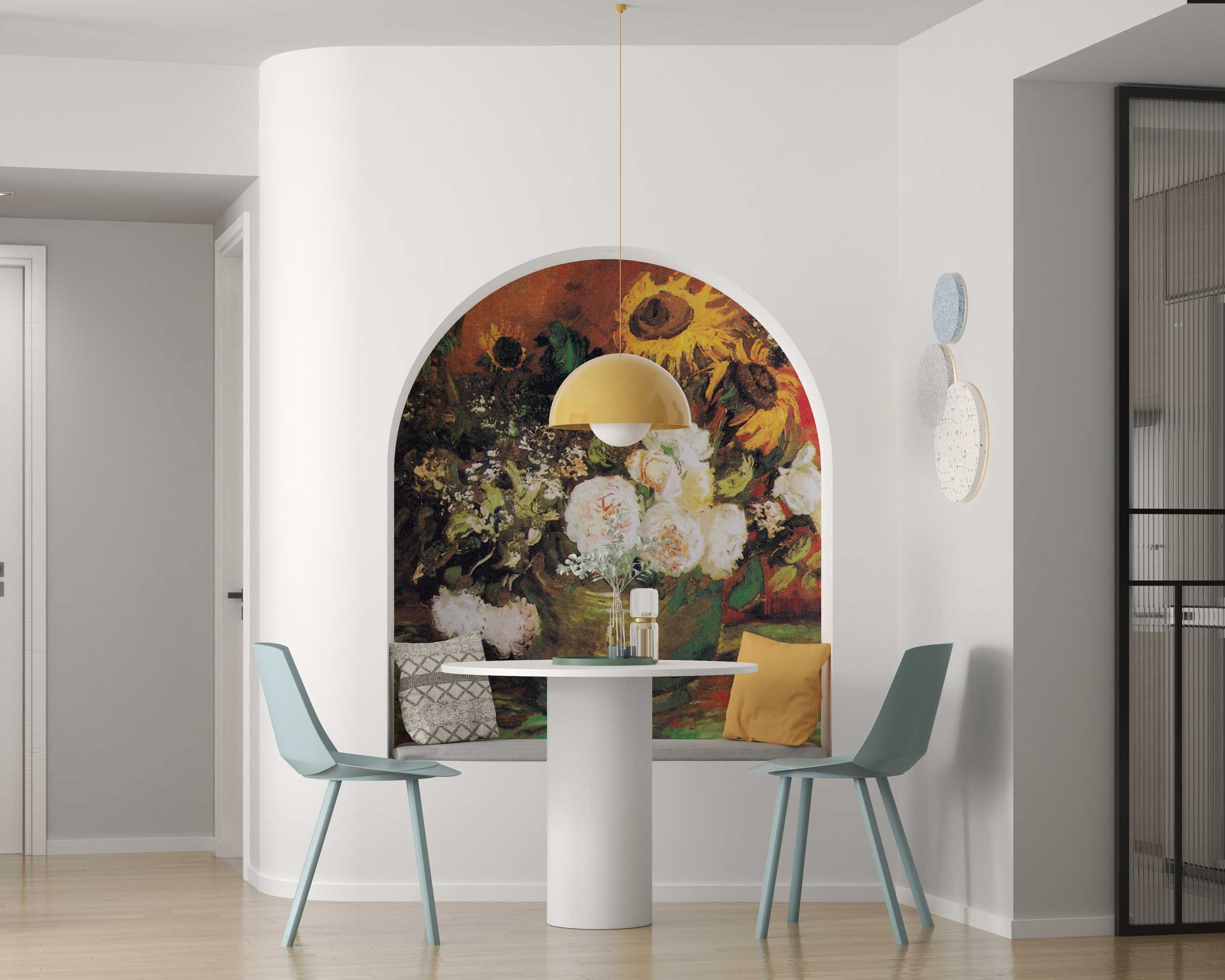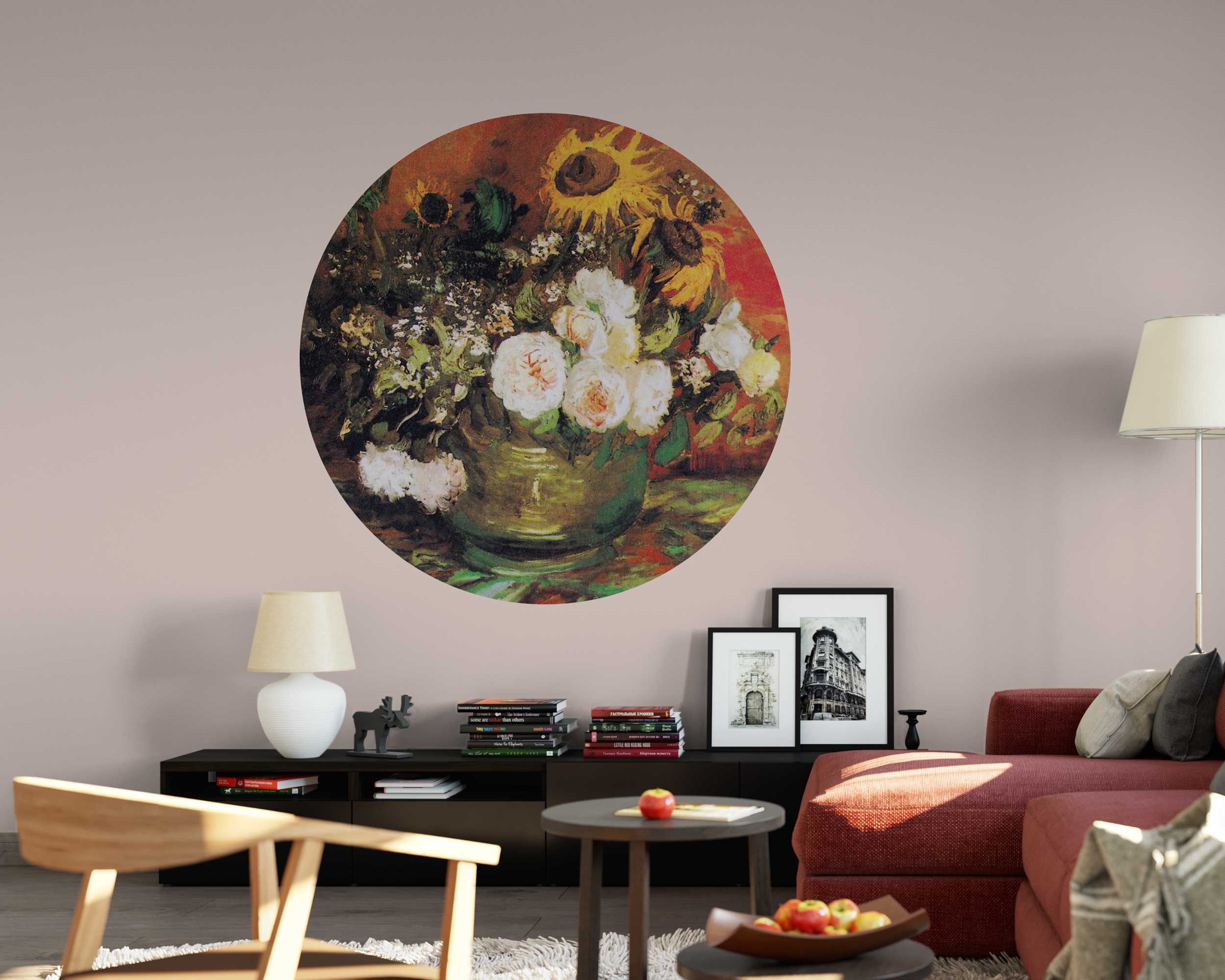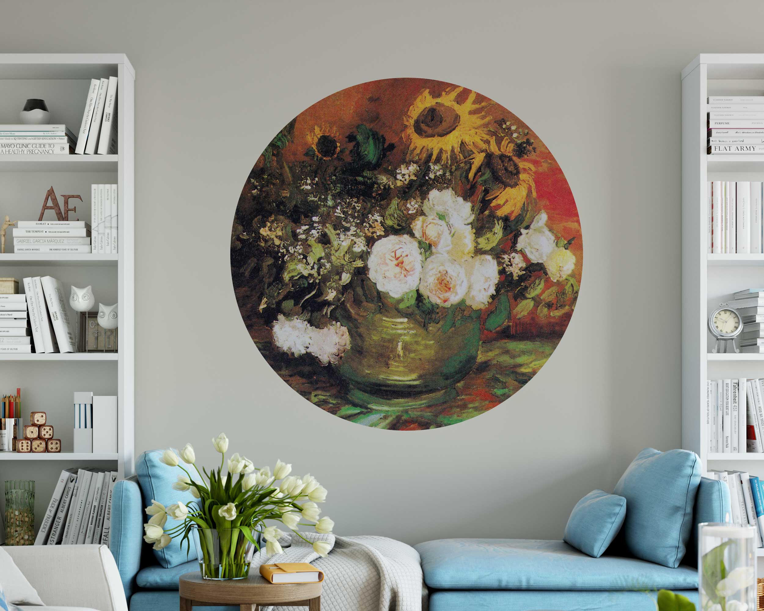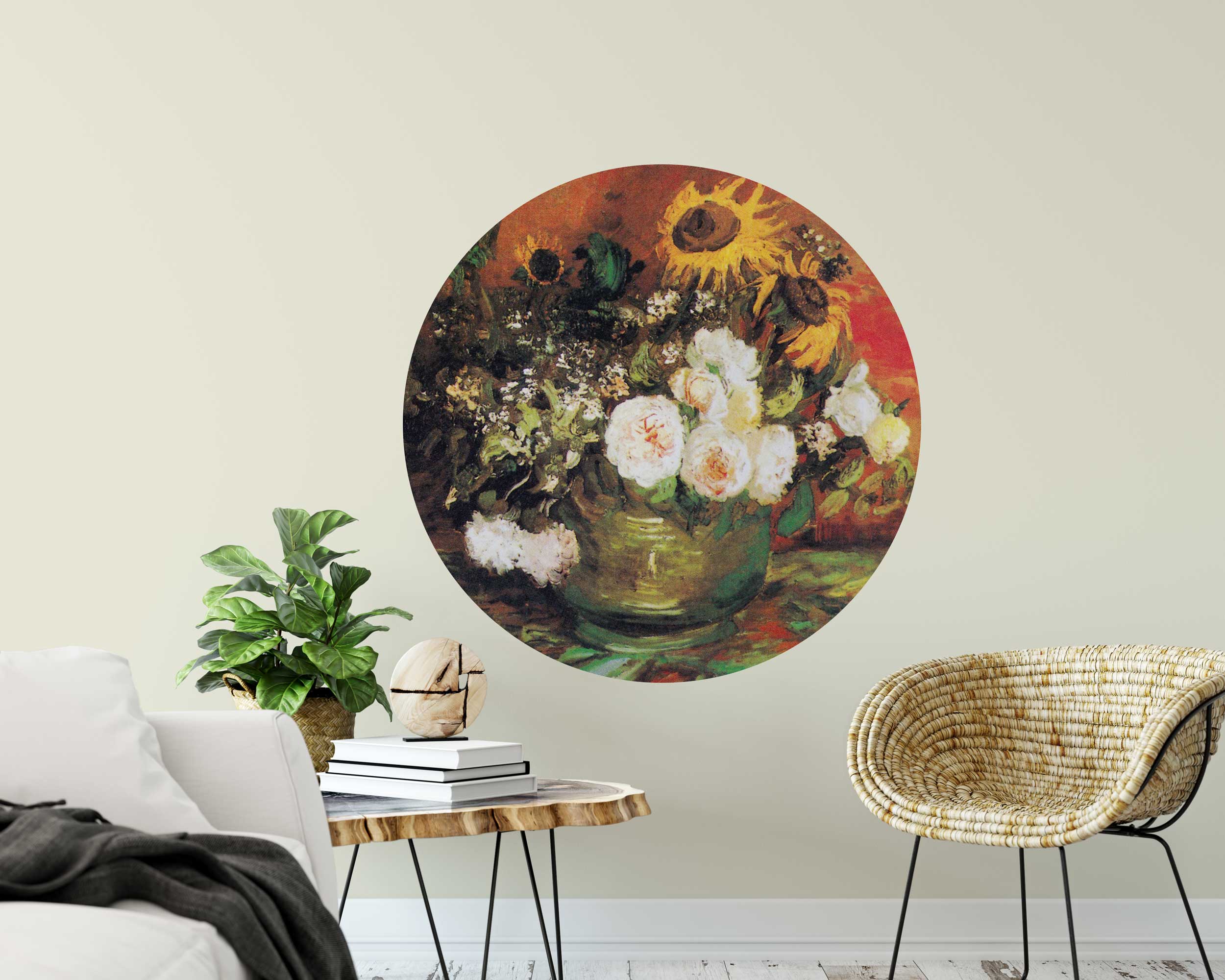 Enhance your space with the timeless beauty of Vincent van Gogh’s Bowl with Sunflowers and Roses Circle Wall Sticker. This stunning peel and stick mural showcases a rich floral arrangement of bright sunflowers and delicate roses, set against a warm, vibrant background. Inspired by van Gogh’s expressive brushstrokes, this self-adhesive wall decal brings a classic and artistic touch to your home or office.