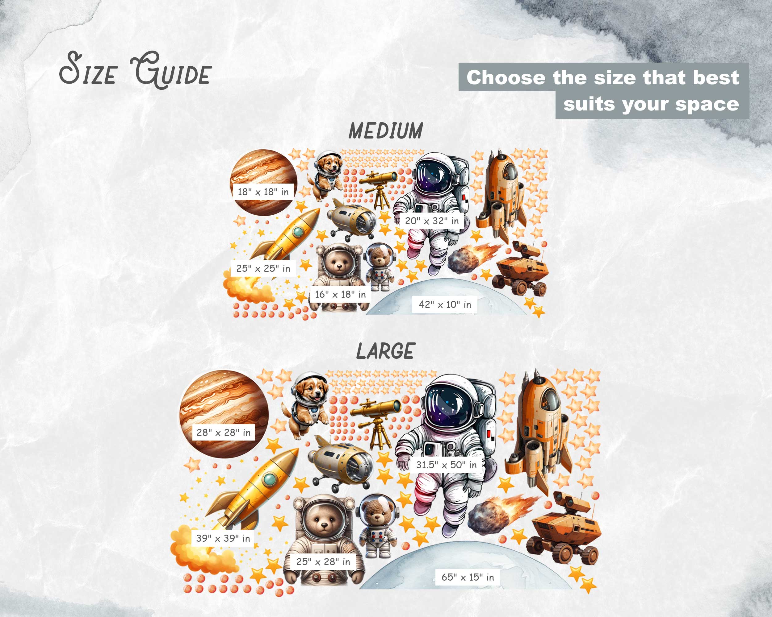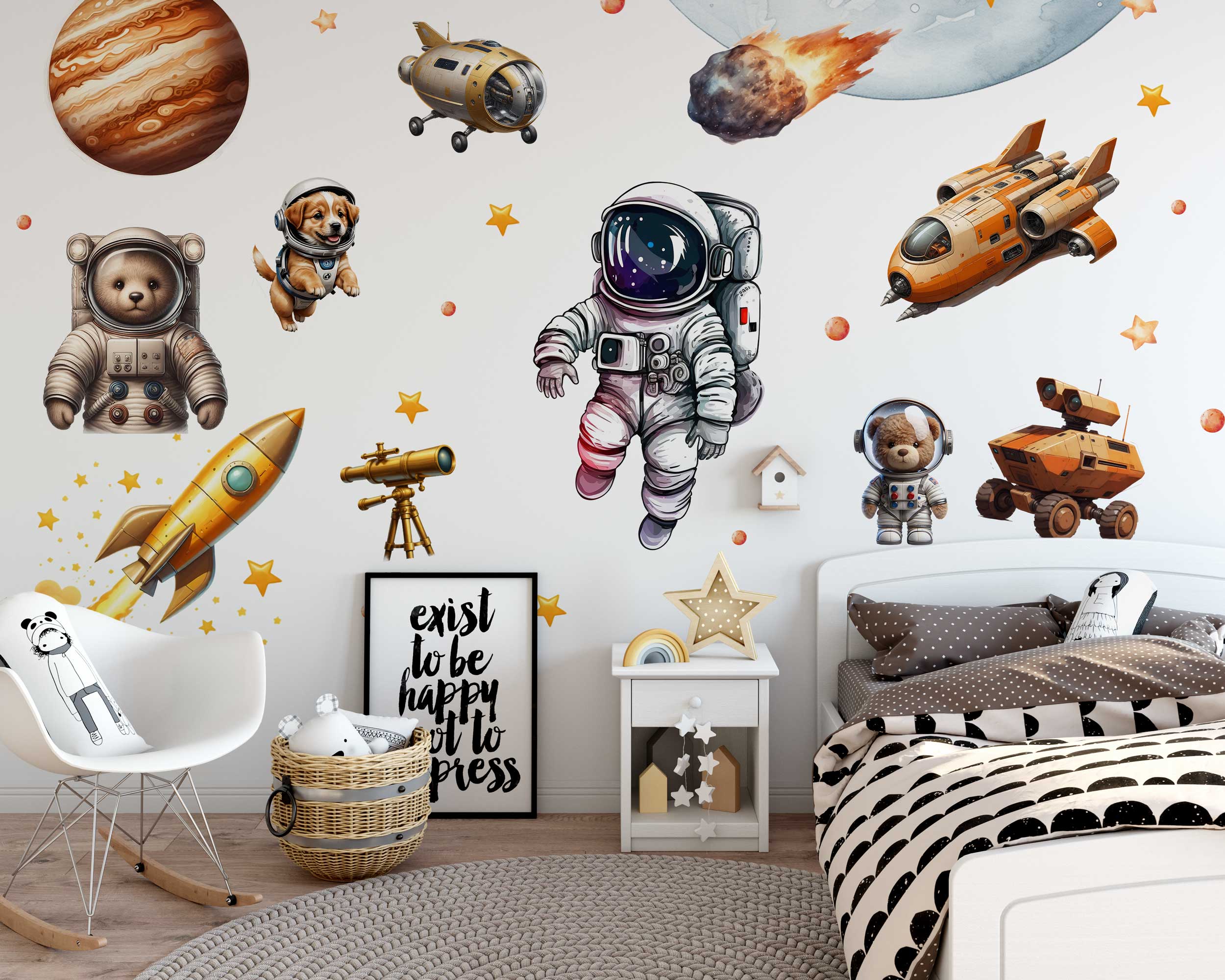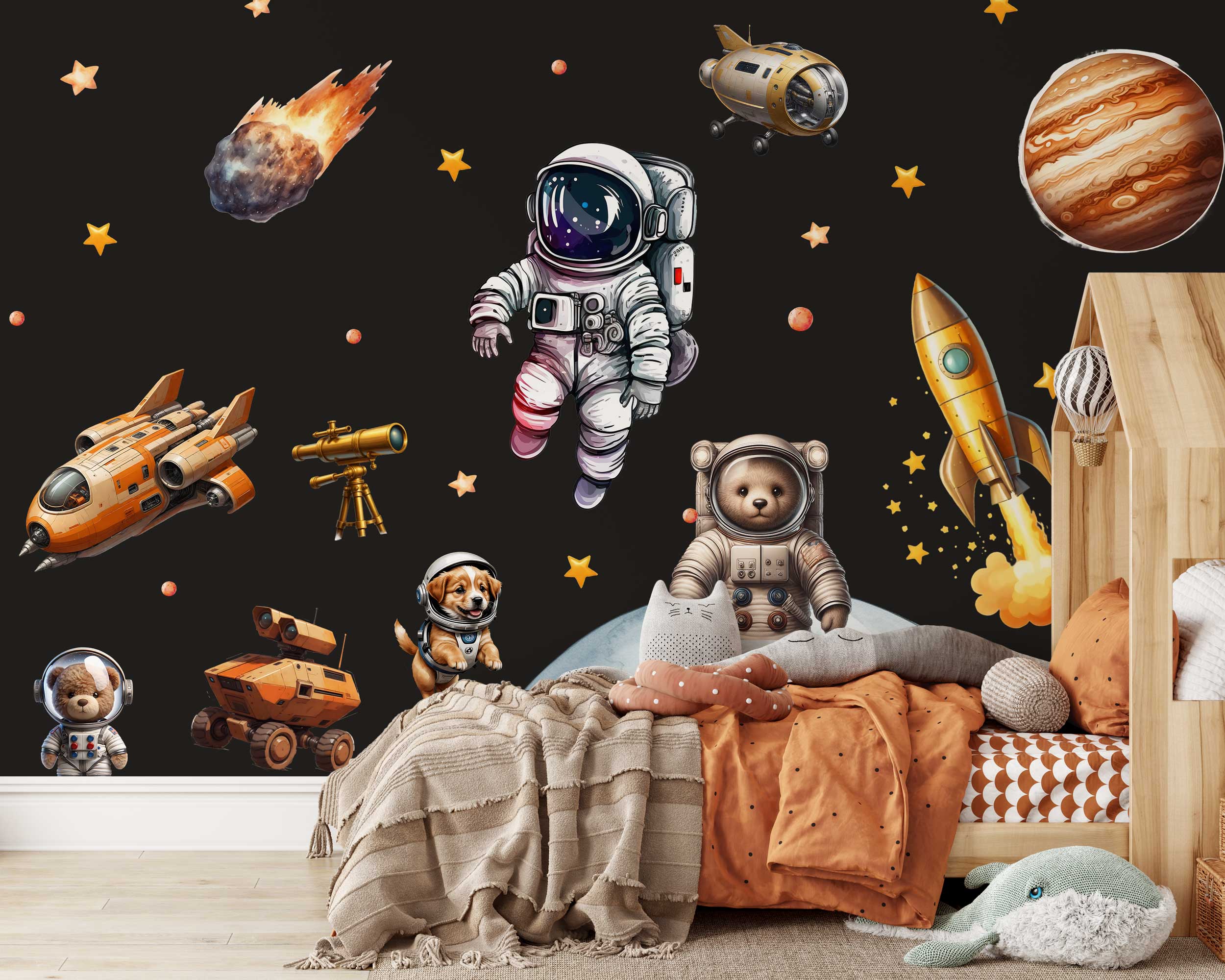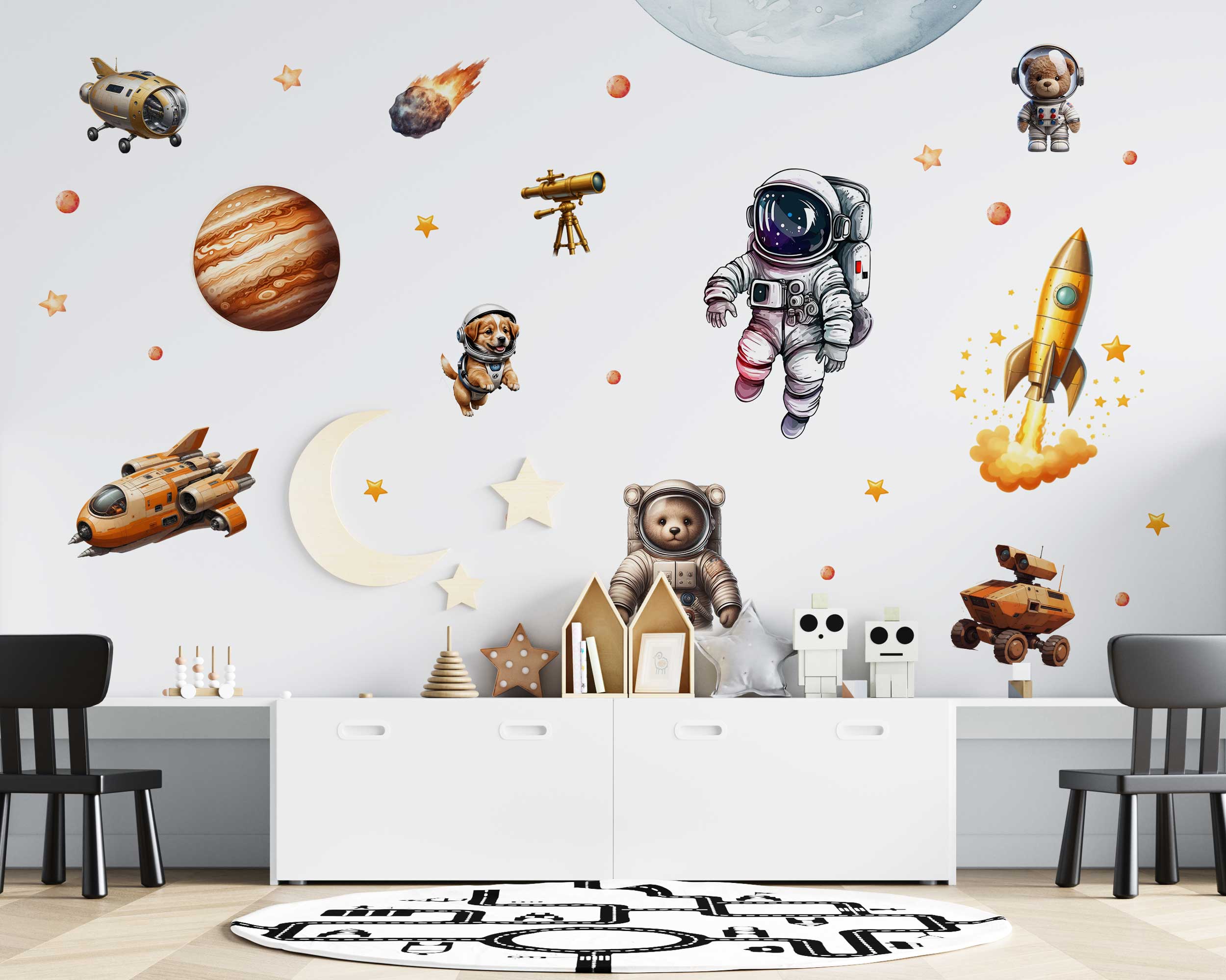 Transform your child’s room into an outer space adventure with our Watercolor Space Adventure Wall Stickers. These delightful decals feature astronauts, Mars, planets, spaceships, and cute animals, all illustrated in beautiful watercolor style. Perfect for nurseries, playrooms, and bedrooms, these wall stickers are made from premium fabric with non-toxic inks, ensuring they are safe for children and easy to apply and reposition. Turn any room into a galactic playground with these fun and playful wall decals.
