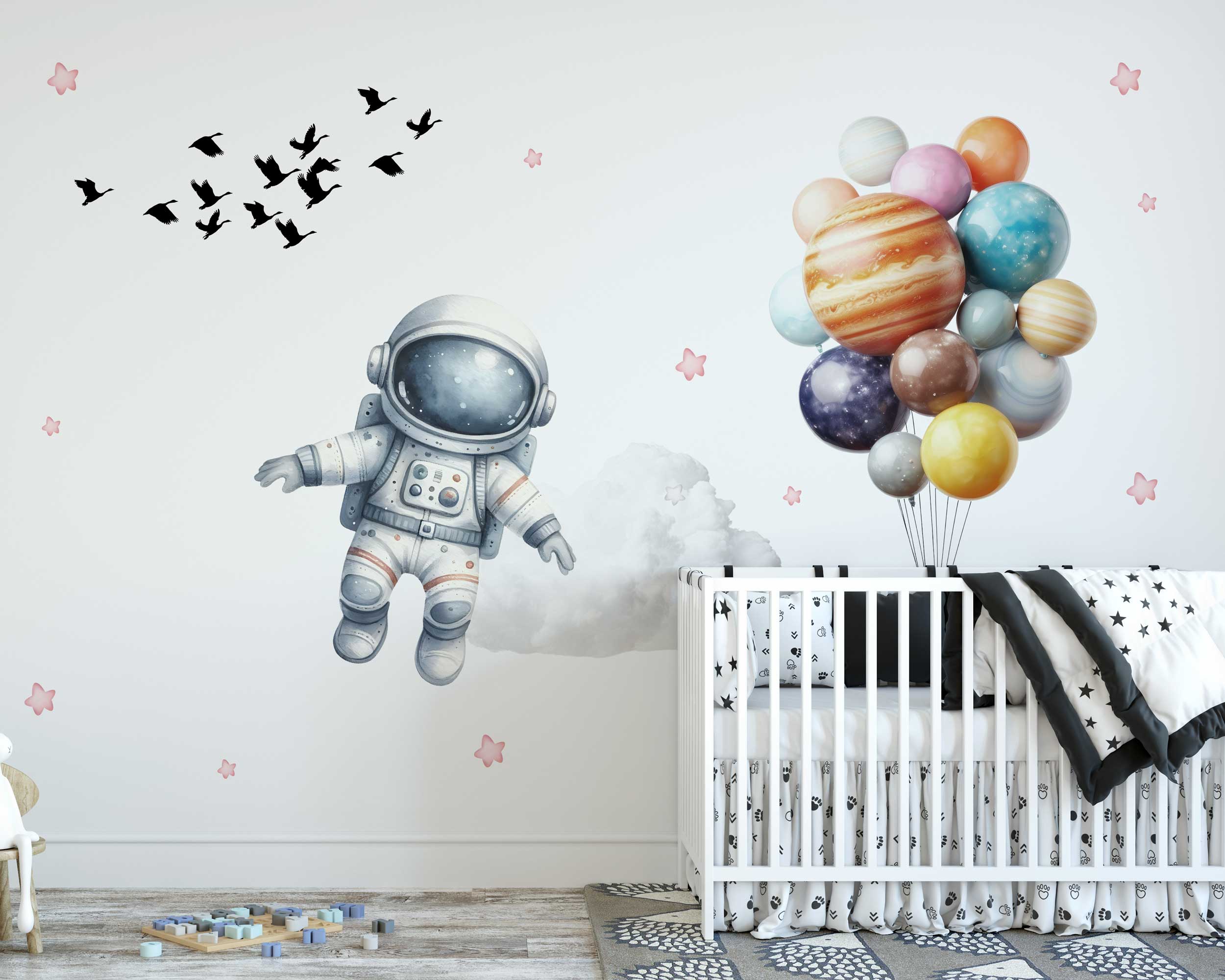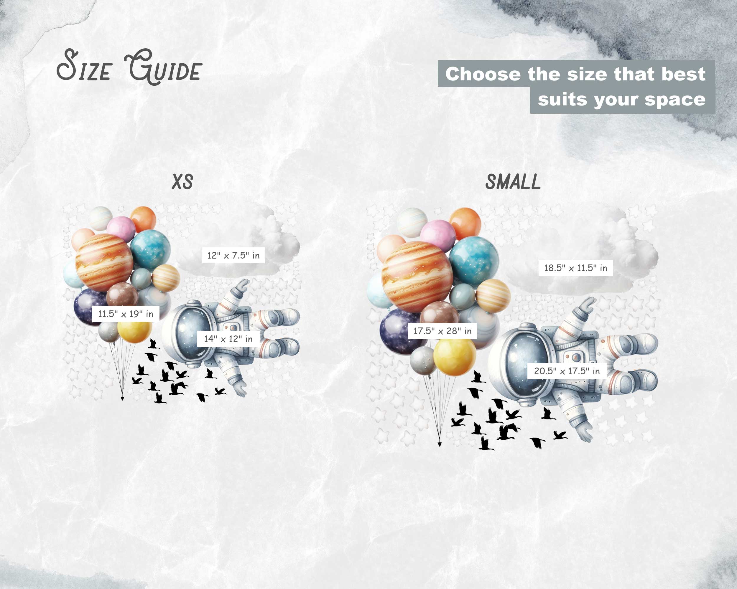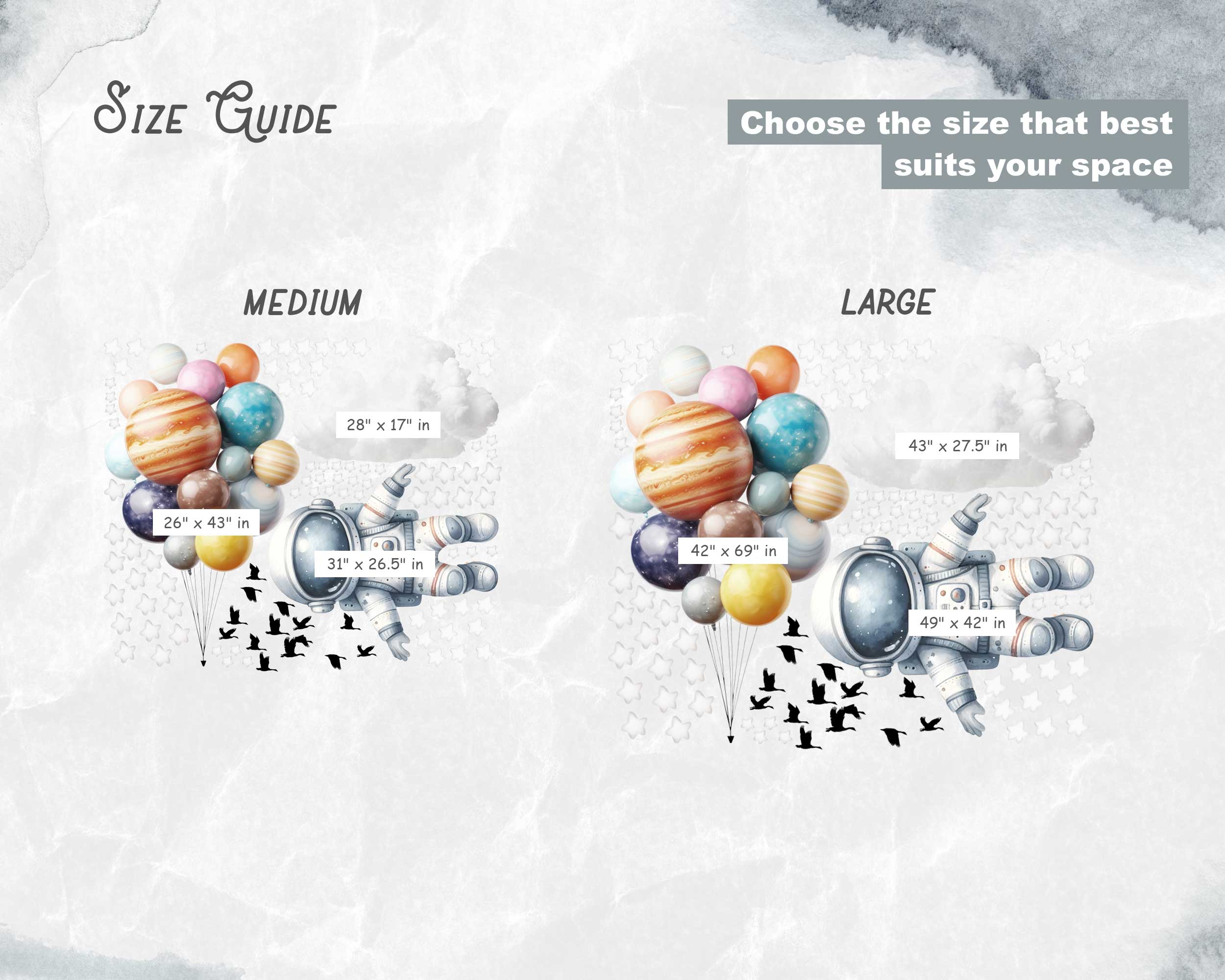 Create a magical and whimsical atmosphere in your child’s room with our Whimsical Astronaut Wall Stickers. Featuring a dreamy space theme with an astronaut holding a surreal planets balloon and surrounded by birds, these beautiful decals add an imaginative and enchanting touch to any nursery, playroom, or bedroom. Made from premium fabric with non-toxic inks, these wall stickers are safe for children and easy to apply and reposition, making them perfect for renter-friendly decor. Transform any room into a fantastical space adventure with these charming and playful wall decals.